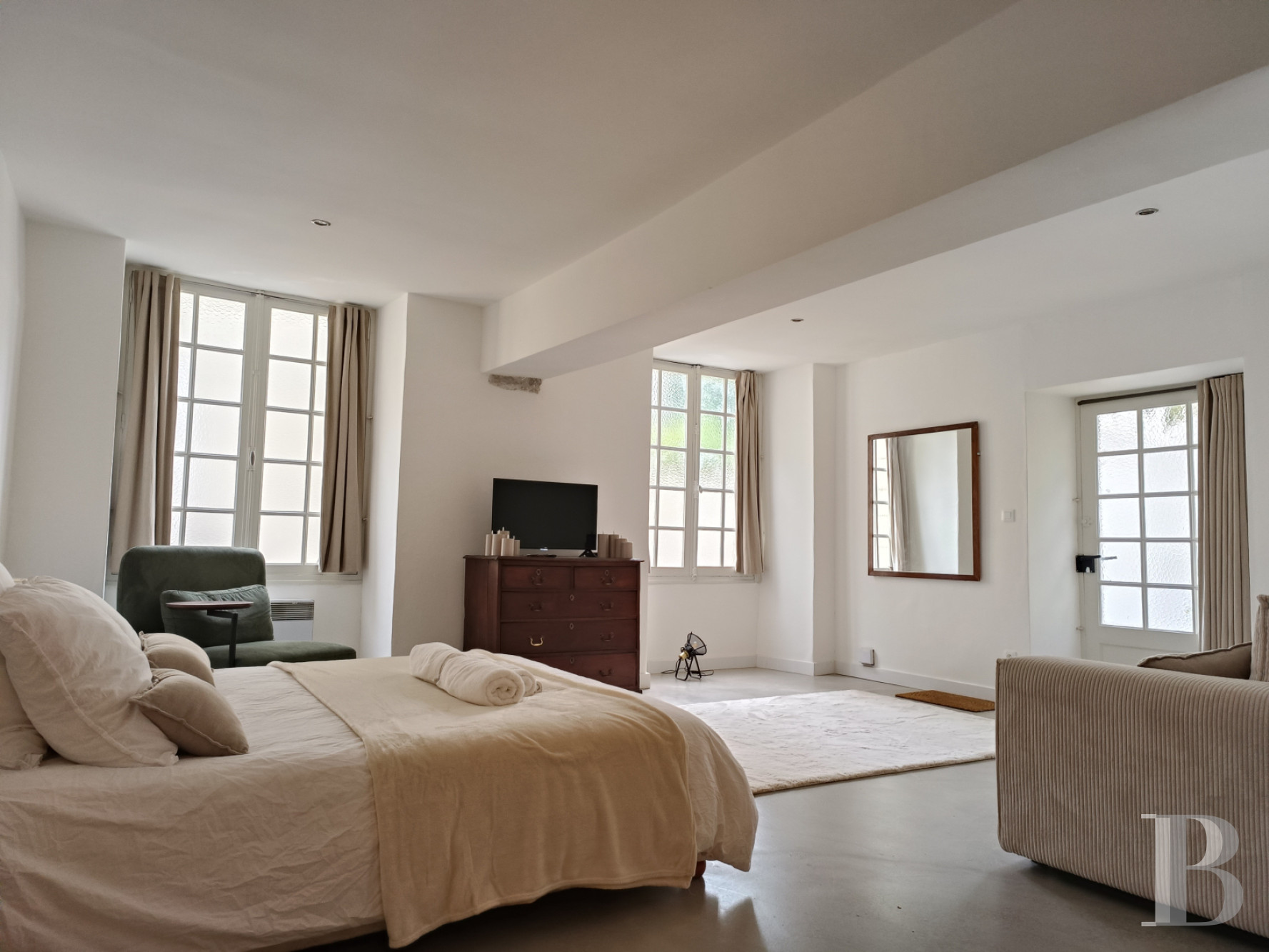 L'accès se fait par la cour. Le hall d'entrée abrite un escalier hélicoïdal en tuffeau qui mène aux étages supérieurs. L'espace est actuellement occupé par un confortable gîte mis en accessibilité PMR. Une chambre donne sur le jardin, avec une porte vers l'extérieur. Une cuisine équipée abrite une cheminée monumentale en tuffeau, restaurée avec soin, et un four à pain attenant. S'ensuit une salle de bains, équipée d'une douche et d'un espace balnéothérapie. Les sols alternent entre le béton ciré et les tomettes. Les pièces à vivre sont tournées vers la rue et la cour. La location du gîte rapporte chaque année environ 12 000 euros.