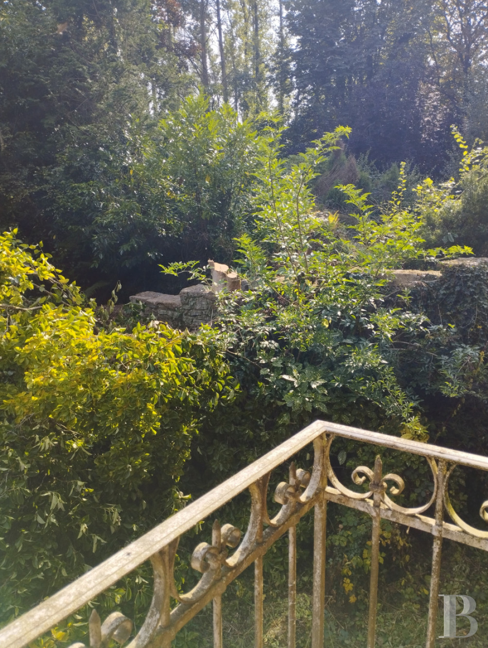 L'ensemble du parc, de bonne dimension, est boisé et vallonné. Les abords du moulin et des dépendances sont jalonnés d'arbustes et d'hortensias. Un ruisseau coule et traverse la propriété. La taille du terrain, suffisamment vaste, permet de rester à l'abri des regards.