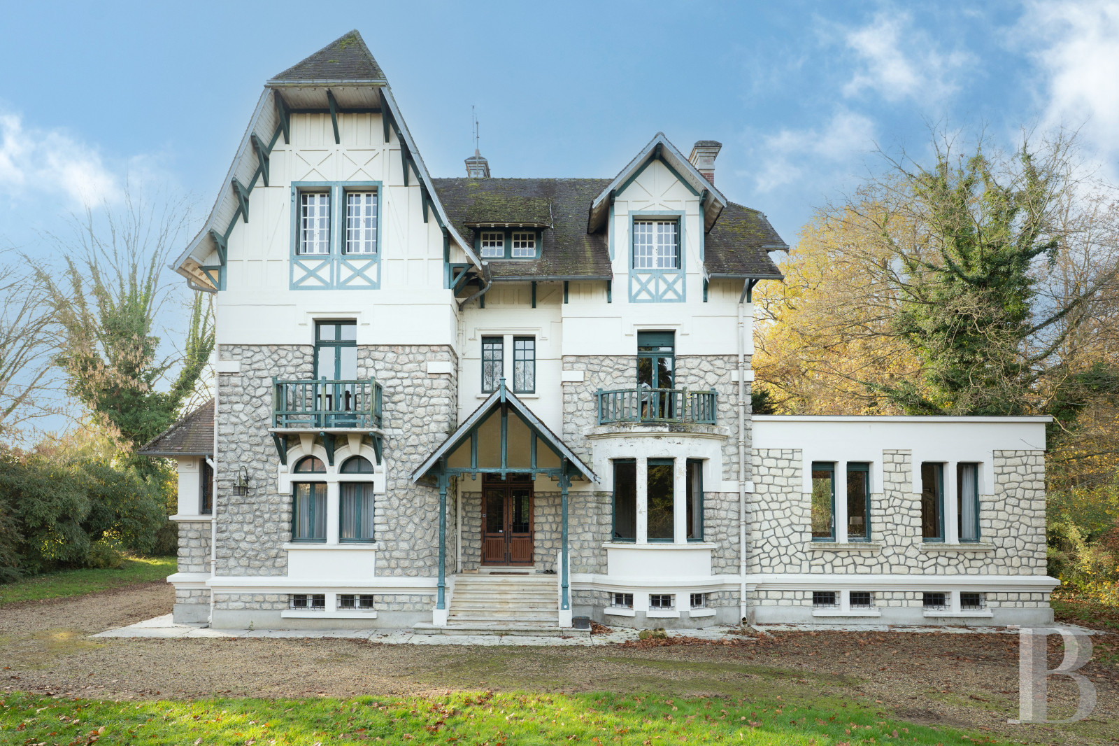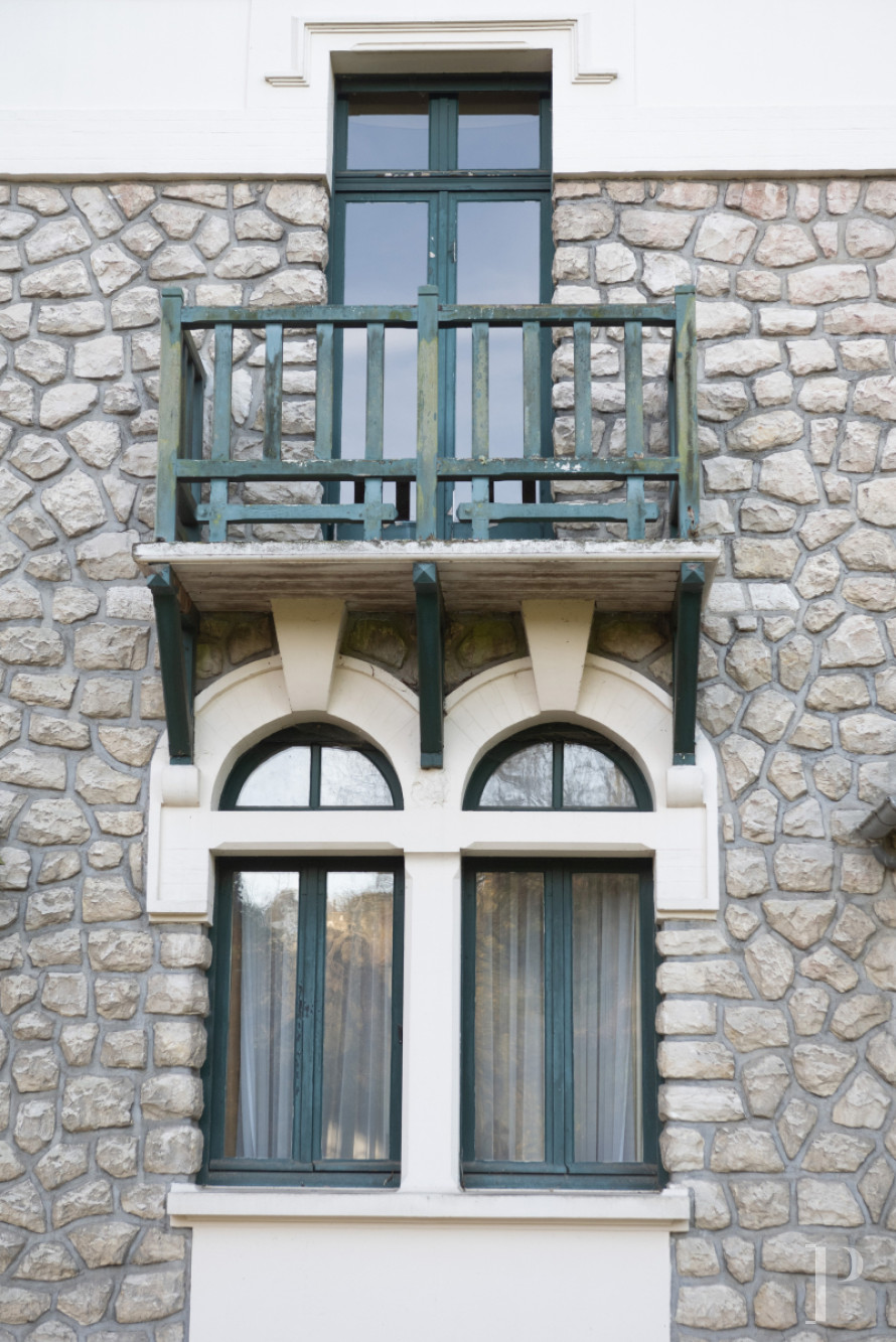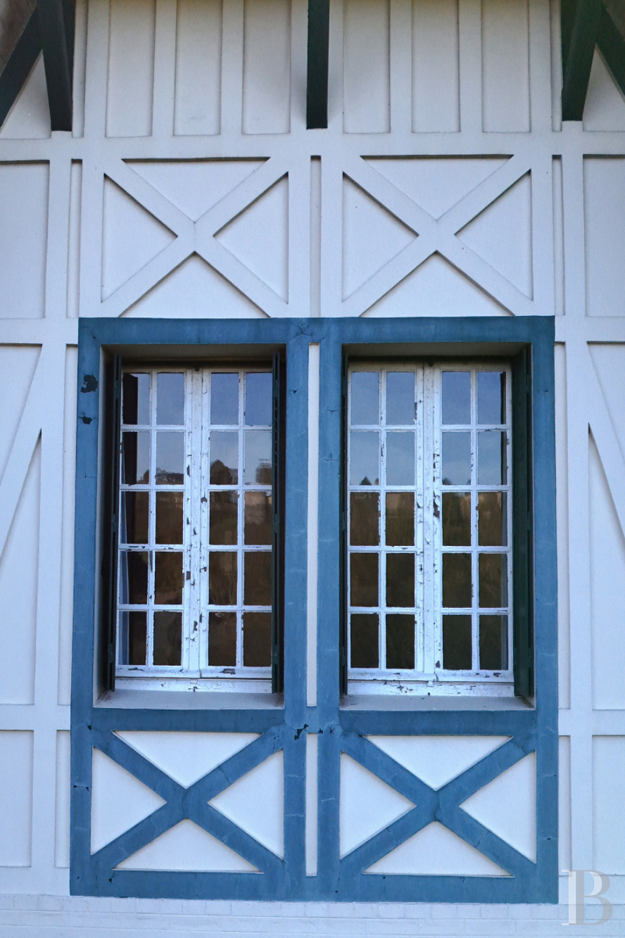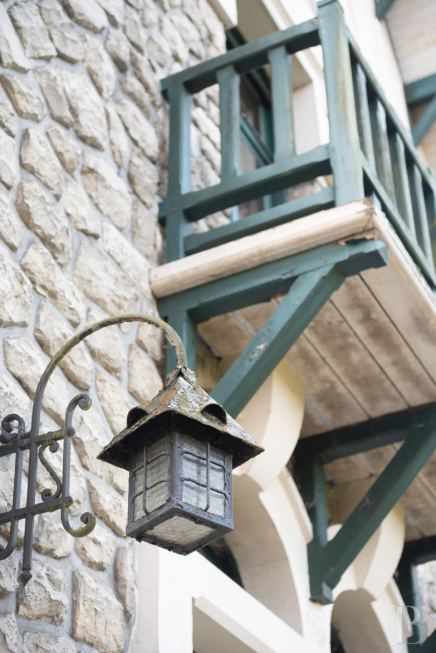 Édifiée en 1920, la maison mêle l’inspiration anglo-normande aux accents Art déco. Les façades combinent un soubassement en pierre de taille à un enduit clair structuré par des pans de bois peints en bleu vert. Les fenêtres à petits carreaux sont ponctuellement soulignées d’un décor géométrique dont les lignes symétriques apportent une touche graphique caractéristique de la période.