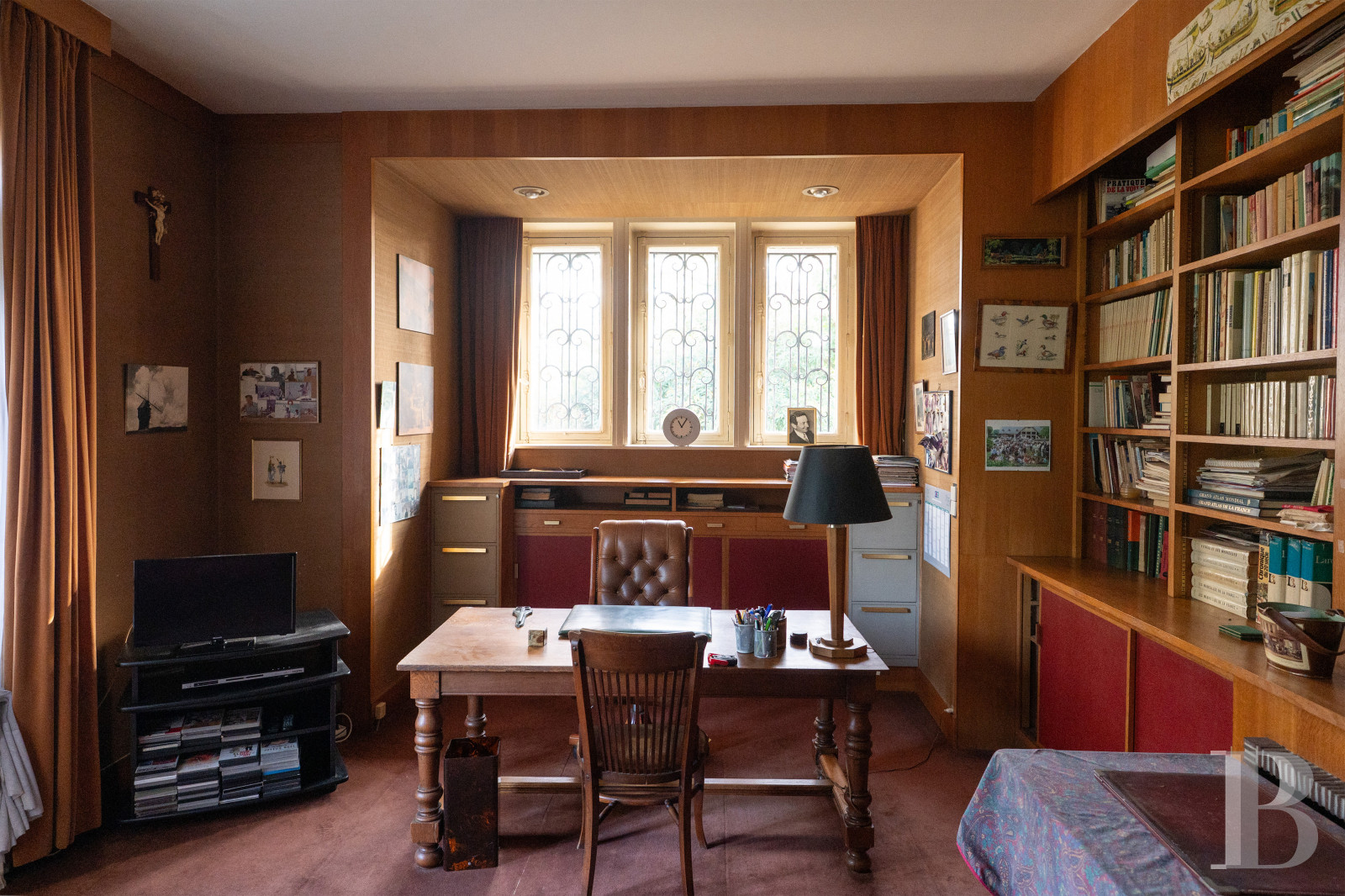 Un perron en pierre conduit à une porte à double battant en bois massif, décorée de ferronneries et d’une imposte vitrée. Derrière celle-ci, un hall d’entrée au carrelage clair à cabochons noirs distribue les différentes pièces du rez-de-chaussée. Il est prolongé par un vaste espace de rangement à portes en miroir qui dissimule un accès vers l’arrière du niveau. À gauche, une première porte s’ouvre sur un vaste bureau, dont la fenêtre triple en niche, procure un panorama sur le parc. De grandes bibliothèques intégrées occupent tout un mur, et une cheminée de style Art déco s’ajoute à la pièce.