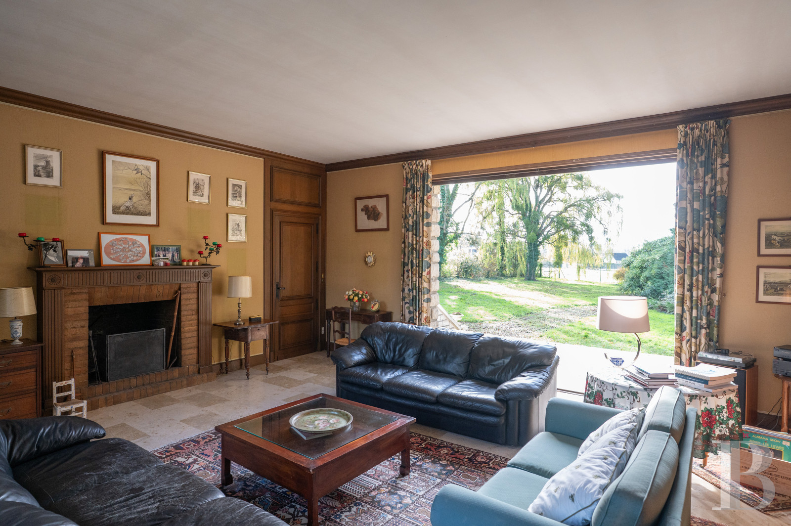 Dans le petit salon, un second passage conduit au grand salon, pièce de réception aux vastes dimensions ouverte sur le jardin et la terrasse par d’amples baies vitrées d’un côté et par deux fenêtres de l’autre. Une cheminée à manteau de bois et contrecœur en brique habille l’espace.