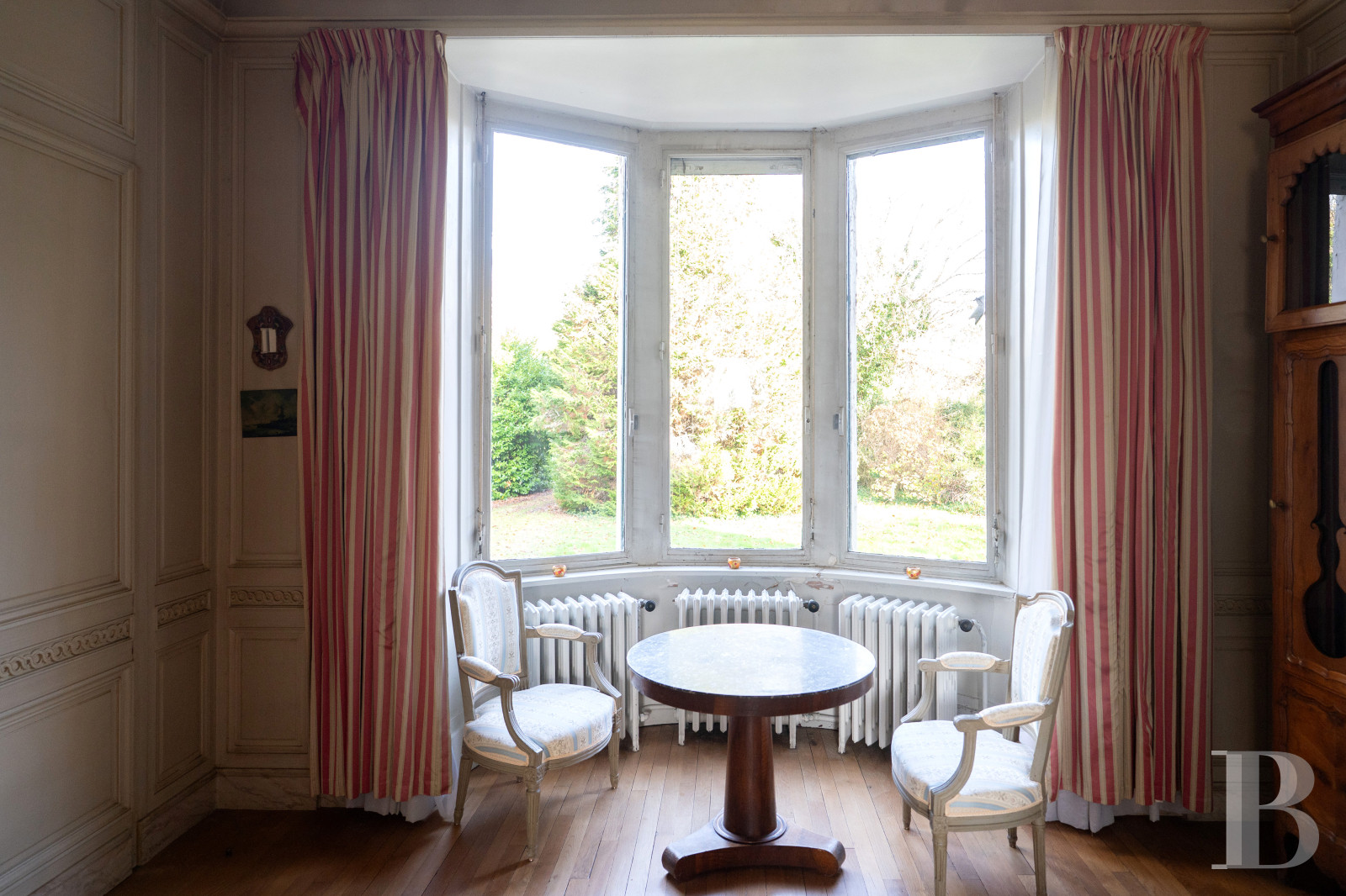 En face de celle-ci, un petit salon installé dans une rotonde est éclairé par trois hautes fenêtres orientées vers le jardin. Une porte à deux battants ouvre ensuite sur une salle à manger au sol en parquet à lames droites, qui profite d’une abondante luminosité grâce à une grande baie donnant sur la perspective du parc.