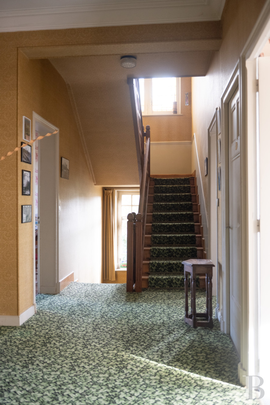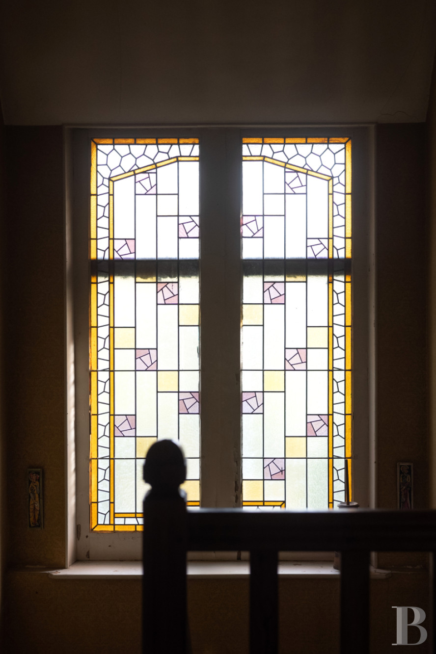 L’escalier se poursuit et débouche sur un palier intermédiaire éclairé par un vitrail de style Art déco, dont les motifs géométriques diffusent une lumière tamisée sur la cage d’escalier. Enfin, le palier du deuxième étage distribue les pièces sous les combles ainsi que des chambres supplémentaires.