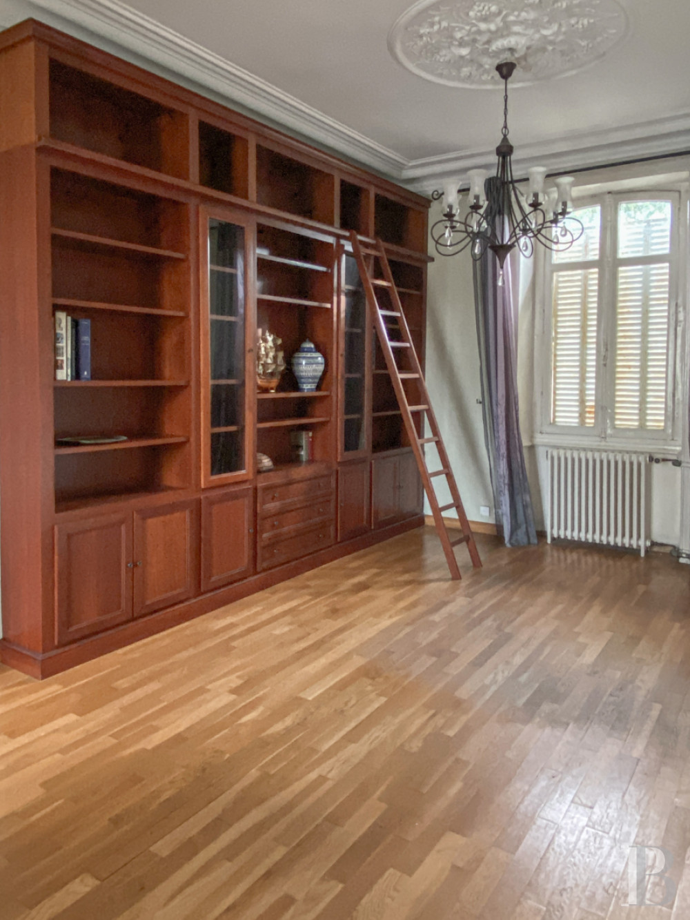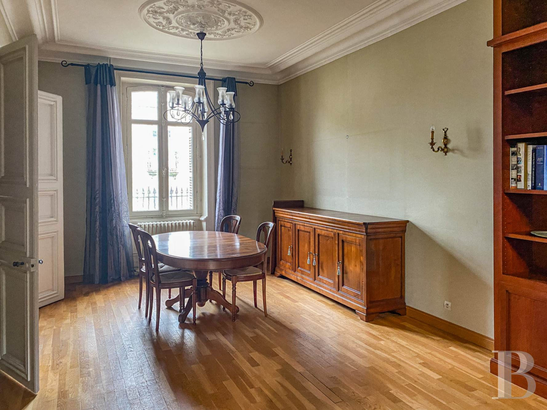 Depuis la rue, la double porte en bois sculpté ouvre sur un premier hall carrelé, naturellement éclairé par l'imposte vitrée. Sur un côté, une grande double porte invite à découvrir la salle de séjour. De l'autre, un passage conduit à un bureau. En face, dans l'axe de l'entrée, un second hall s'étend en enfilade. Le bureau, ouvert sur la rue par une haute baie, pourrait aussi servir de vestibule. Le plafond est orné d'une petite rosace et encadré de moulures périphériques. La salle de séjour et la salle à manger forment une vaste pièce traversante au parquet massif à lames droites. Deux grandes rosaces ornent le plafond, l'une au-dessus de chaque partie de la pièce. Des corniches moulurées structurent les deux espaces.Depuis le second hall, côté sud, un escalier remarquable en granit gris s'élève vers les étages. Son garde-corps en fer forgé noir est orné de bagues dorées, dans un esprit néo-classique. Le départ de l'escalier dessine une volute élégante. Une main courante en bois verni accompagne la montée. Une porte vitrée laisse entrer la lumière et permet de rejoindre le jardin arrière par l'escalier monumental extérieur en pierre. Une cuisine aménagée est installée en vis-à-vis de la salle de séjour. Un escalier secondaire la relie au rez-de-jardin.
