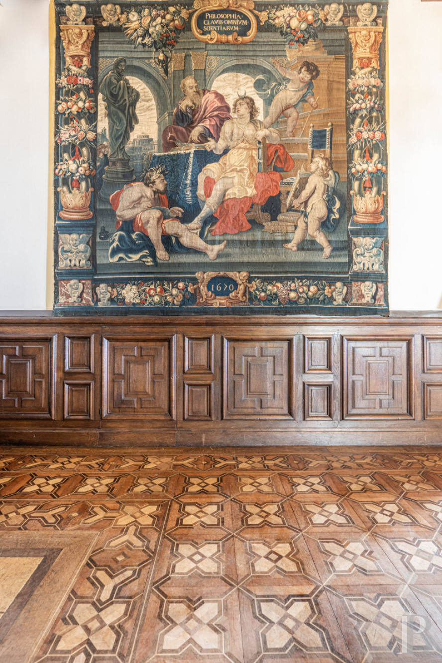 Il est composé d'un appartement indépendant, ainsi que de six chambres à coucher de superficies variables, de 25 à 70 m², chacune associée à une salle de bain privative. Il comprend également une grande salle de réception, qui présente une cheminée monumentale datant probablement de la fin du 15e s., avec jambages de pierre en colonnettes, hotte droite ornée de détails néo-gothiques flamboyant en accolade, soufflets et mouchets. Une bibliothèque meublée avec des éléments en bois massif et quatre petits salons complètent l'espace. Reprenant les codes de celles du rez-de-chaussée, les pièces de ce niveau mêlent pierre de taille et bois sculpté.