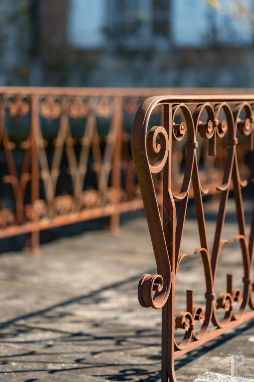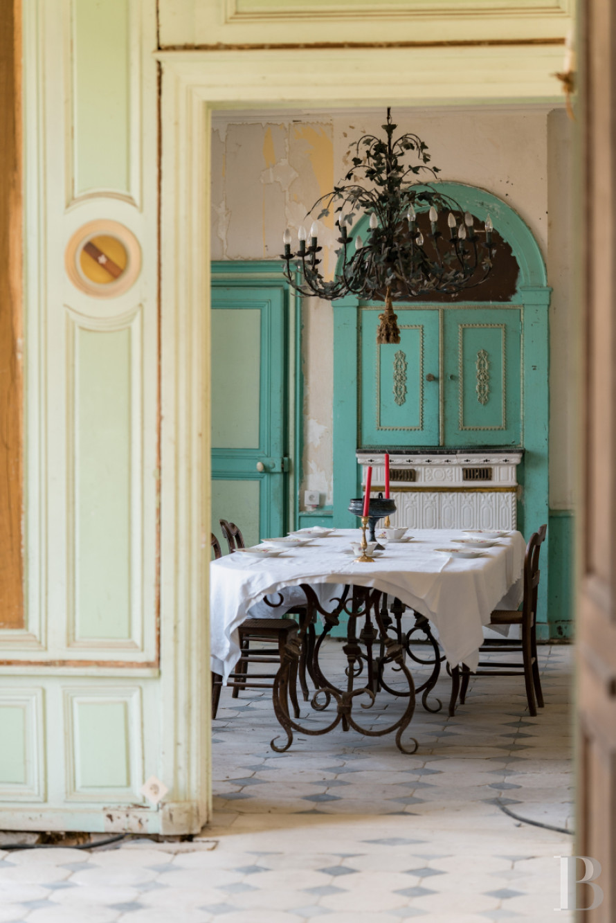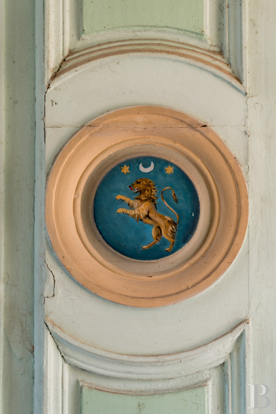 Le rez-de-chausséeUne entrée traversante recouverte d'un sol à cabochons, un escalier en bois pourvu d'une rampe de fer forgé ouvragé conduit à l'étage. La cage d'escalier est ornée d'une tapisserie aux initiales des commanditaires du château. Un vestibule saisissant par son décor de boiseries serties de petits médaillons peints. Une double porte en chêne ouvre sur un premier salon équipé d'une cheminée en marbre à foyer ouvert, surmontée d'un miroir. Des panneaux à grands cadres, des moulures finement ciselées, une alcôve ornée de coquilles en ses extrémités et un parquet en point de Hongrie subliment les lieux. Un second salon est équipé d'une cheminée de marbre surmontée d'un trumeau peint d'une scène bucolique. Les deux salons, traversants, disposent de volets intérieurs. Depuis le vestibule, un accès mène vers la salle à manger baignée de lumière, équipée d'un poêle autrichien niché sous une alcôve entre deux ouvertures. Le sol reprend les mêmes codes que l'entrée. Deux encoignures sont installées à chaque extrémité de la pièce et abritent des rangements. Attenant, un fumoir orné de boiseries d'origine et d'un parquet Versailles. Une porte en bois ouvre sur un escalier en pierre qui descend à la cave où se dresse un petit oratoire.De retour dans la salle à manger, lambris d'appuis, rosace centrale, décors floraux peints apportent une note joyeuse à l'ensemble. Une porte ouvre sur une cuisine aménagée, recouverte d'un dallage en pierre de Bourgogne et rehaussée d'un plafond à la française. Une console en marbre surmontée de plusieurs étagères valorisent la vaisselle d'origine. À proximité se tient une ancienne salle de chasse avec poutres de plafond apparentes, sol à cabochons noirs et blancs et cheminée en pierre. Face au foyer, une console en marbre fait son plus bel effet. Un escalier à balustres en bois de chêne avec main courante monte à l'étage.