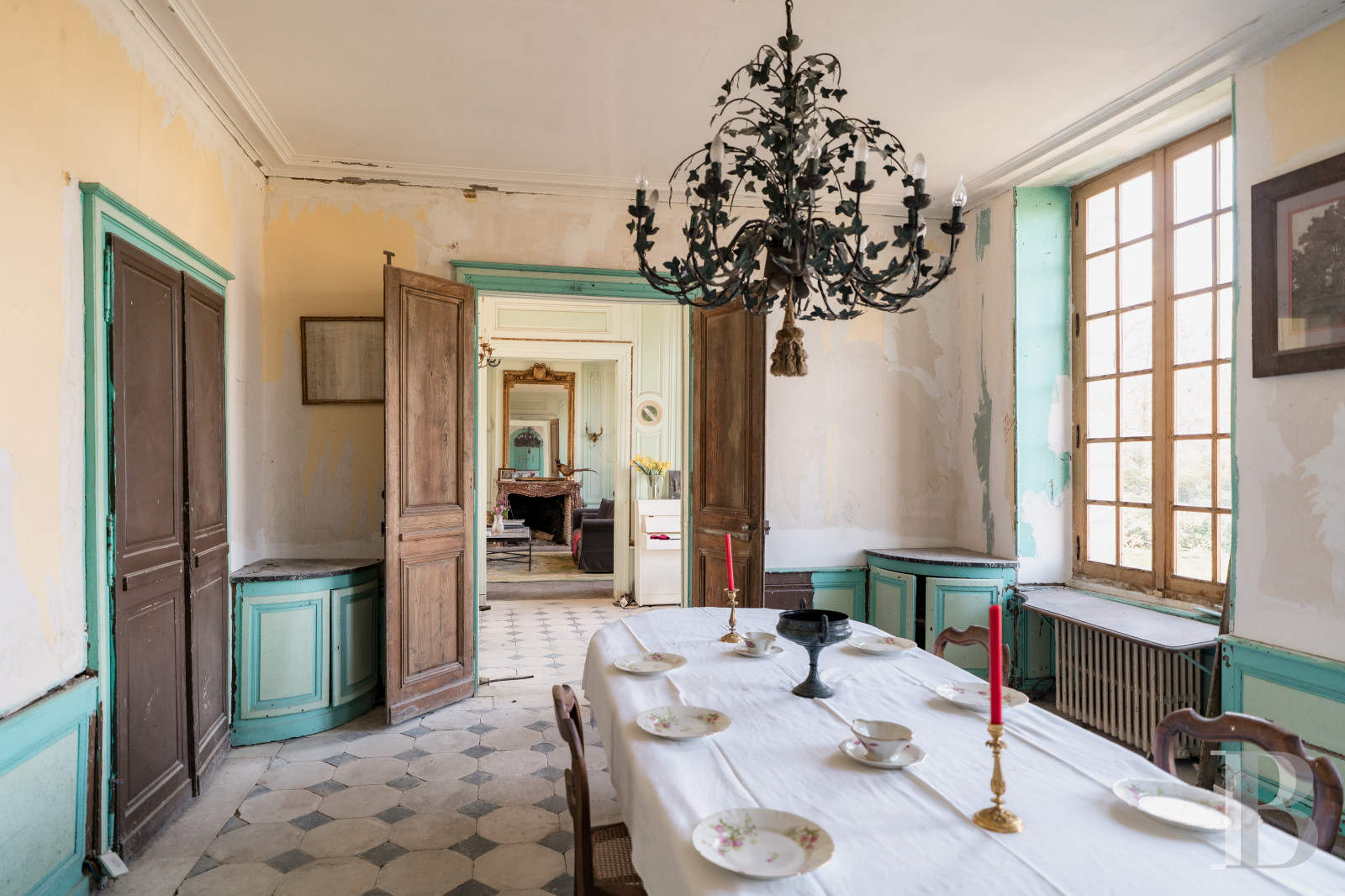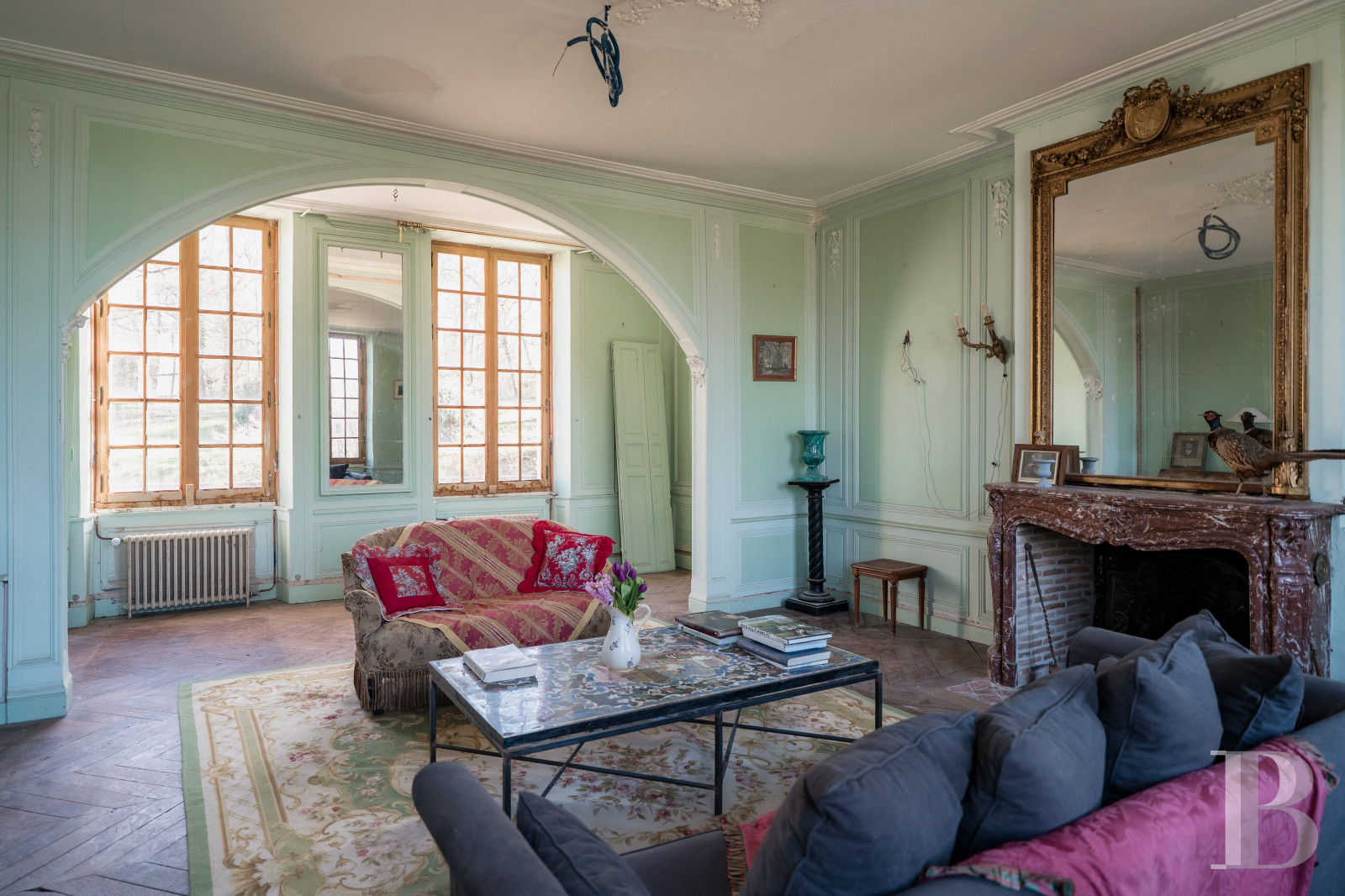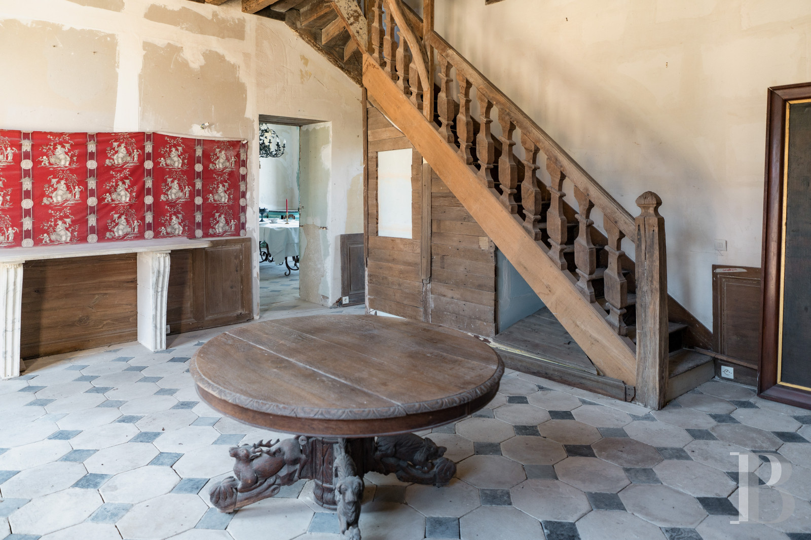 Le rez-de-chausséeUne entrée traversante recouverte d'un sol à cabochons, un escalier en bois pourvu d'une rampe de fer forgé ouvragé conduit à l'étage. La cage d'escalier est ornée d'une tapisserie aux initiales des commanditaires du château. Un vestibule saisissant par son décor de boiseries serties de petits médaillons peints. Une double porte en chêne ouvre sur un premier salon équipé d'une cheminée en marbre à foyer ouvert, surmontée d'un miroir. Des panneaux à grands cadres, des moulures finement ciselées, une alcôve ornée de coquilles en ses extrémités et un parquet en point de Hongrie subliment les lieux. Un second salon est équipé d'une cheminée de marbre surmontée d'un trumeau peint d'une scène bucolique. Les deux salons, traversants, disposent de volets intérieurs. Depuis le vestibule, un accès mène vers la salle à manger baignée de lumière, équipée d'un poêle autrichien niché sous une alcôve entre deux ouvertures. Le sol reprend les mêmes codes que l'entrée. Deux encoignures sont installées à chaque extrémité de la pièce et abritent des rangements. Attenant, un fumoir orné de boiseries d'origine et d'un parquet Versailles. Une porte en bois ouvre sur un escalier en pierre qui descend à la cave où se dresse un petit oratoire.De retour dans la salle à manger, lambris d'appuis, rosace centrale, décors floraux peints apportent une note joyeuse à l'ensemble. Une porte ouvre sur une cuisine aménagée, recouverte d'un dallage en pierre de Bourgogne et rehaussée d'un plafond à la française. Une console en marbre surmontée de plusieurs étagères valorisent la vaisselle d'origine. À proximité se tient une ancienne salle de chasse avec poutres de plafond apparentes, sol à cabochons noirs et blancs et cheminée en pierre. Face au foyer, une console en marbre fait son plus bel effet. Un escalier à balustres en bois de chêne avec main courante monte à l'étage.