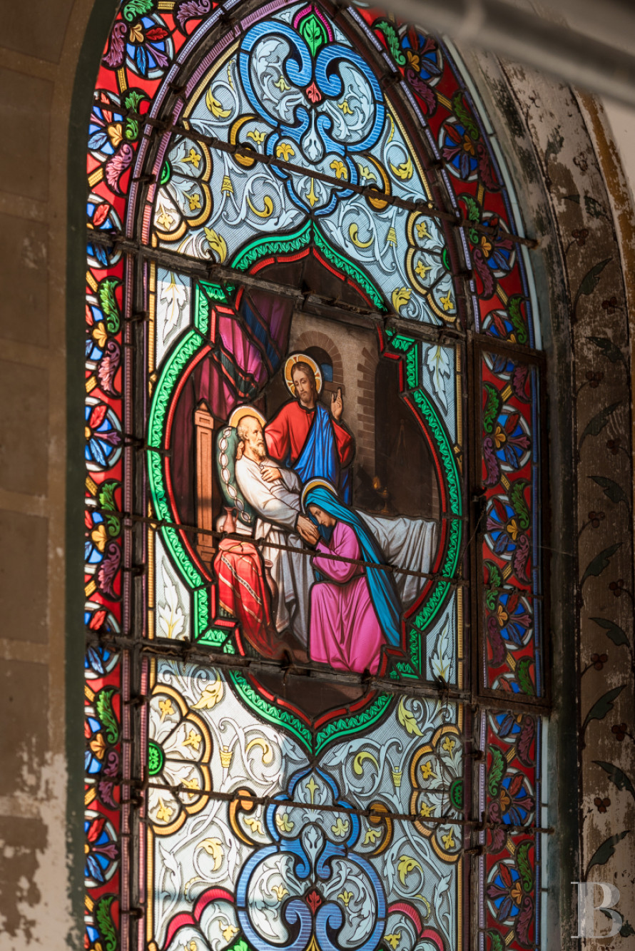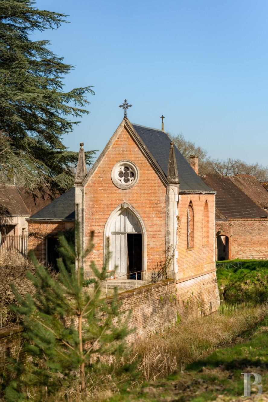 De style néo-classique, elle est dominée par une voûte d'ogive peinte, occupe environ 30 m² et son sol est constitué d'un dallage à cabochons. Sa façade principale en brique est encadrée par deux piliers en pierre. Elle est accessible par une porte à deux vantaux en bois, en forme d'arc en tiers-point outrepassé, surmontée d'un vitrail quadrilobé. À l'intérieur, deux baies sont ornées de vitraux représentant la Cène et la Vierge Marie. Une frise de fleurs de lys borde chaque vitrail. Sur l'autel, une pierre en marbre gravée témoigne de ce que l'église, désormais privée, avait été consacrée. Une sacristie de quelque 8 m², où le prêtre se préparait à l'office, jouxte la chapelle. Enfin, à l'extérieur, un appentis abrite un local de quelque 5 m², dont le sol est couvert de tomettes octogonales.La maison de gardien dite "le pavillon"
