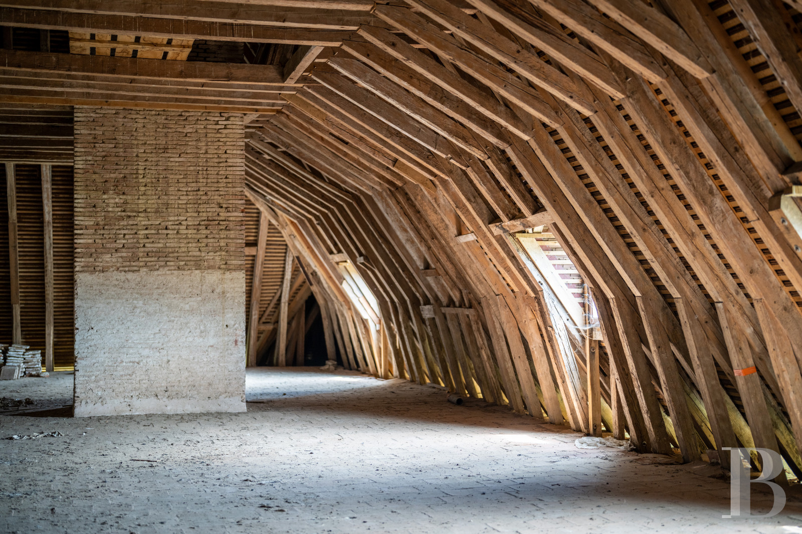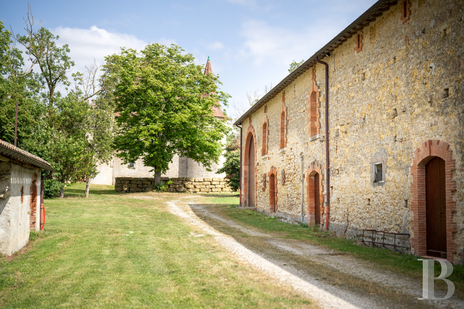 À droite, la seconde dépendance, avec murs en moellon, toiture en tuiles canal à quatre pans et baies en plein cintre à encadrement en briques, comprend un grand garage, un atelier et un appartement de gardien.