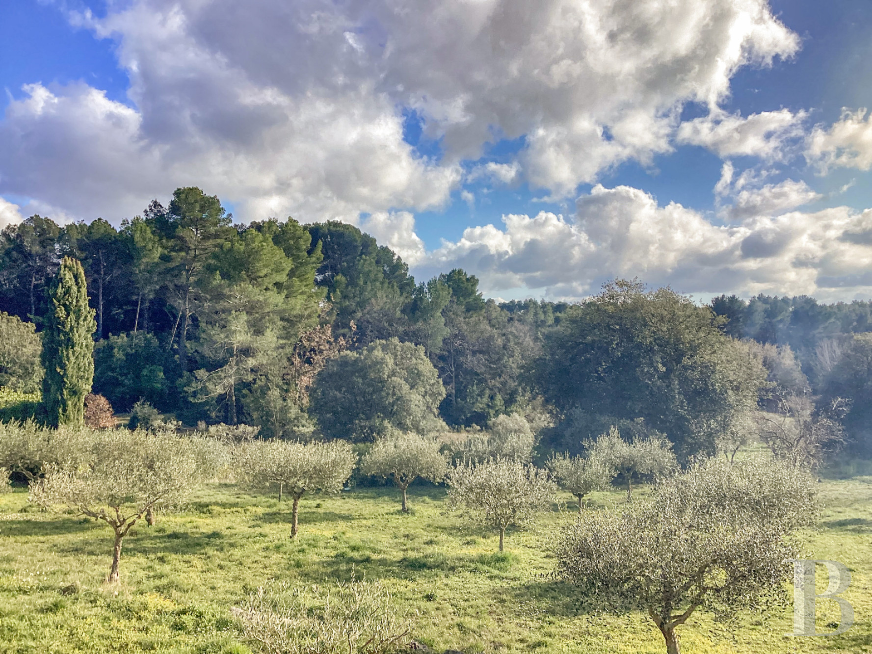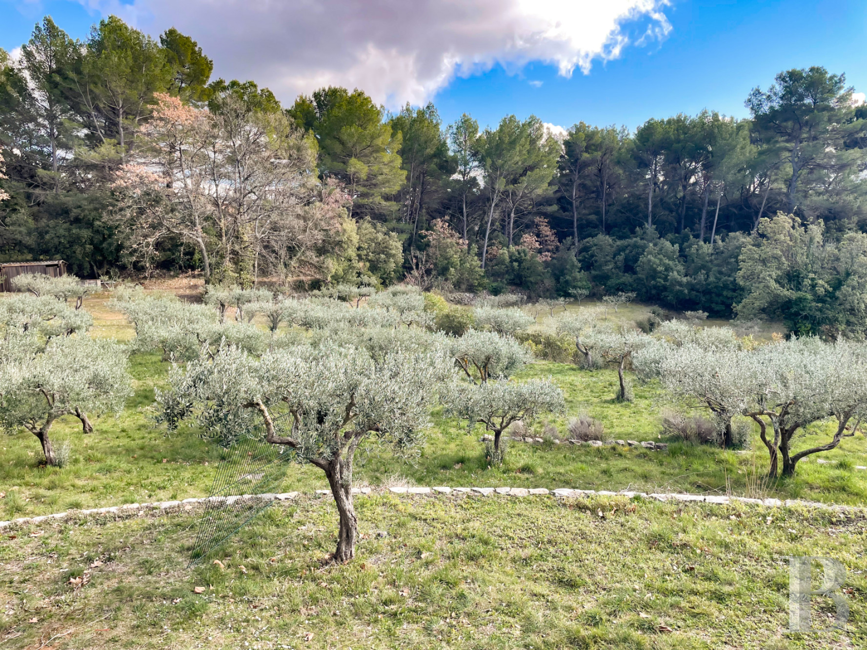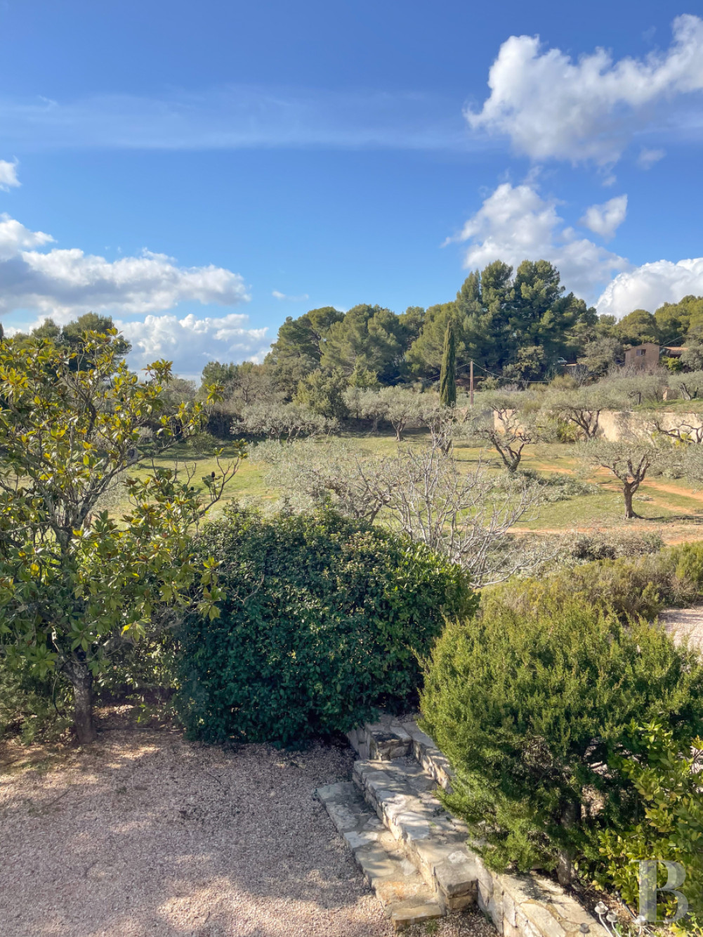 Le terrain est tourné largement vers le sud, puis vers l’ouest et à l’est du bâti. Les terrasses successives, bordées de murets, descendent en pente douce vers les champs d’oliviers. Deux platanes centenaires ombragent la terrasse principale, où un espace repas est logé sous la ramure d’un cyprès de Lambert bicentenaire. Plus à l’ouest et au sud, les oliveraies s’étendent en contrebas, tandis qu’à l’est, une pinède protège la propriété des vents. En limite sud-ouest, discrète et à l’abri des regards, s'étend une piscine maçonnée de 14 x 6m traitée au chlore, entourée de haies et de murets de pierre. L’ensemble forme un parc typiquement méditerranéen, au rythme du soleil et du parfum des essences provençales. Trois petites parcelles plantées d'oliviers s’étendent de l’autre côté de la route.Our opinion