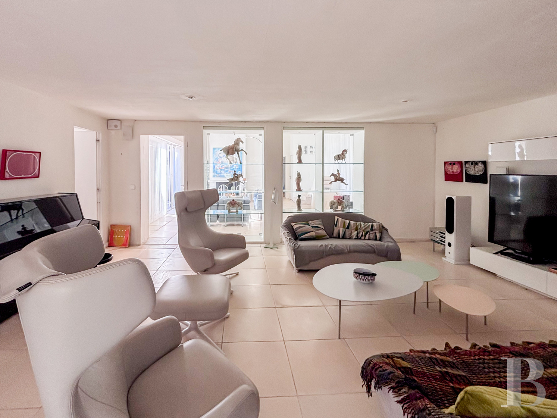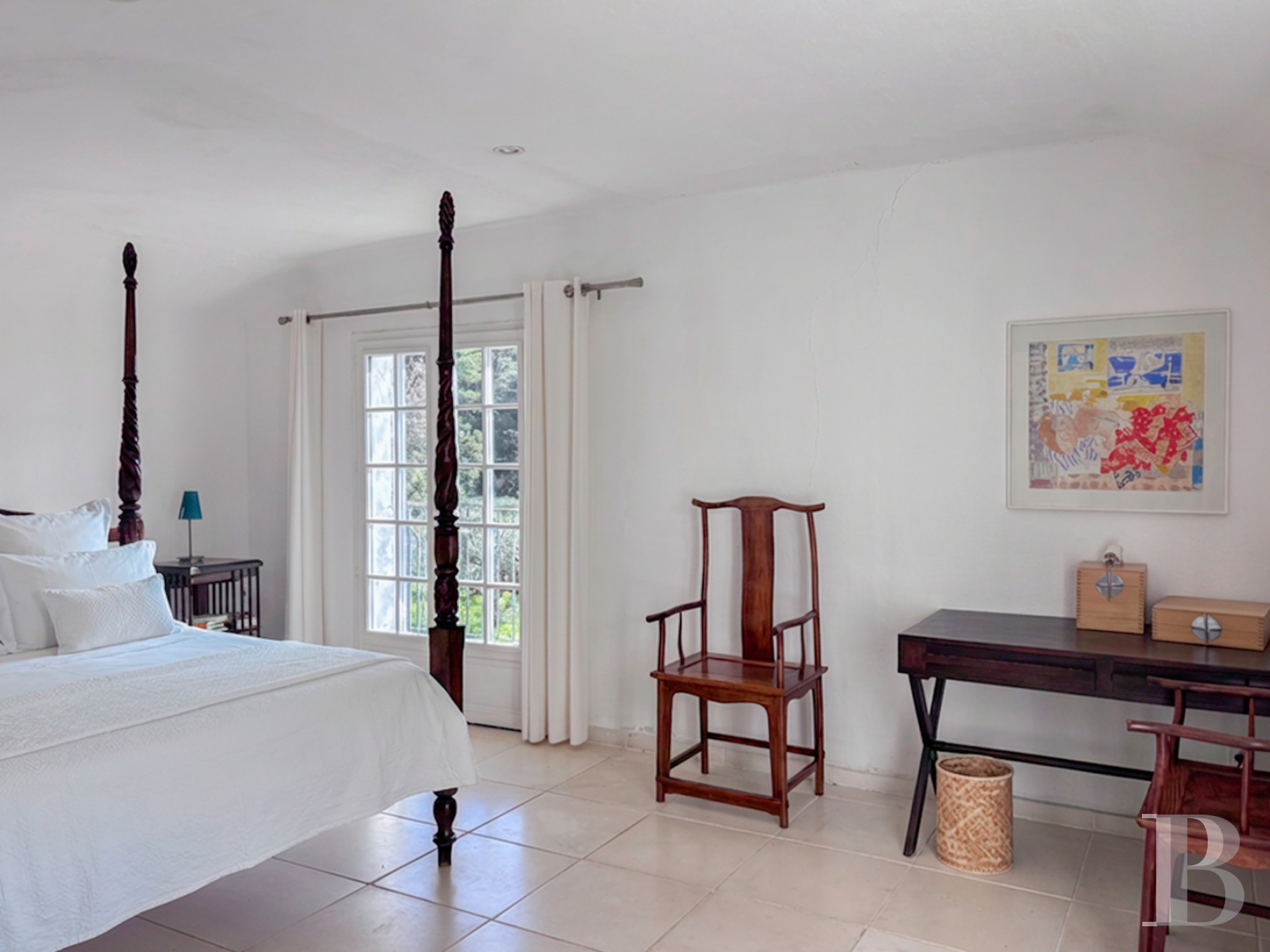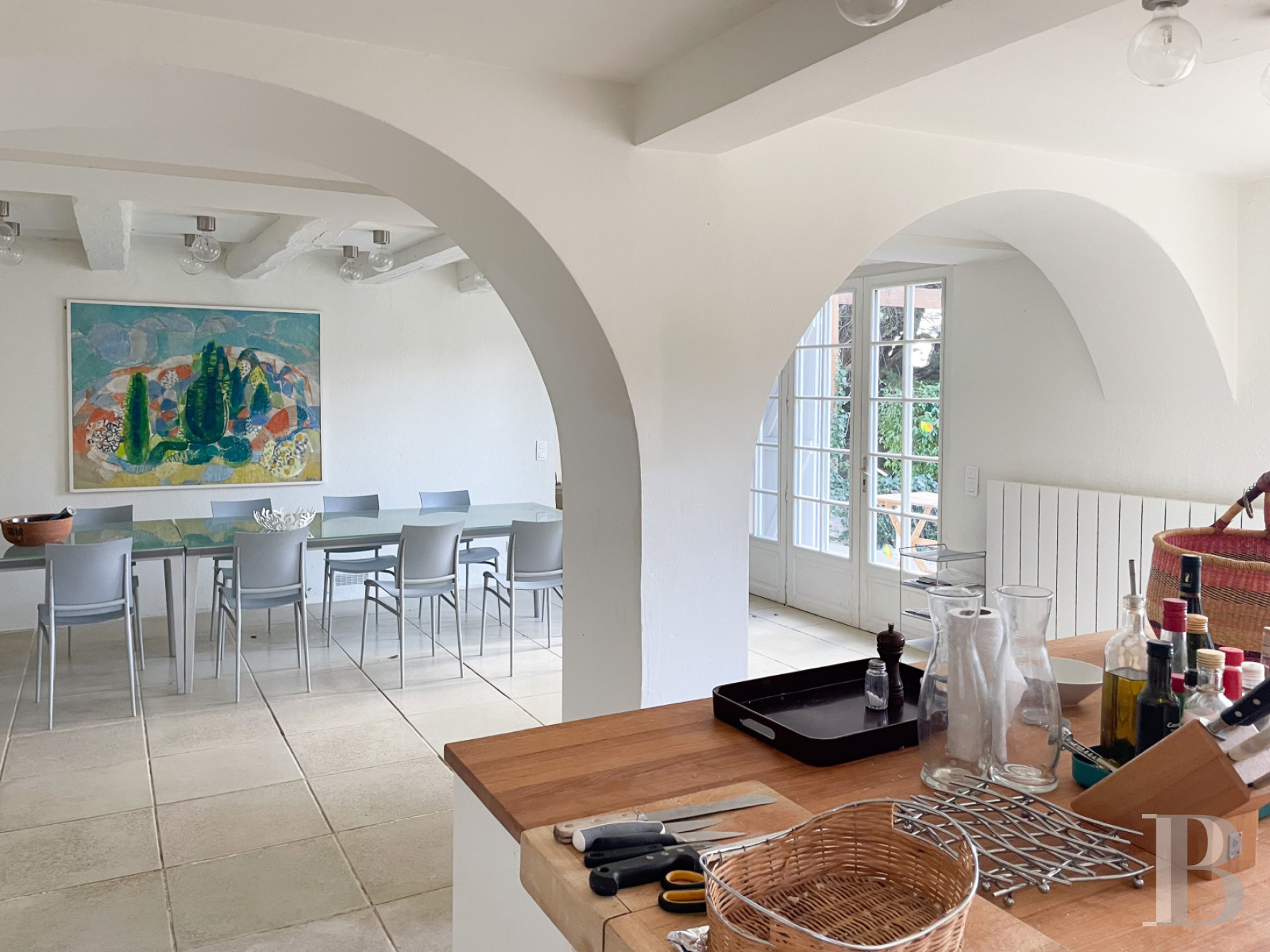 Le rez-de-chausséeL’entrée principale s’effectue par la façade ouest. Elle ouvre sur une vaste cuisine-salle à manger d’environ 51 m² : un espace convivial rythmé par deux arches doubles qui distinguent visuellement les fonctions sans les cloisonner. Les poutres apparentes, peintes en blanc, accentuent la luminosité diffusée par des baies à l'ouest et au nord. L’espace central dessert un bureau tourné vers la terrasse méridionale, ainsi qu'un grand salon traversant, où une cheminée est adossée à l’un des murs. Il est baigné de lumière grâce à deux larges baies vitrées et relie les deux corps du logis. Le plafond sous pente, rehaussé de poutres blanches, accentue le sentiment d’espace. La pièce mène à un second salon séparé par une bibliothèque entièrement vitrée et à une chambre de plain-pied avec salle d’eau, orientée à la fois au sud et à l’ouest. Tous les sols de la maison sont pavés de large dalles en pierre.