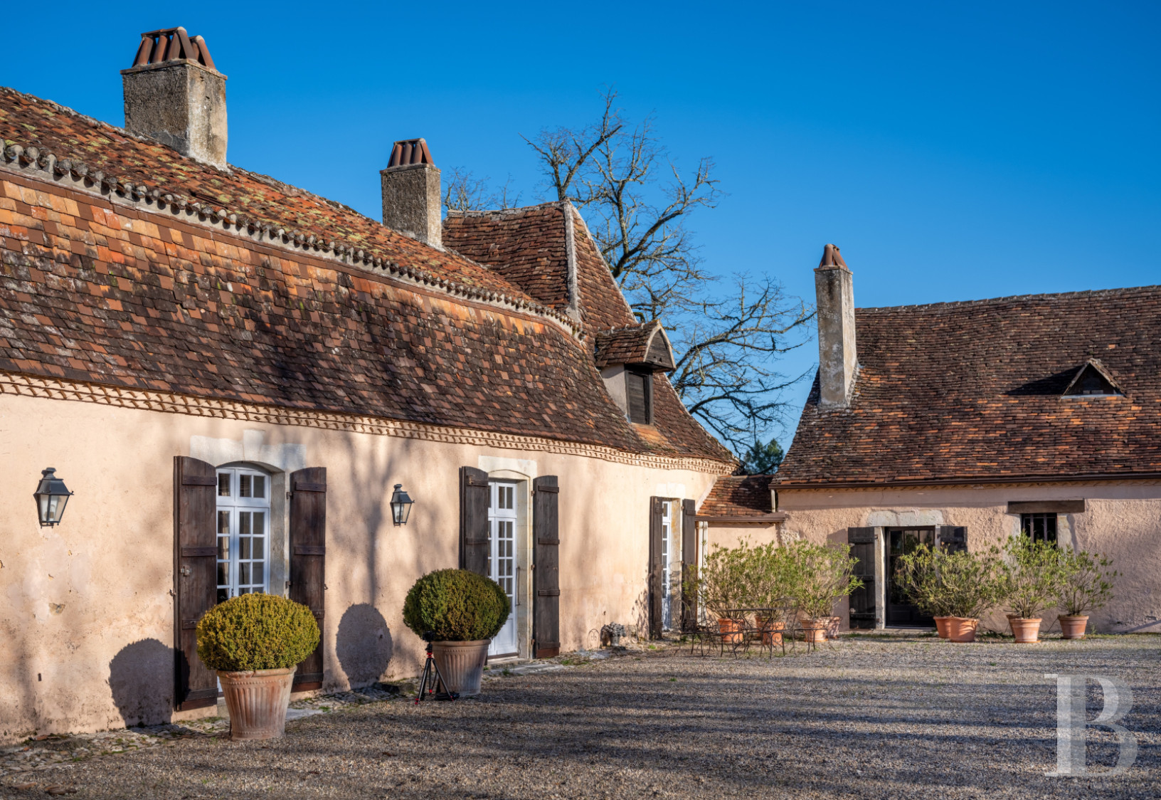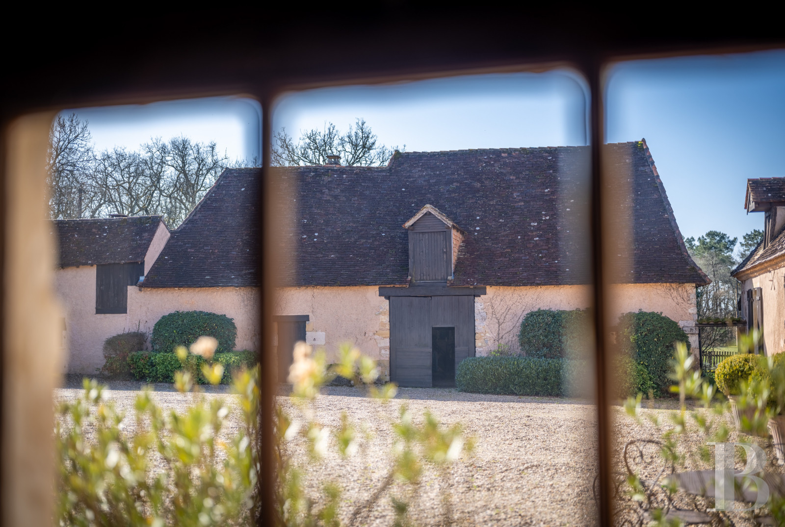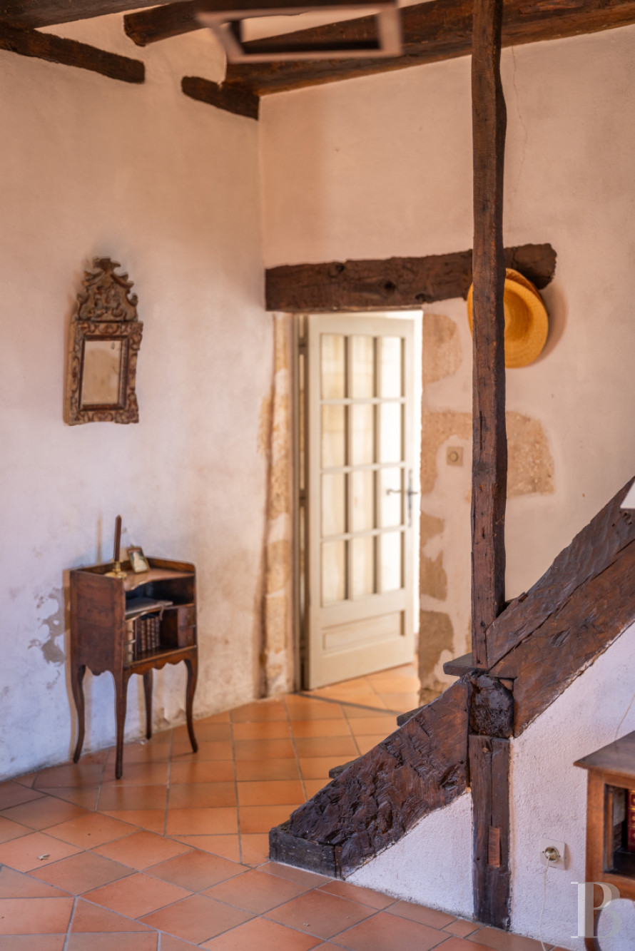 Une frugale chartreuse du 17e s., représentative de l’architecture périgourdine traditionnelle. Construite de plain-pied et traversée par la lumière, de la cour au terrain, l'intérieur et l'extérieur s'entremêlent pour ne faire plus qu'un aux beaux jours. L’aménagement des anciennes dépendances de l’aile nord a permis d’augmenter la capacité d’accueil, mais aussi de conserver l’identité du domaine. Quelques travaux permettront d’en révéler pleinement le potentiel et d'en accompagner la prochaine évolution. Dans le prolongement de son organisation originelle, la propriété est sise au surplomb de la vallée, orientée vers l’ouest. Le parc s’ouvre largement sur le paysage vallonné, à l’ombre d’un chêne trois fois centenaire qui structure les perspectives depuis la maison.