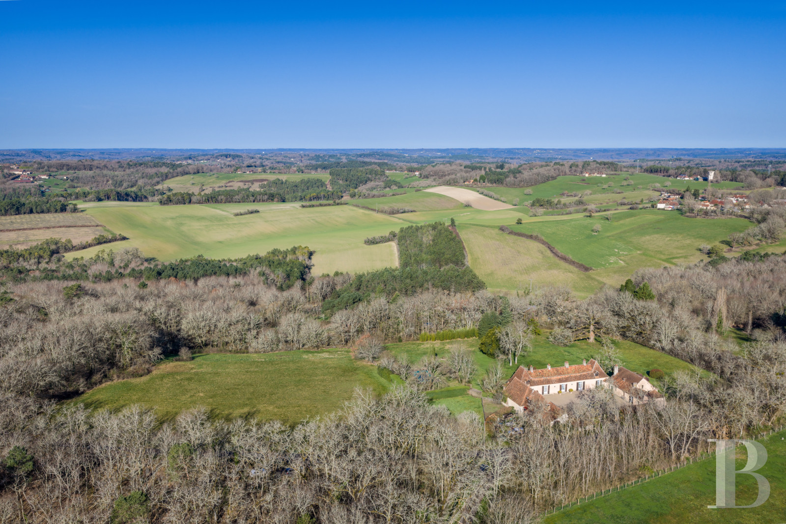 Aux abords de Périgueux, cité labellisée « Ville d’art et d’histoire » et préfecture de la Dordogne, le paysage se déploie en une succession de collines douces, de prairies, de bois et de petits bourgs rassemblés autour de leurs églises. La propriété prend place dans cet environnement rural, entre anciens domaines agricoles et habitations dispersées. L’autoroute A89, accessible en une quinzaine de minutes, permet de rejoindre Bordeaux en environ 1 h 30 et Brive-la-Gaillarde en 45 min. Les aéroports de Bergerac et de Brive sont situés à 1 h de voiture.