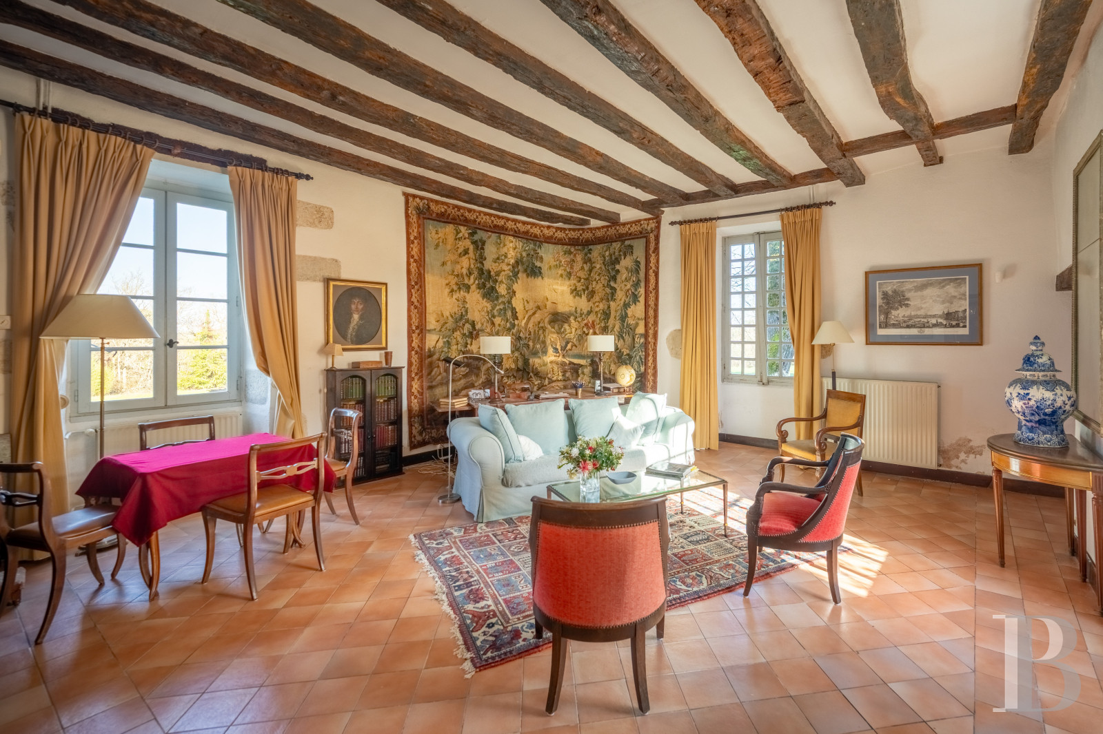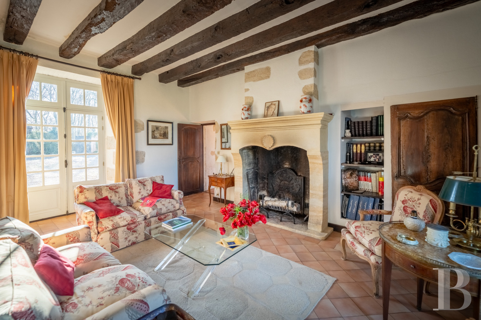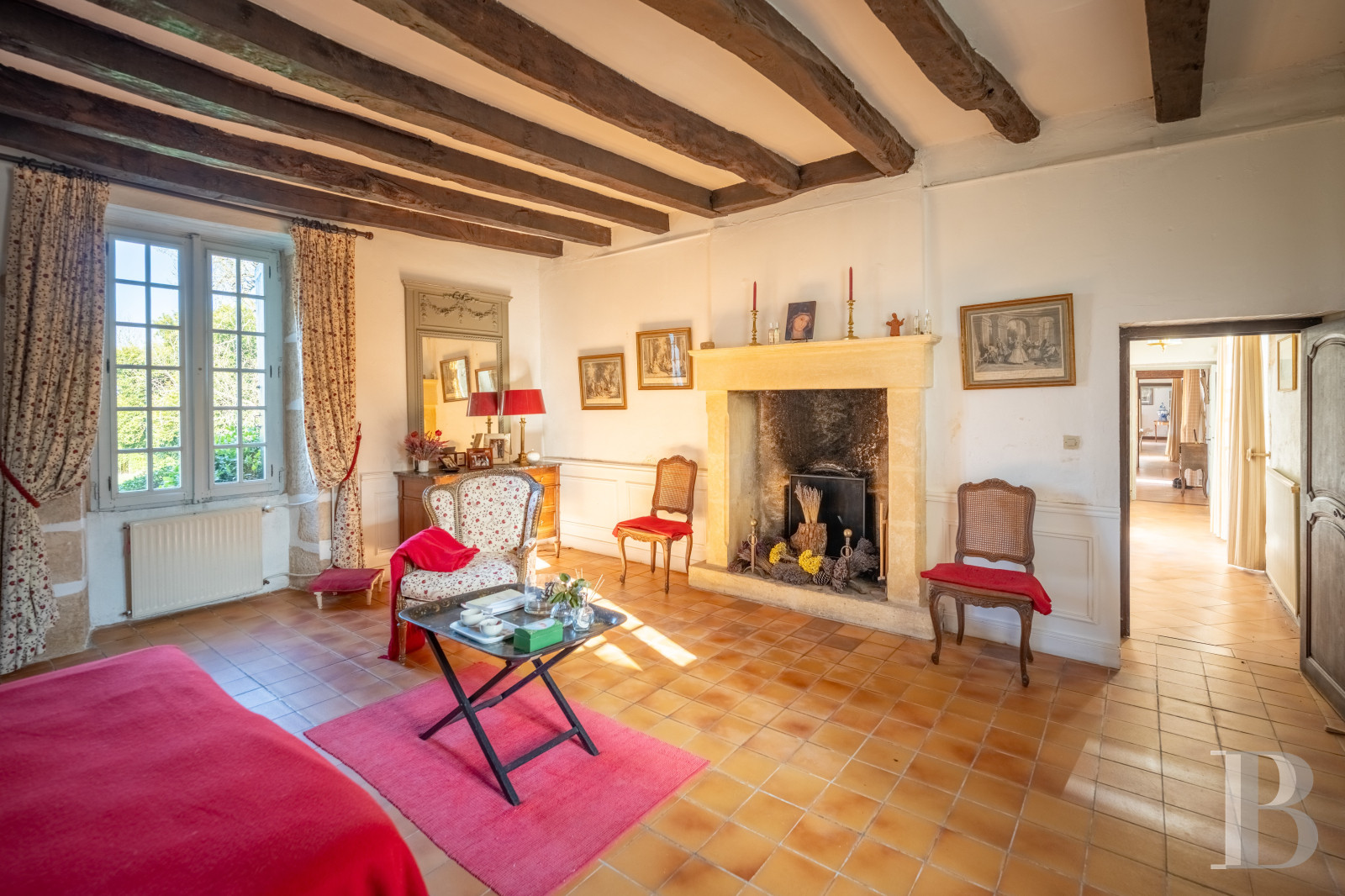 Le bâtiment principal s’articule autour de trois pièces de réception traversantes en enfilade, chacune avec cheminée de pierre, niches et placards encastrés. Un corridor distribue deux chambres avec vue directe sur le parc. À l’autre extrémité, un dégagement conduit vers l’aile nord, qui prolonge les espaces de vie par une vaste salle à manger avec cuisine ouverte. Ancienne étable réhabilitée et pavée de carreaux de terre cuite, cette partie comprend également une chambre et une salle de bains. Dans une tourelle carrée attenante, prennent place deux chambres supplémentaires destinées aux enfants. Une arrière-cuisine assure la liaison entre les accès de service, une buanderie, un cellier, des toilettes indépendantes et un accès à l'étage supérieur.