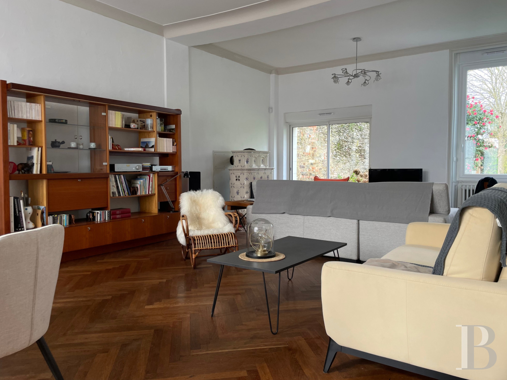 Le rez-de-chausséeLes différentes pièces sont agencées autour d'un vestibule central. D'un côté, se trouvent un petit salon et une cuisine ; de l'autre, un grand salon - salle à manger. En face, un large dégagement commande un escalier, des toilettes et une buanderie. L'espace mène à la façade opposée via une véranda côté jardin. Les salons, salle à manger et vestibule sont parquetés à points-de-Hongrie, les autres pièces sont notamment carrelées en marbre. Un poêle à pellets est installé dans le petit salon et permet le chauffage général de la maison. Le grand salon - salle à manger, avec poêle alsacien et cheminée en marbre, ménage une vue très dégagée sur le jardin. L'ensemble des pièces est lumineux et la hauteur sous plafond est de 3,30 m environ.