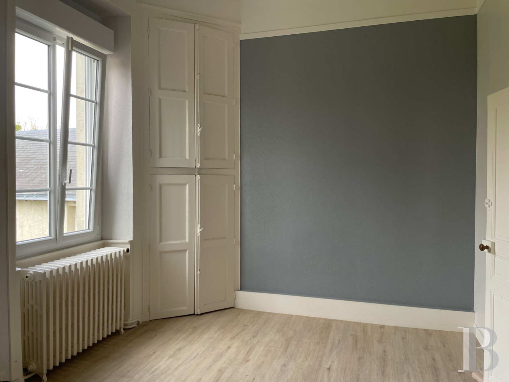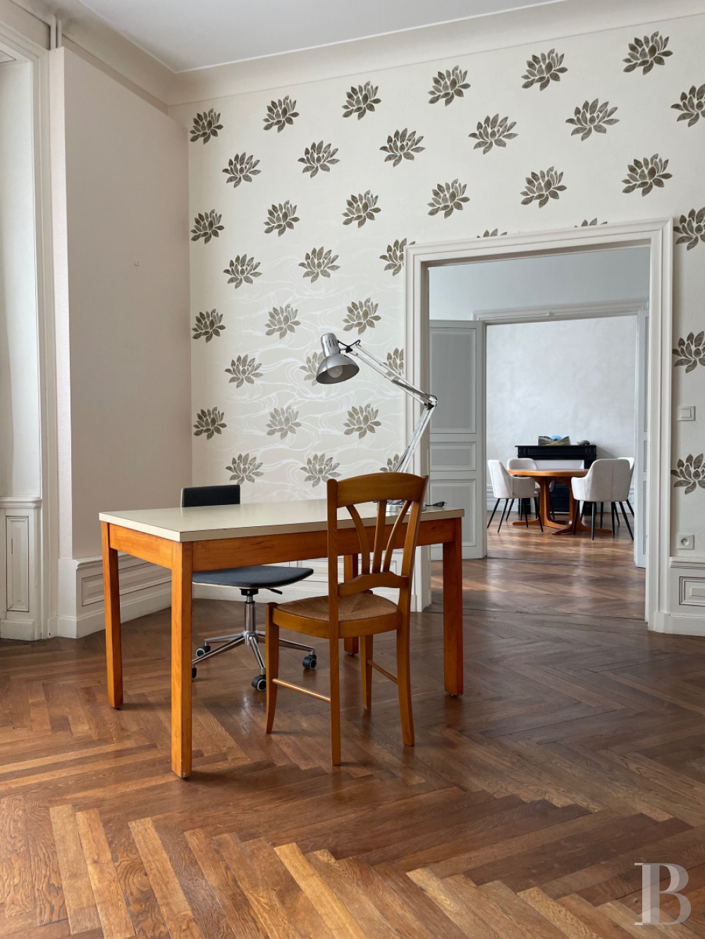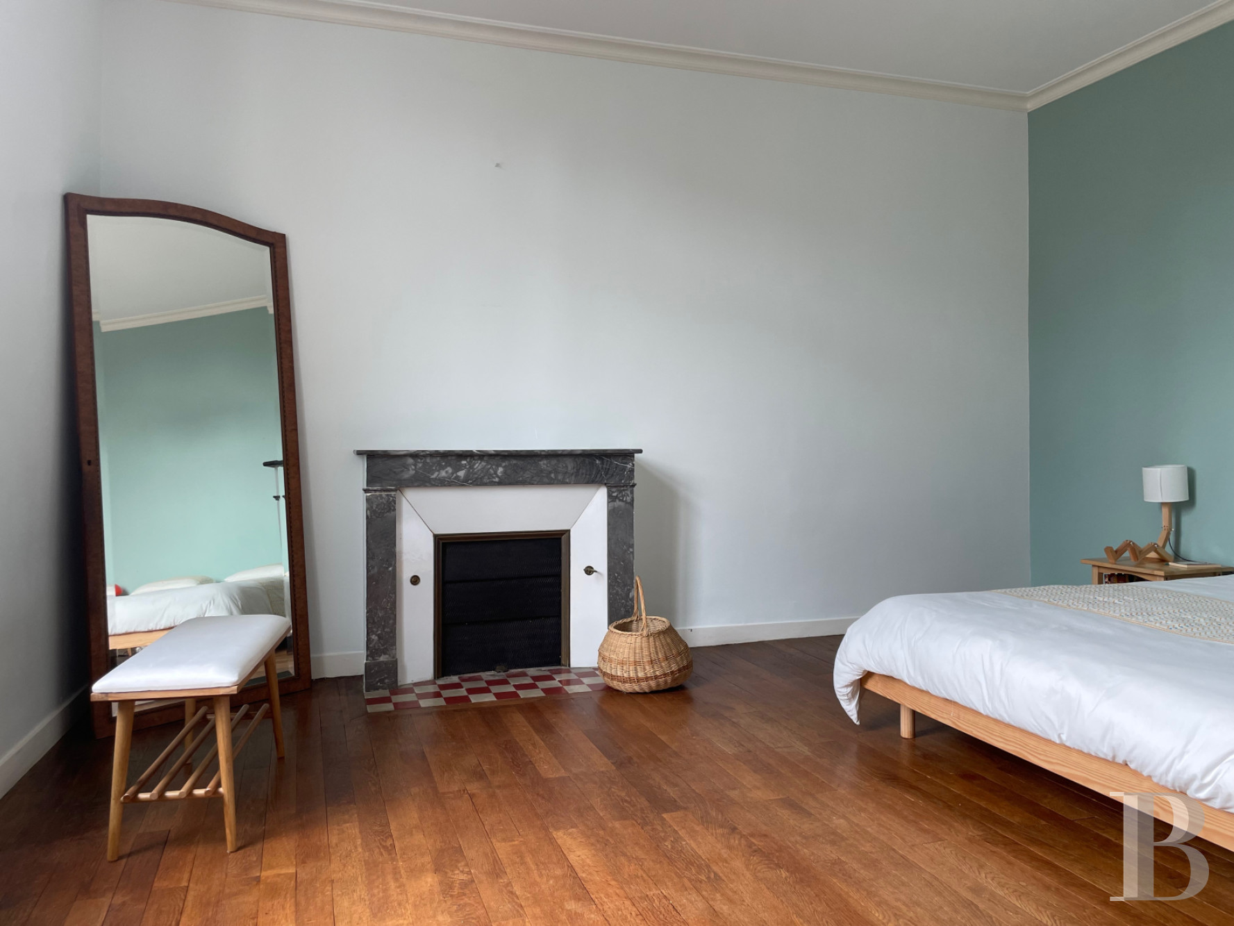 Un large palier parqueté distribue cinq chambres, dont trois de plus de 20 m², avec leur cheminée en marbre gris et deux autres de respectivement 13 et 6 m² environ. Elles voisinent des toilettes, une grande salle de bains et une salle de douche. Tous les sols sont parquetés à coupe perdue, à l'exception d'une petite chambre avec faux parquet.