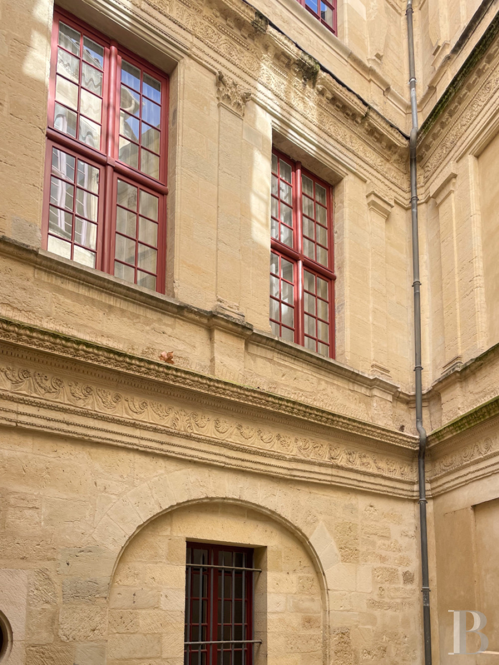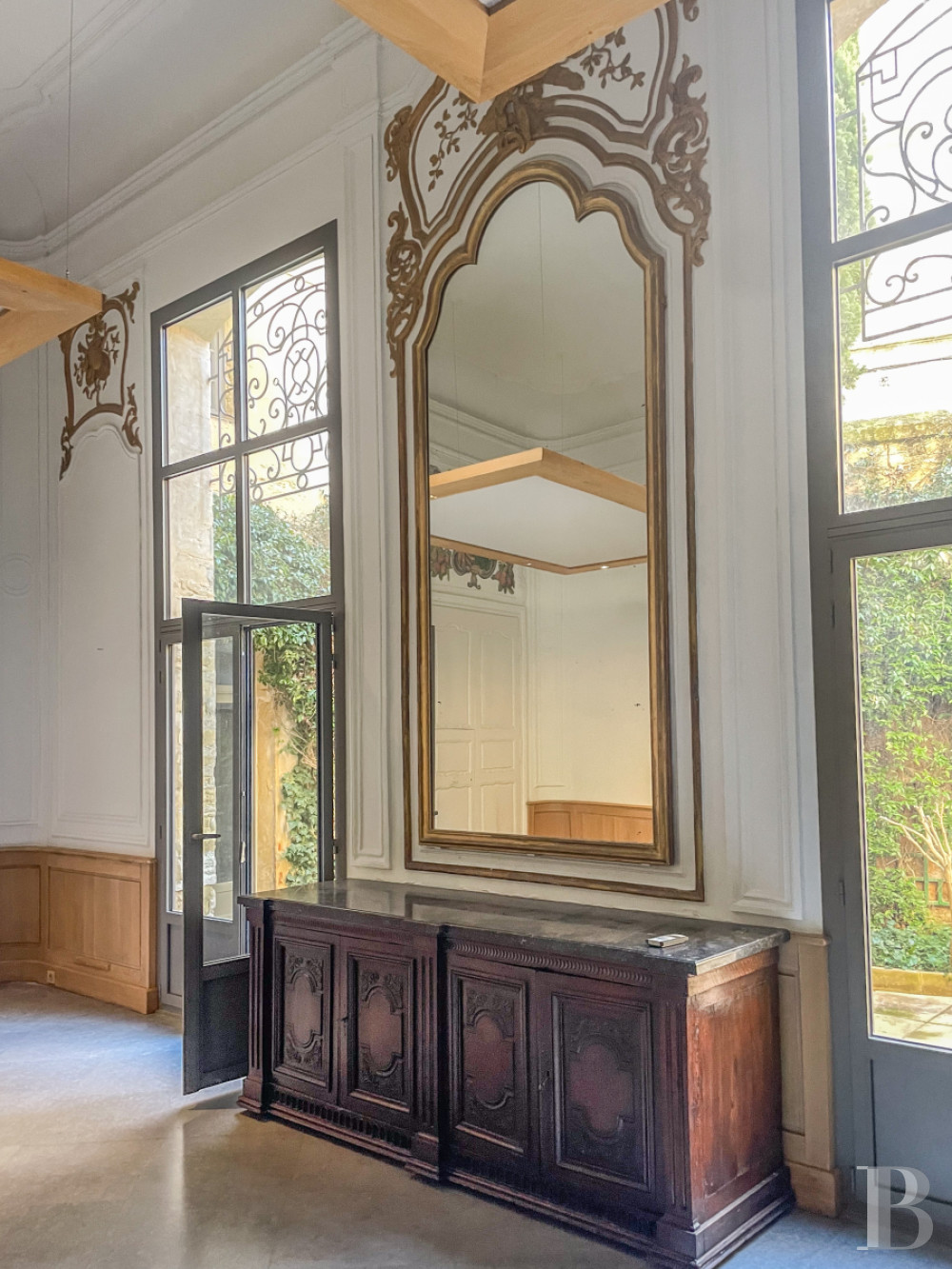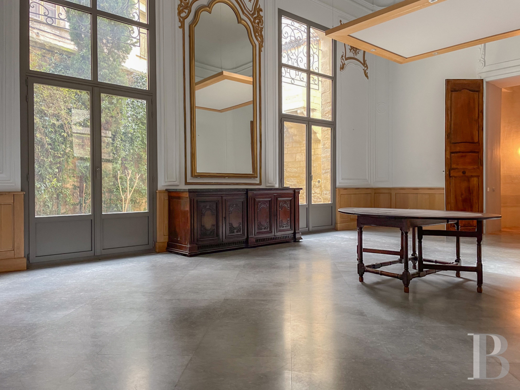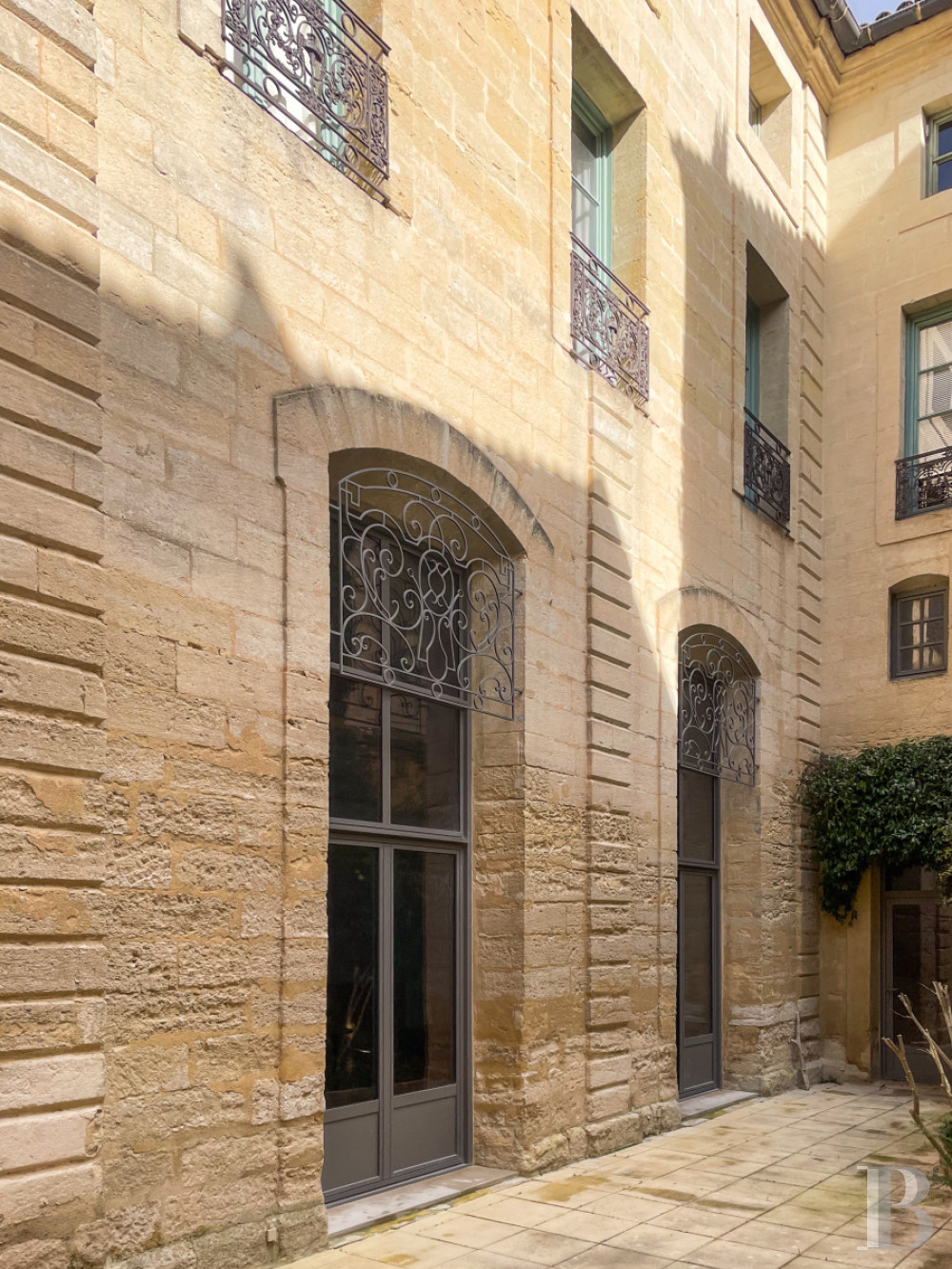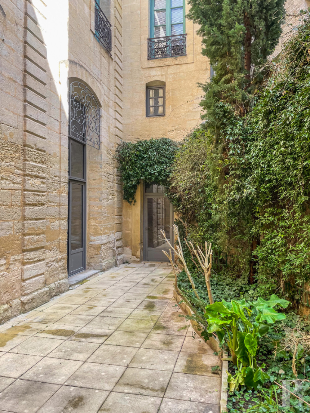 Accessible au rez-de-chaussée de l'hôtel particulier, il donne vue par cinq vastes portes-fenêtres sur la cour-jardin, orientée au sud.De l'entrée, un couloir en L au sol en pare-feuilles anciens, orné d’une étonnante niche murale à décor de grand rince-doigt en pietra dura et bronze, dessert la salle de séjour, ancien salon d‘apparat de 6,8 m de haut et plus de 60 m², dont elle a conservé cheminée de marbre à décor d’acanthes, trumeaux dorés avec gypseries, dessus-de-porte peints, lambris et miroirs, mis en valeur par la sobre blancheur des murs. Le sol en dalles carrées de bar gris a été reconstitué à l’identique de l’original. Le salon, qui ouvre sur la cour-jardin de l'appartement par deux portes-fenêtres surmontées de hautes impostes à quatre carreaux, accède à une salle d'eau et à une chambre en mezzanine, par un placard dissimulé.Le couloir dessert ensuite deux chambres et la cuisine voûtée, d'époque médiévale, qui ouvre par une porte vitrée sur la cour dallée et végétalisée. La première pièce à coucher arbore un plafond voûté en pierre, comme la cuisine, et donne sur la cour intérieure de l'hôtel particulier par une fenêtre à petits carreaux que protège une grille en ferronnerie. Enfin, la chambre principale que le corridor commande, avec sa salle d’eau et sa garde-robe ainsi qu'un débarras, ouvre sur la cour-jardin via une porte-fenêtre à imposte vitrée, présente des murs en pierres taillées apparentes ainsi qu'un sol damé de marbre blanc et noir des Pyrénées.La cour-jardin