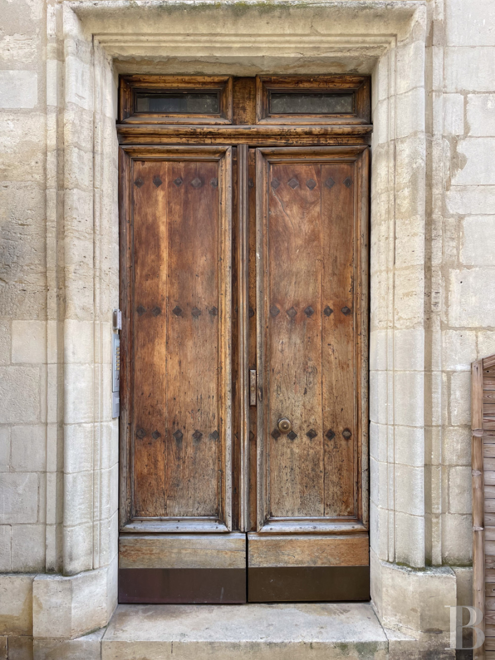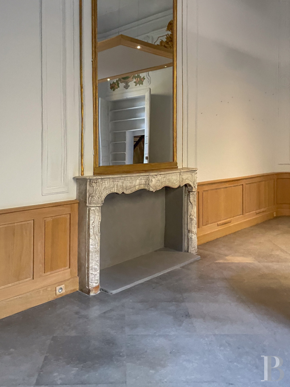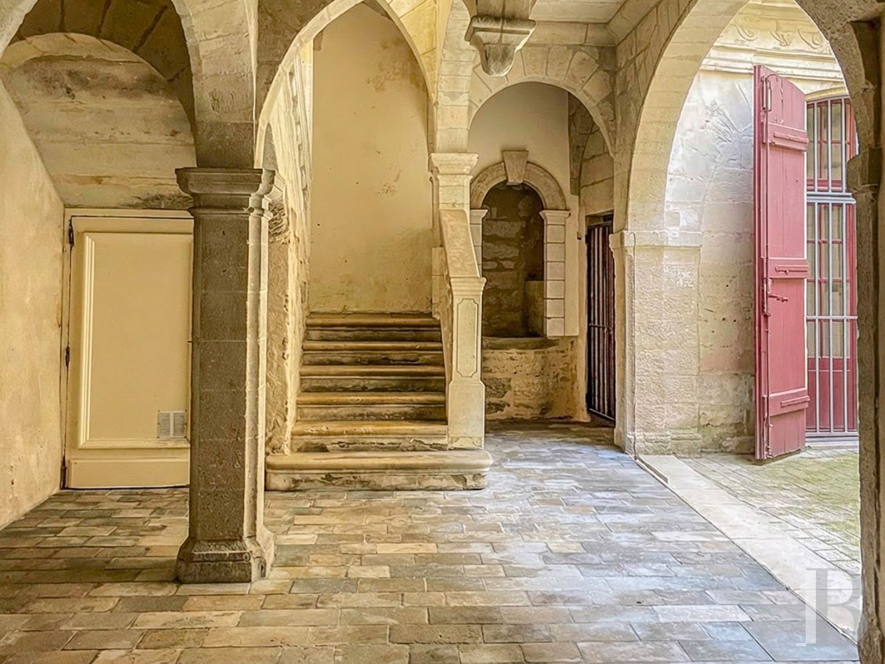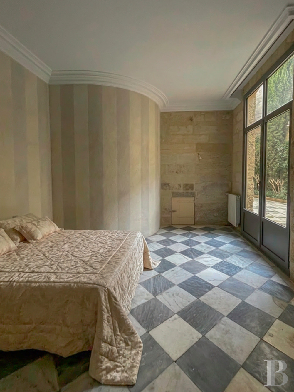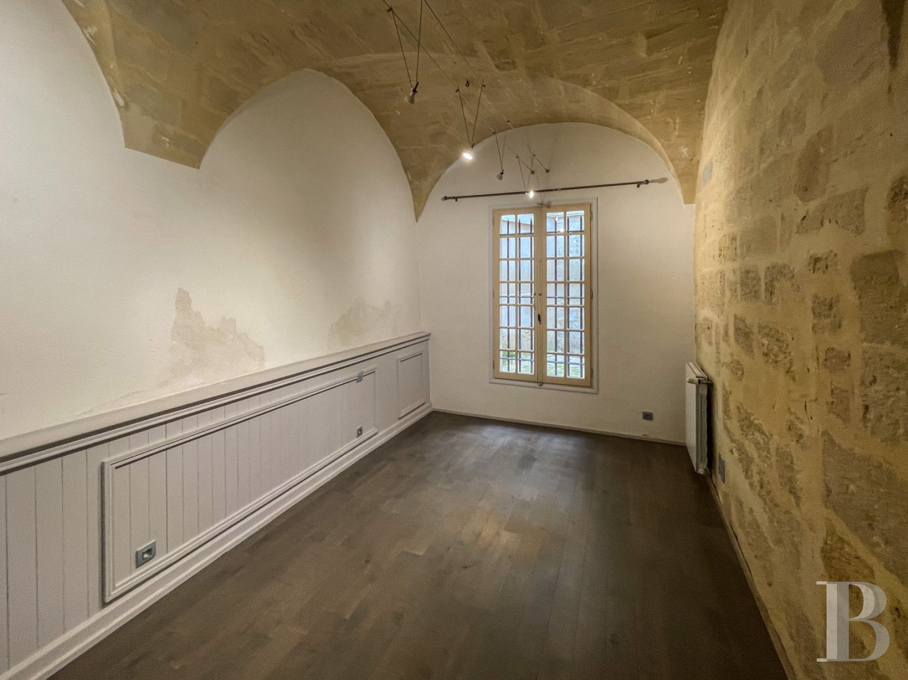 Accessible au rez-de-chaussée de l'hôtel particulier, il donne vue par cinq vastes portes-fenêtres sur la cour-jardin, orientée au sud.De l'entrée, un couloir en L au sol en pare-feuilles anciens, orné d’une étonnante niche murale à décor de grand rince-doigt en pietra dura et bronze, dessert la salle de séjour, ancien salon d‘apparat de 6,8 m de haut et plus de 60 m², dont elle a conservé cheminée de marbre à décor d’acanthes, trumeaux dorés avec gypseries, dessus-de-porte peints, lambris et miroirs, mis en valeur par la sobre blancheur des murs. Le sol en dalles carrées de bar gris a été reconstitué à l’identique de l’original. Le salon, qui ouvre sur la cour-jardin de l'appartement par deux portes-fenêtres surmontées de hautes impostes à quatre carreaux, accède à une salle d'eau et à une chambre en mezzanine, par un placard dissimulé.Le couloir dessert ensuite deux chambres et la cuisine voûtée, d'époque médiévale, qui ouvre par une porte vitrée sur la cour dallée et végétalisée. La première pièce à coucher arbore un plafond voûté en pierre, comme la cuisine, et donne sur la cour intérieure de l'hôtel particulier par une fenêtre à petits carreaux que protège une grille en ferronnerie. Enfin, la chambre principale que le corridor commande, avec sa salle d’eau et sa garde-robe ainsi qu'un débarras, ouvre sur la cour-jardin via une porte-fenêtre à imposte vitrée, présente des murs en pierres taillées apparentes ainsi qu'un sol damé de marbre blanc et noir des Pyrénées.La cour-jardin