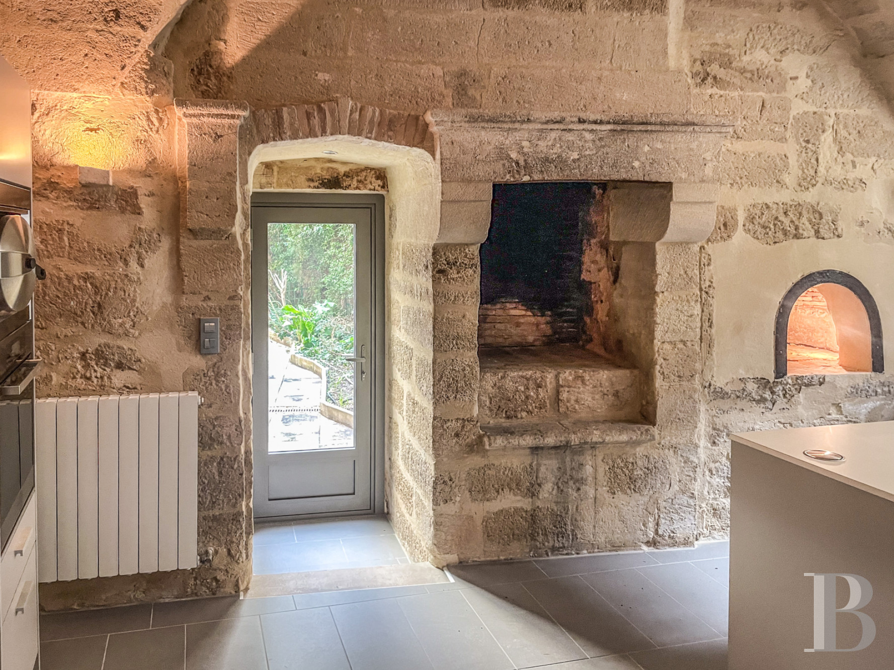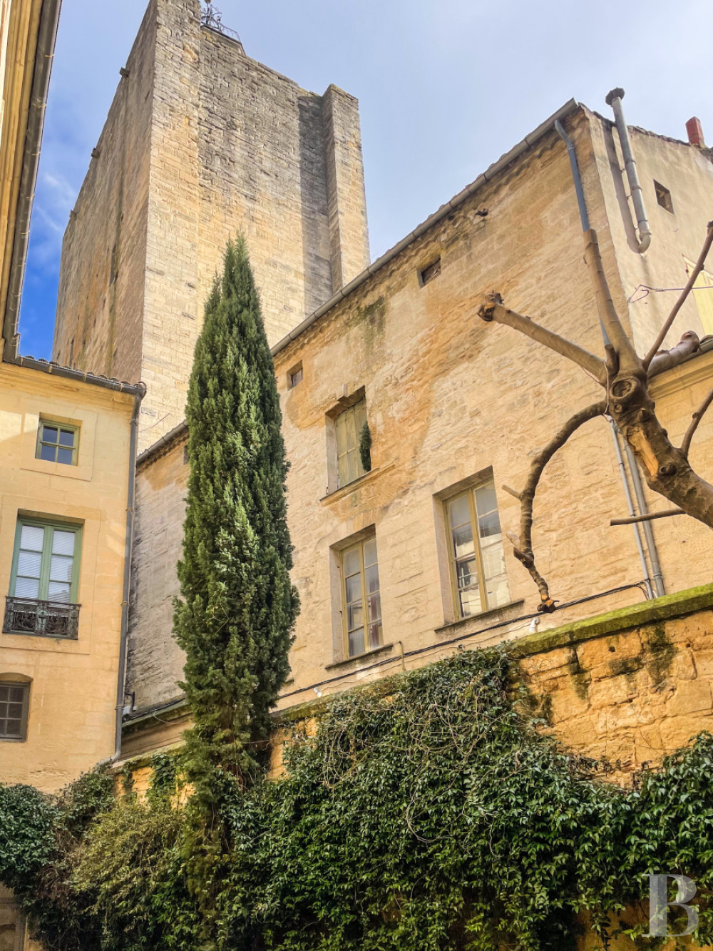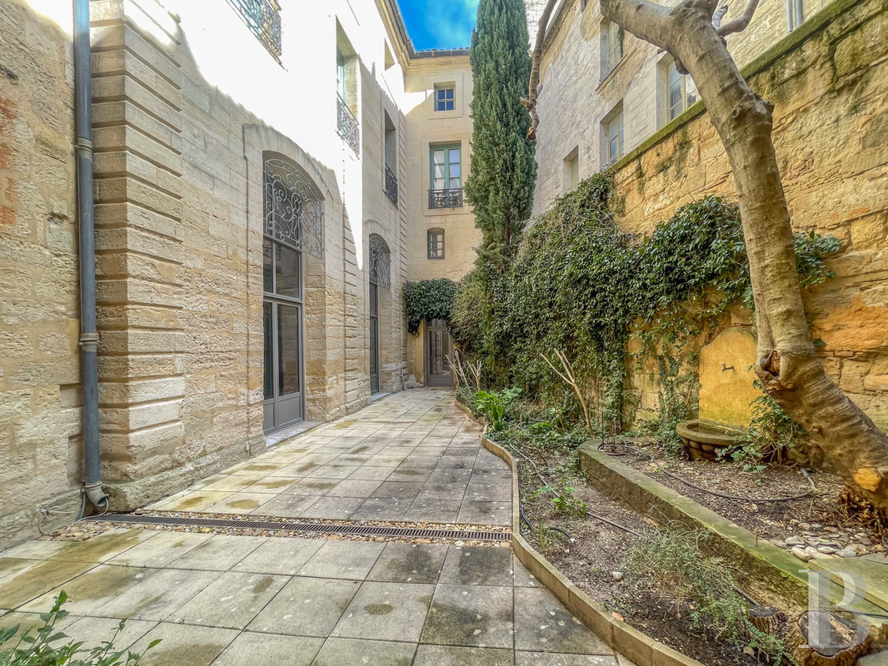 À quelques pas de la place aux Herbes, où les façades blondes racontent la splendeur passée du duché, la surprise est grande de trouver un véritable hortus conclusus. Bien que de surface modeste, ce jardin de cour, pavé de dalles régulières en pierre, est orné de deux fontaines en appliques qui incarnent l'essence de l'architecture uzètienne. La cour-jardin que surplombe la tour du Roi est une véritable pièce à vivre à ciel ouvert, très protégée de l'agitation des ruelles du duché, où chaque détail ajoute à l'harmonie du lieu. La végétation, à la fois luxuriante et contenue, se décline en grappes de lierre et arbustes persistants qui s'enroulent contre le mur de refend en pierre de Vers, celle du Pont du Gard. Le jardin clos forme un havre de paix et de fraîcheur durant les mois les plus chauds. La lumière douce et changeante au fil de la journée illumine les pièces de l'appartement.La cave
