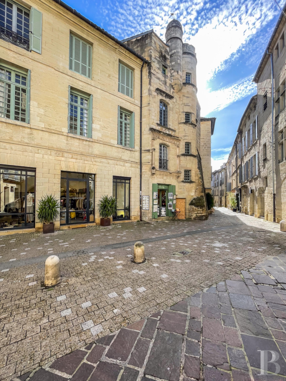 Édifiée à quelques enjambées de chaise à bras de la place aux Herbes et du duché, la maison noble à l'élégance Renaissance trône au cœur même de la cité historique d’Uzès, qui a bénéficié du tout premier "secteur sauvegardé" de France, au coeur du Gard. Célèbre pour sa douceur de vivre, son marché hebdomadaire multi-centenaire, véritable coeur battant de la ville, ses boutiques et l’allure aristocratique de son patrimoine architectural, le commune de 10 000 habitants compte trois collèges, un lycée polyvalent, un centre hospitalier et de nombreux commerces. La ville, édifiée sur un promontoire, est entourée de vignes, d’oliviers et de garrigue qui forment le pays d'Uzès, appelé l'Uzège.