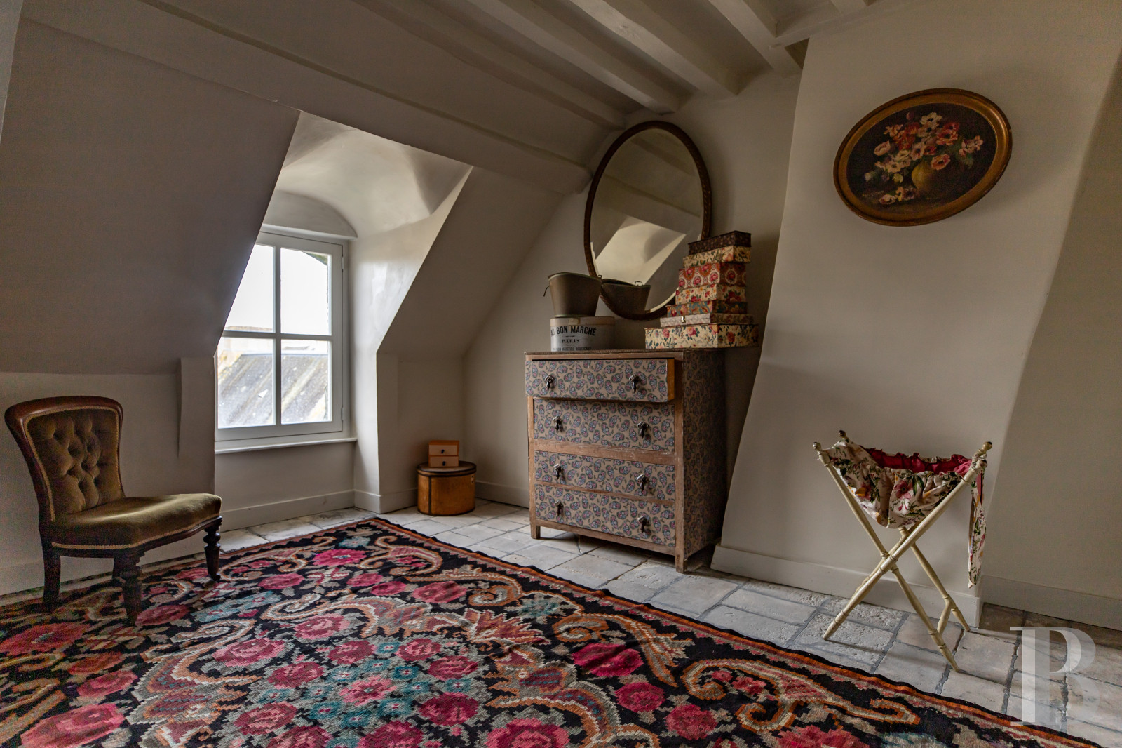 Avec ses espaces de rangement, une première pièce face à l’escalier pourrait servir de garde-robe. Une lucarne donne sur les toits de la cité. Le sol est dallé de tomettes en calcaire. Au plafond, les solives sont apparentes. Dans le prolongement du couloir, une chambre mansardée est éclairée de deux lucarnes avec vue sur les flèches gothiques et les vitraux de la cathédrale. Le sol est parqueté en bois blond à large lames. Le couloir de l’étage est d’un côté éclairé par une lucarne. De l’autre, quelques marches mènent au grenier.Le jardin