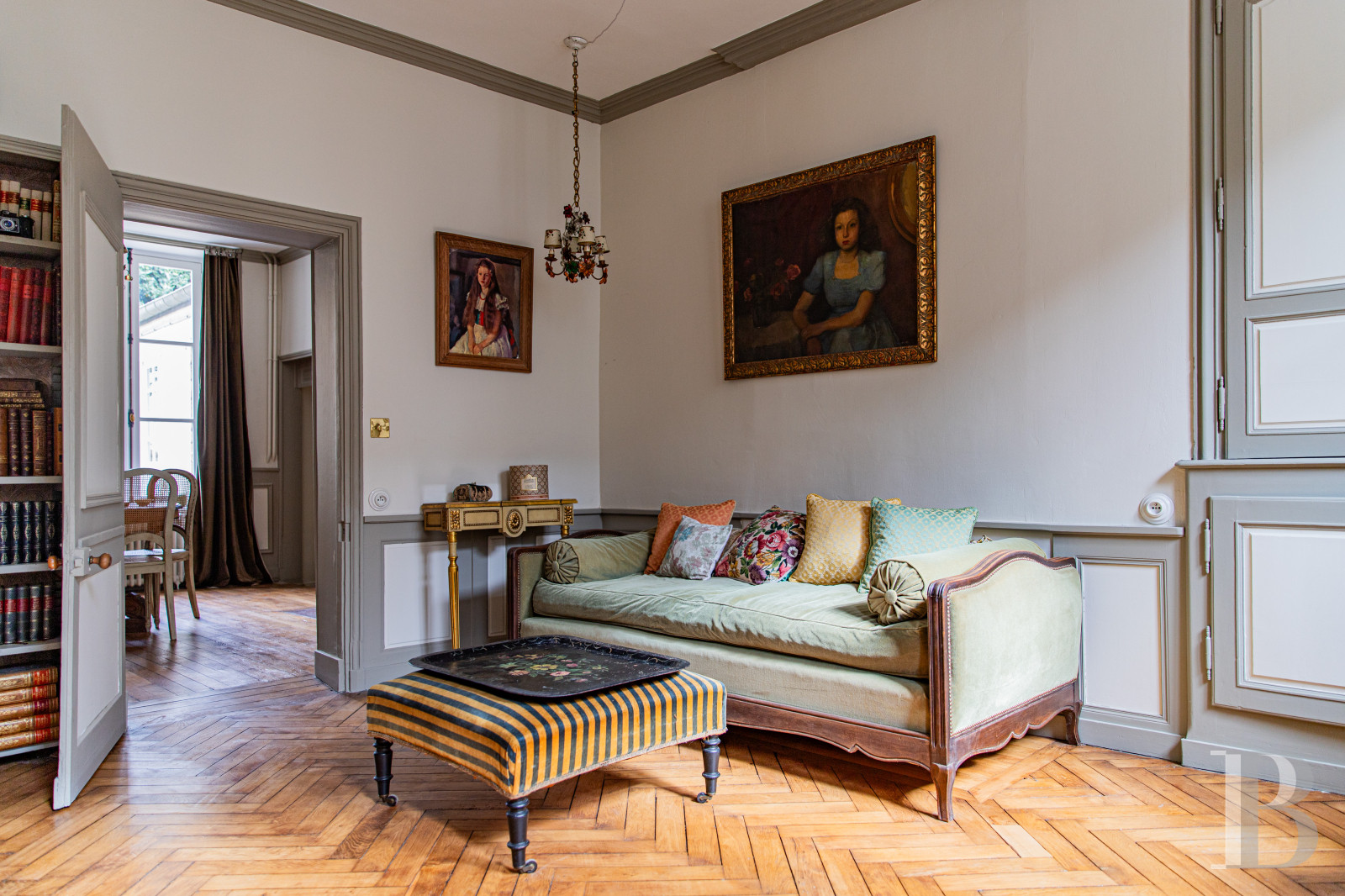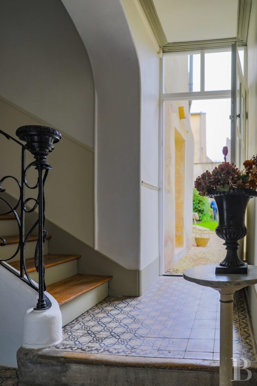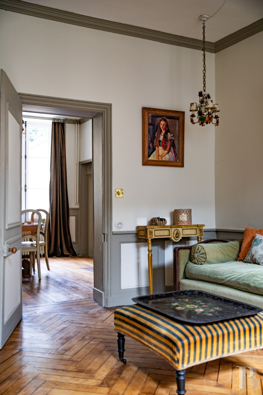 Un couloir d’entrée côté rue s’étire en longueur et mène à l'accès côté jardin. Le sol est pavé de carreaux de ciment. Le plafond est rythmé par des moulures en caissons. Passé le seuil, une porte ouvre d'un côté sur un salon. Le sol est parqueté en chêne à bâtons rompus. Deux baies ornées de crémones anciennes ouvrent sur la rue. Une large porte ouvre une perspective vers la salle à manger. Deux hautes baies donnent sur le jardin et une cheminée en marbre rouge veiné est surmontée d’un trumeau. Dans le prolongement, un passage conduit à une cuisine au sol carrelé d'un damier de ciment. Une porte-fenêtre ouvre sur une terrasse ainsi qu’une baie double. À l’arrière, une petite office éclairée d'une baie est équipée d’une double vasque ancienne en pierre.Le premier étage