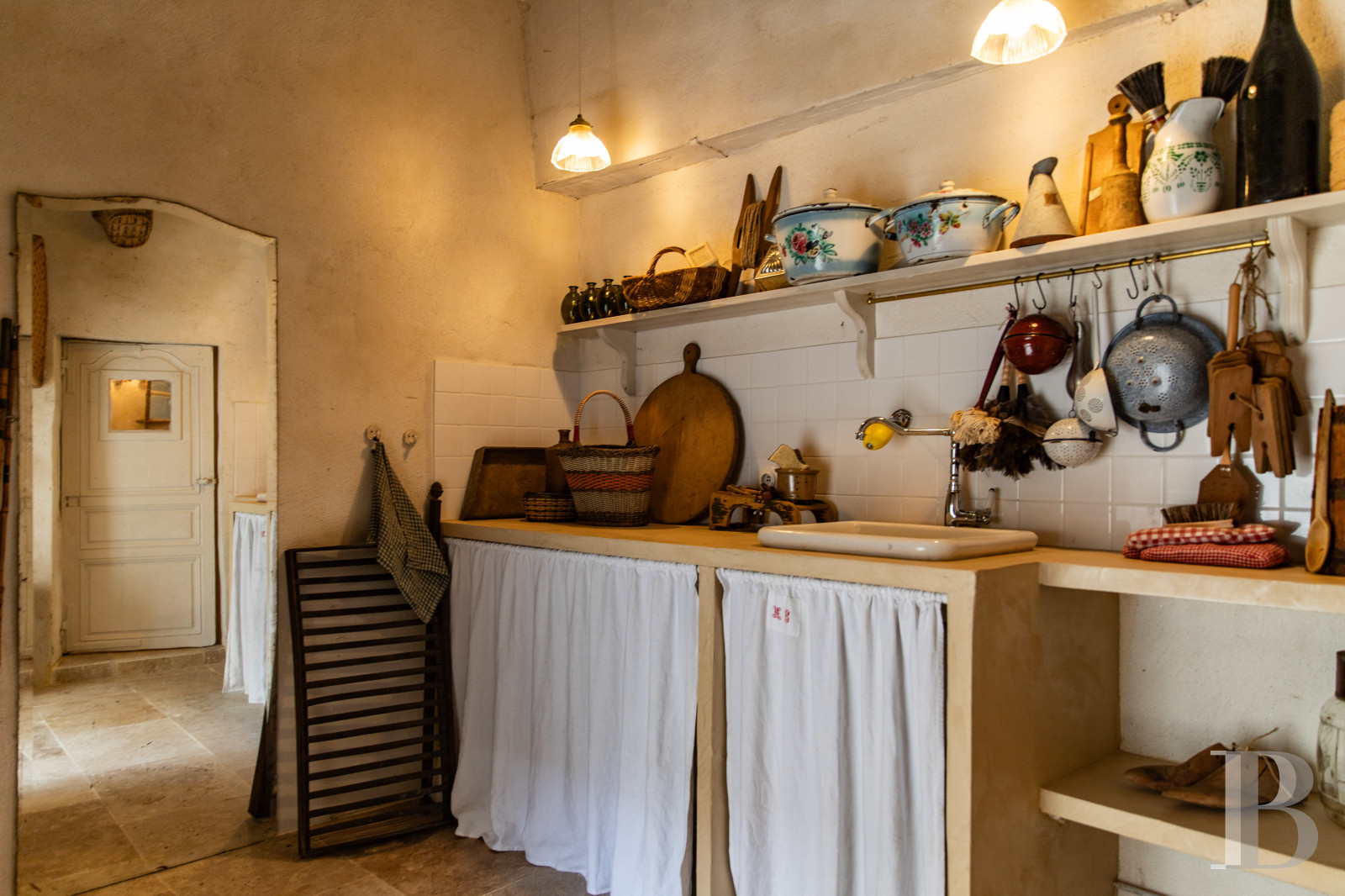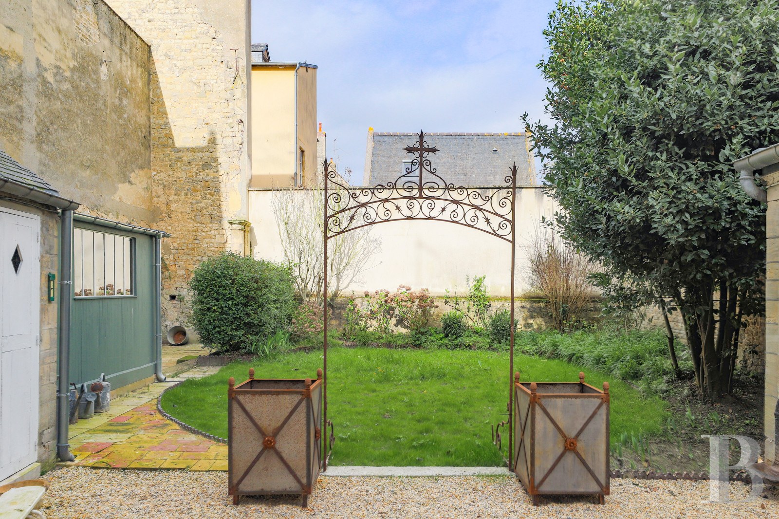 Il est ceint de murs en pierre sèche et de mitoyennetés historiques qui témoignent de l’évolution du quartier. Deux vestiges de colonne antique, adossés à une paroi en pierre de taille, rappellent aussi l'histoire millénaire de Bayeux. Des arbustes persistants et des massifs ponctuent l'ensemble. En retour d’équerre, une aile basse abrite d’un côté la cuisine, de l’autre une buanderie, autour de la terrasse gravillonnée.La buanderie