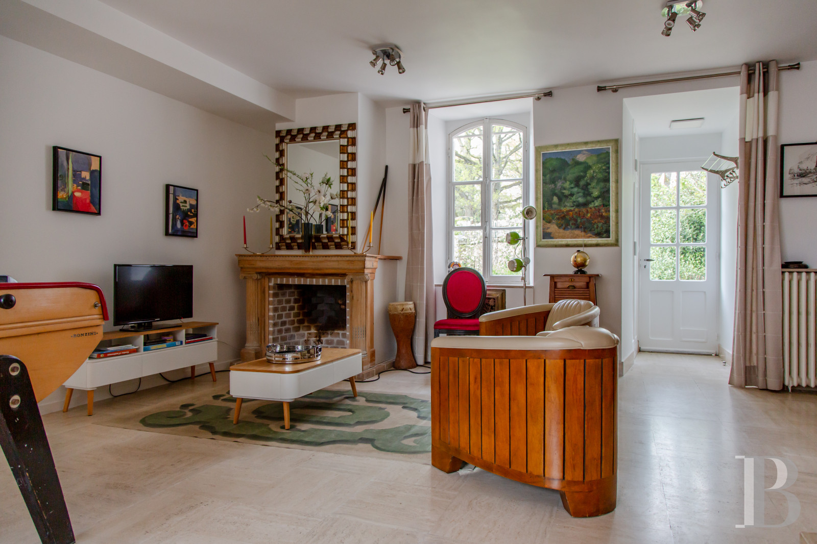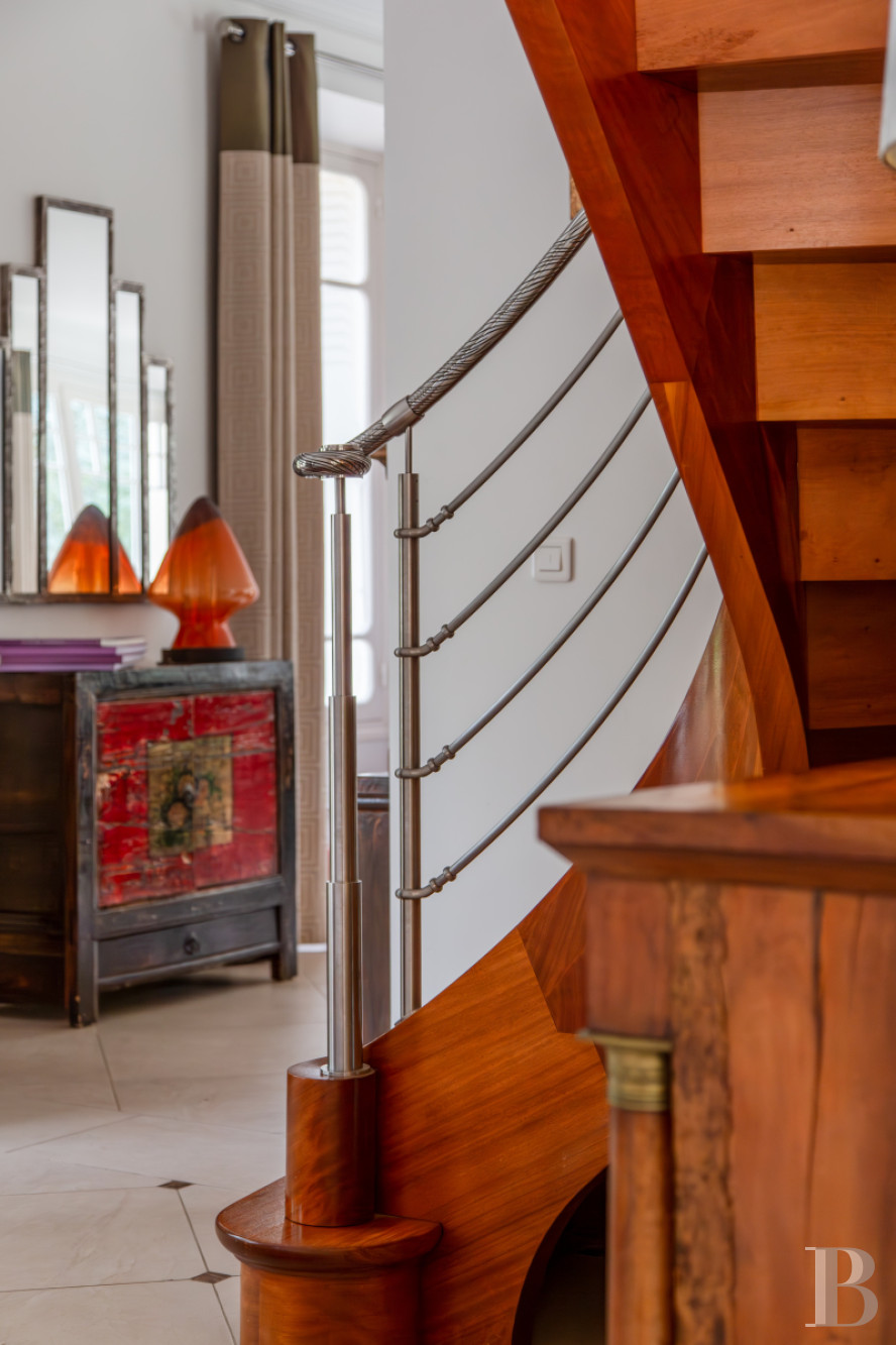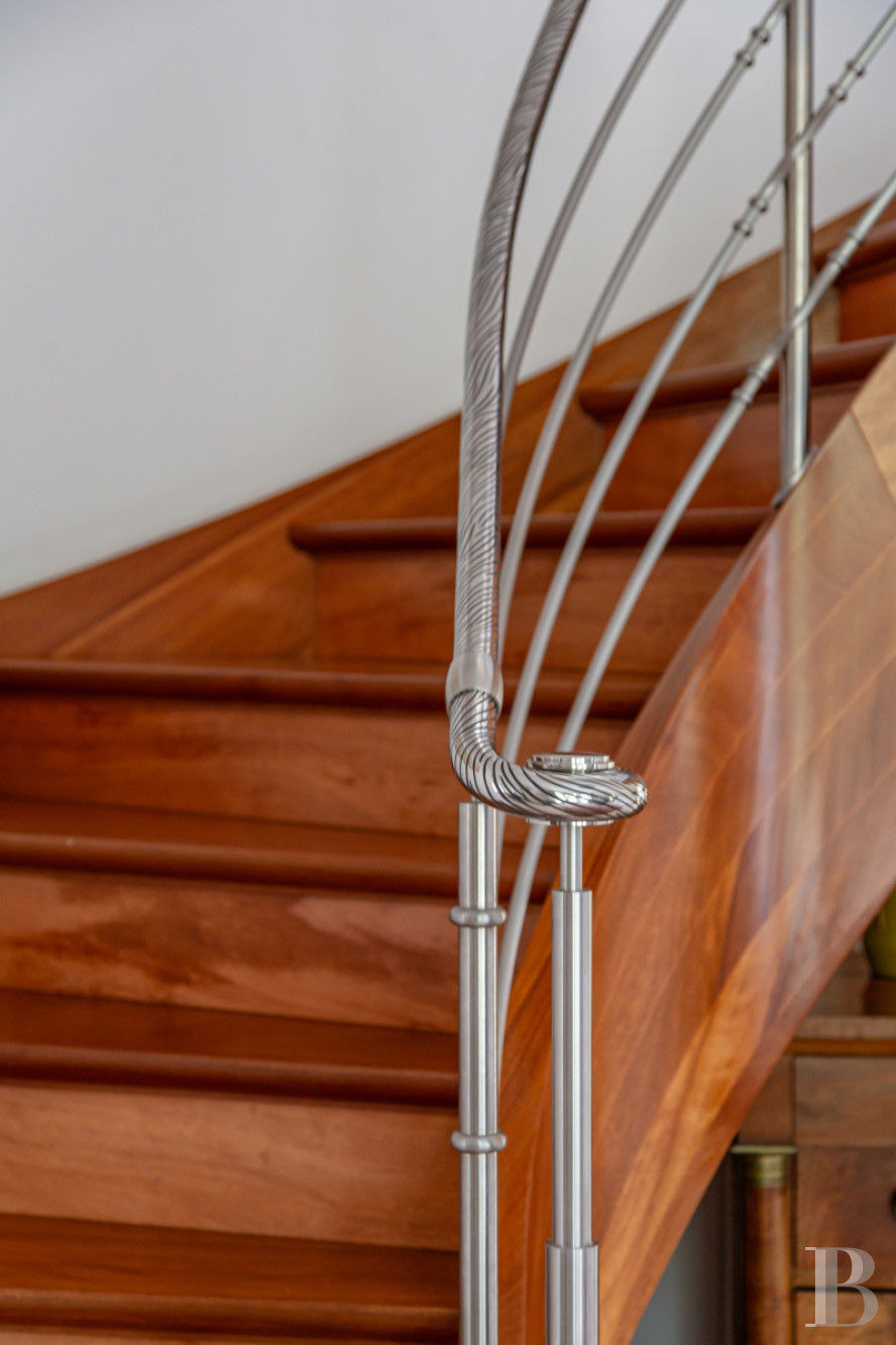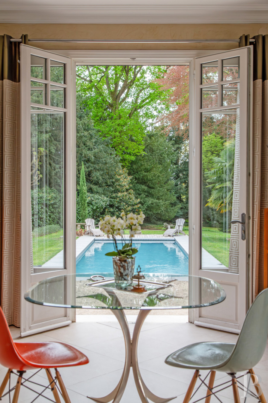 Le salon et la salle à manger placés en enfilade constituent un vaste lieu de vie dédié à la réception. Ils s’ouvrent largement sur le jardin et sont baignés d’une lumière douce que filtrent de hautes portes-fenêtres aux lignes classiques. Le regard circule librement, porté par des volumes qu’amplifie la hauteur sous plafond.De part et d’autre, des ouvertures cintrées rythment les murs et signalent une architecture soignée, empreinte d’une certaine idée du confort bourgeois des siècles passés. Le sol, habillé de larges dalles claires, prolonge la sensation d’espace, tandis que la cheminée, discrètement installée, suggère des moments plus intimes.Ici, tout semble pensé pour vivre en harmonie avec l’extérieur : le jardin entre dans la maison, au fil des saisons, comme une présence familière. L’ensemble forme un lieu chaleureux, où la simplicité des lignes dialogue avec le caractère.La cuisine avec ses espaces lumineux et fluides ouvre également sur le parc. Dans l’entrée, un escalier tournant en acajou, souligné d’une rampe en inox réalisée par les compagnons de Saint-Rémy-lès-Chevreuse au sein de la fondation de Coubertin, constitue une remarquable pièce d’architecture.
