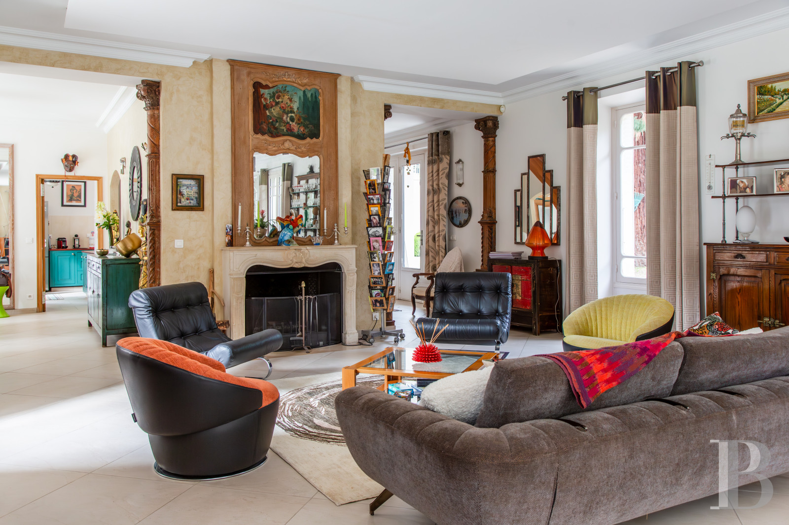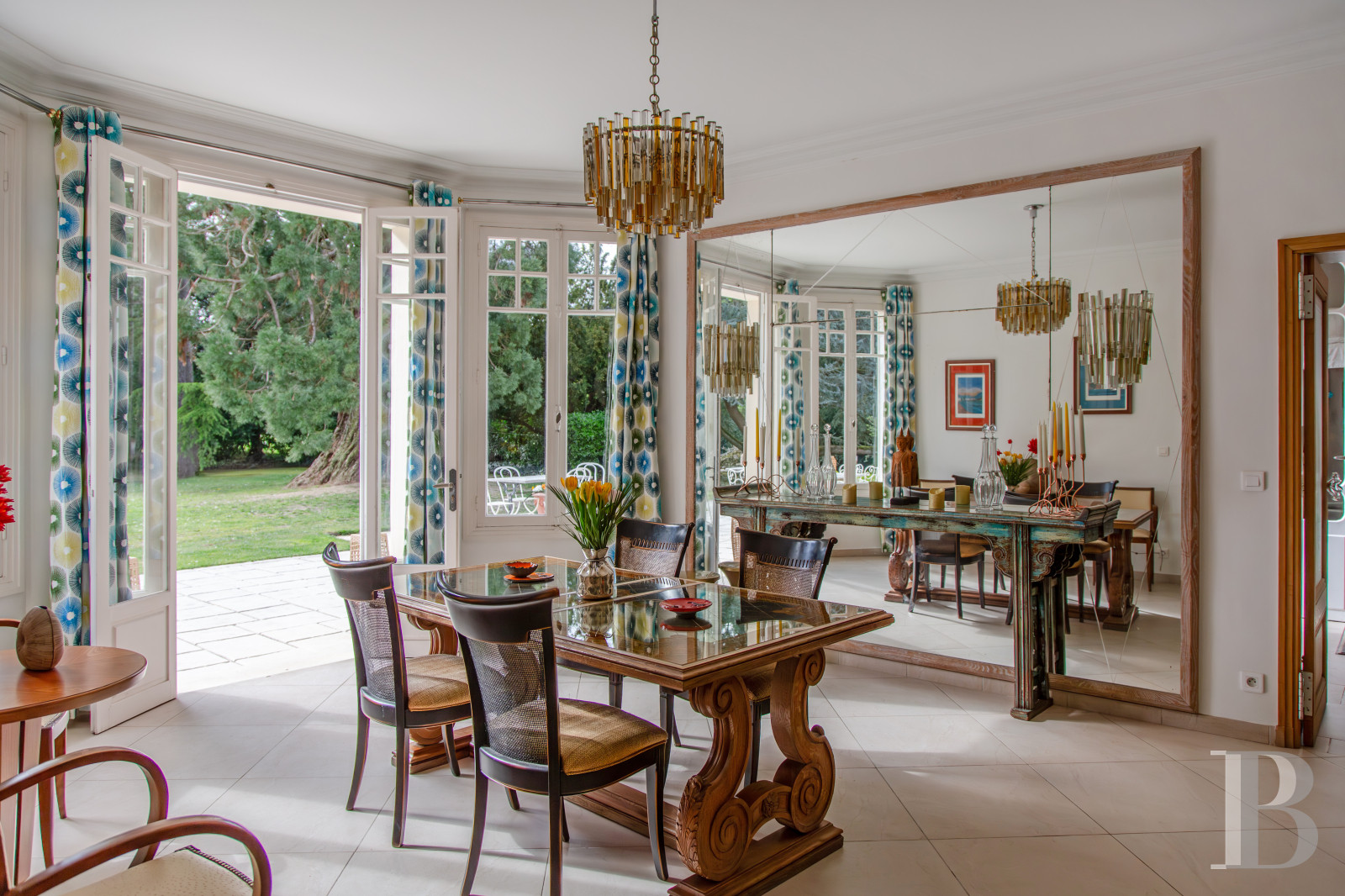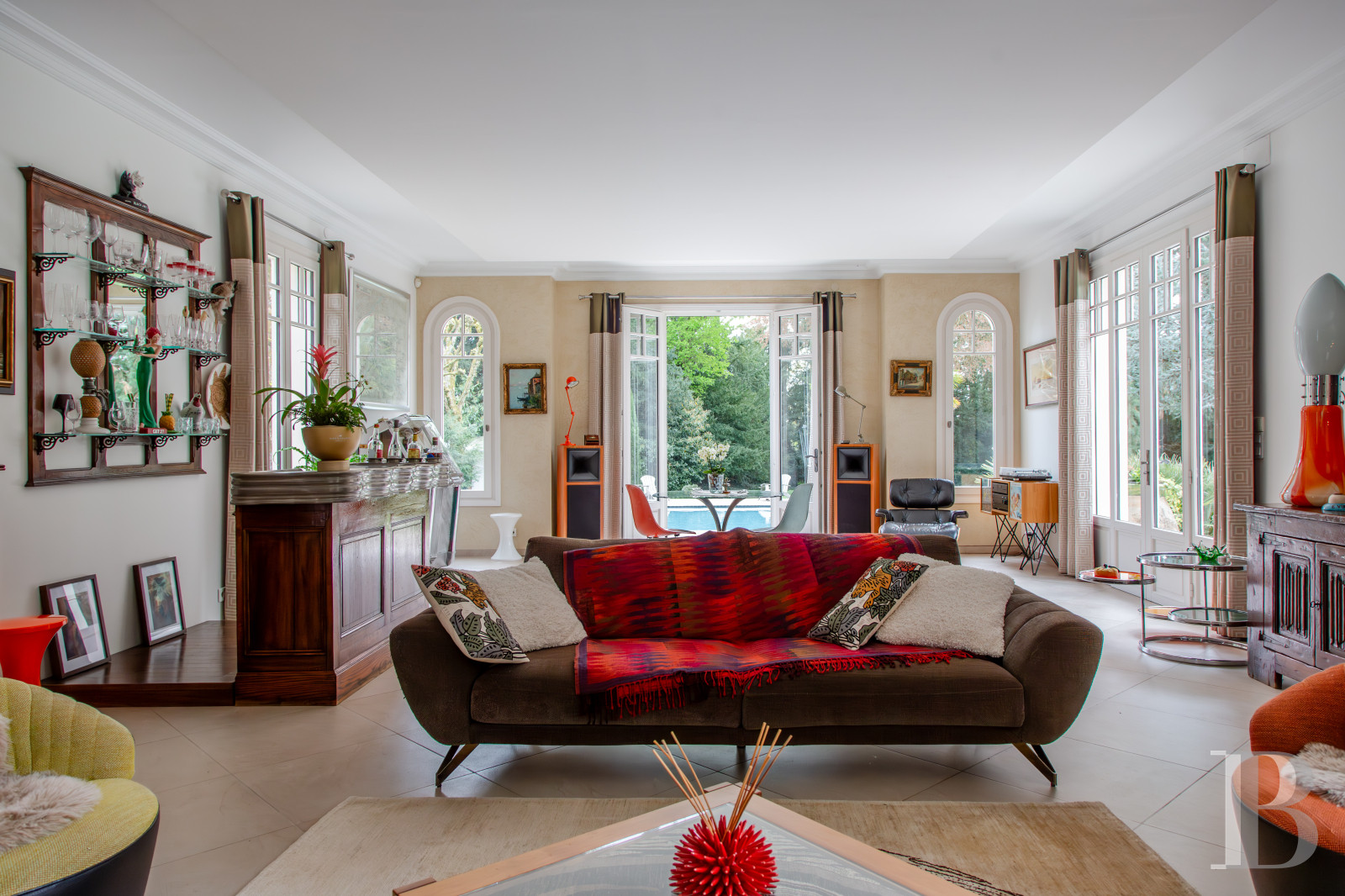 Le salon et la salle à manger placés en enfilade constituent un vaste lieu de vie dédié à la réception. Ils s’ouvrent largement sur le jardin et sont baignés d’une lumière douce que filtrent de hautes portes-fenêtres aux lignes classiques. Le regard circule librement, porté par des volumes qu’amplifie la hauteur sous plafond.De part et d’autre, des ouvertures cintrées rythment les murs et signalent une architecture soignée, empreinte d’une certaine idée du confort bourgeois des siècles passés. Le sol, habillé de larges dalles claires, prolonge la sensation d’espace, tandis que la cheminée, discrètement installée, suggère des moments plus intimes.Ici, tout semble pensé pour vivre en harmonie avec l’extérieur : le jardin entre dans la maison, au fil des saisons, comme une présence familière. L’ensemble forme un lieu chaleureux, où la simplicité des lignes dialogue avec le caractère.La cuisine avec ses espaces lumineux et fluides ouvre également sur le parc. Dans l’entrée, un escalier tournant en acajou, souligné d’une rampe en inox réalisée par les compagnons de Saint-Rémy-lès-Chevreuse au sein de la fondation de Coubertin, constitue une remarquable pièce d’architecture.