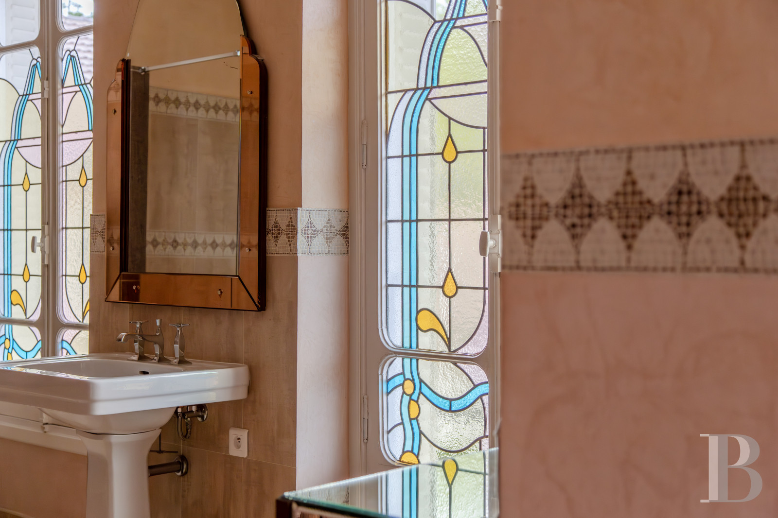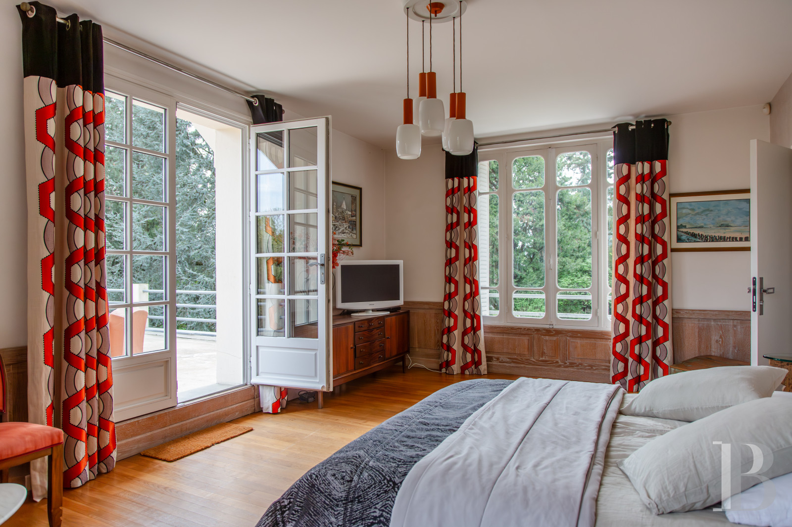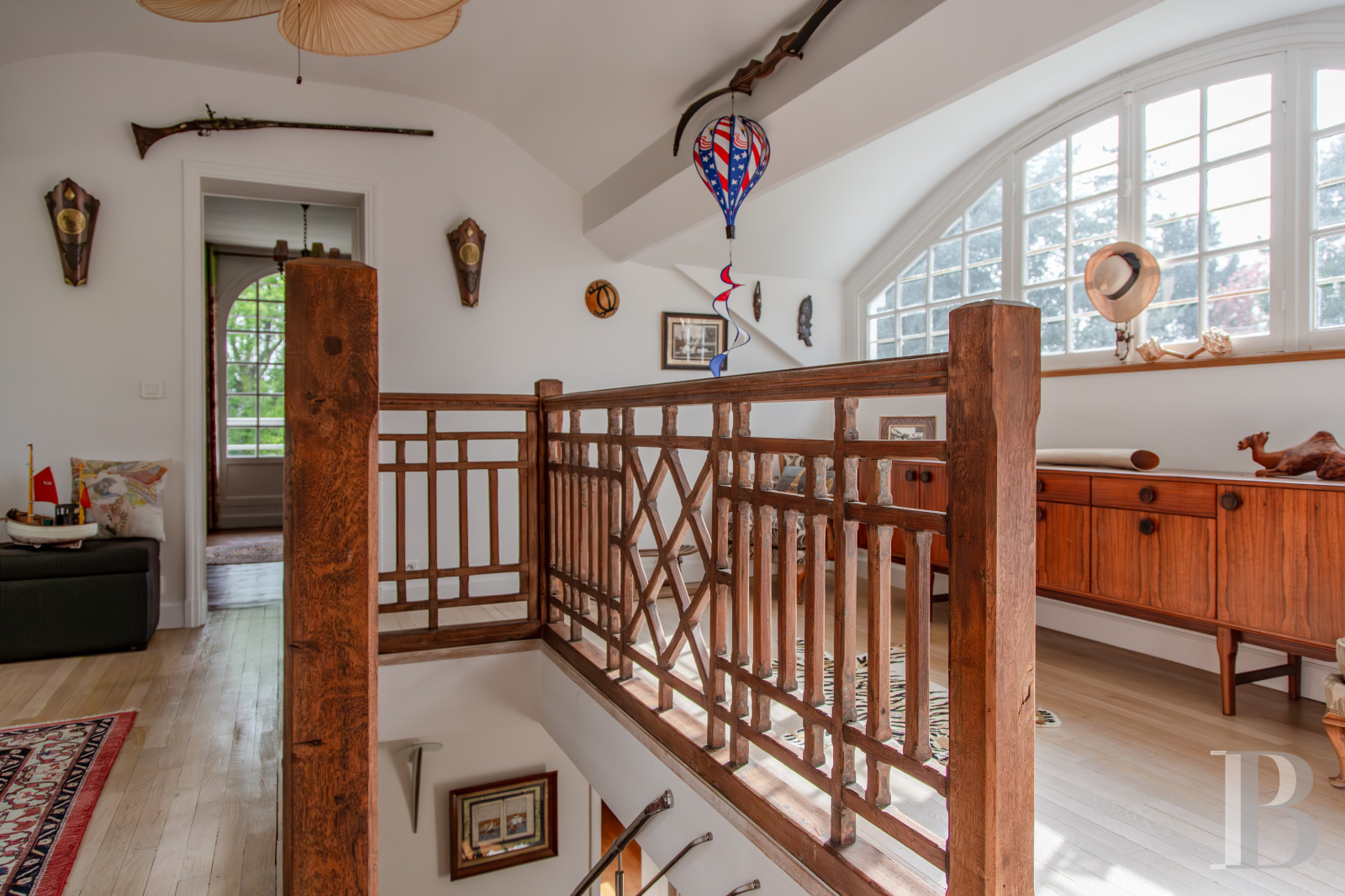 Une vaste mezzanine, ouverte et lumineuse, constitue un espace de vie aux usages multiples. Un bureau — qui peut aisément faire office de chambre — s’ajoute à l’espace.La chambre principale, tournée vers l’ouest, s’ouvre sur une terrasse avec une vue dégagée sur la piscine et sur le parc. Elle se distingue par une salle de bains dont les fenêtres à vitraux ainsi que le vaste vestiaire intégré apportent un caractère singulier. Une douche à l'italienne confortable fait partie intégrante de la pièce.