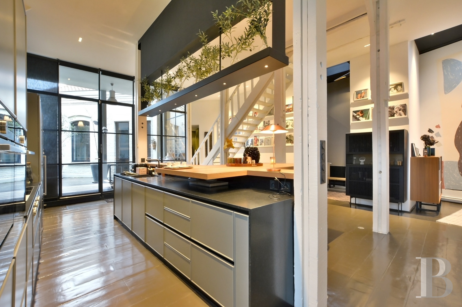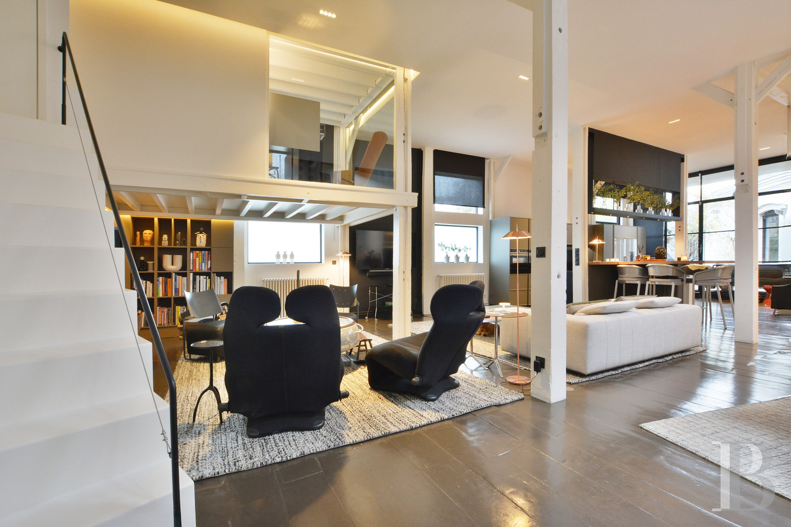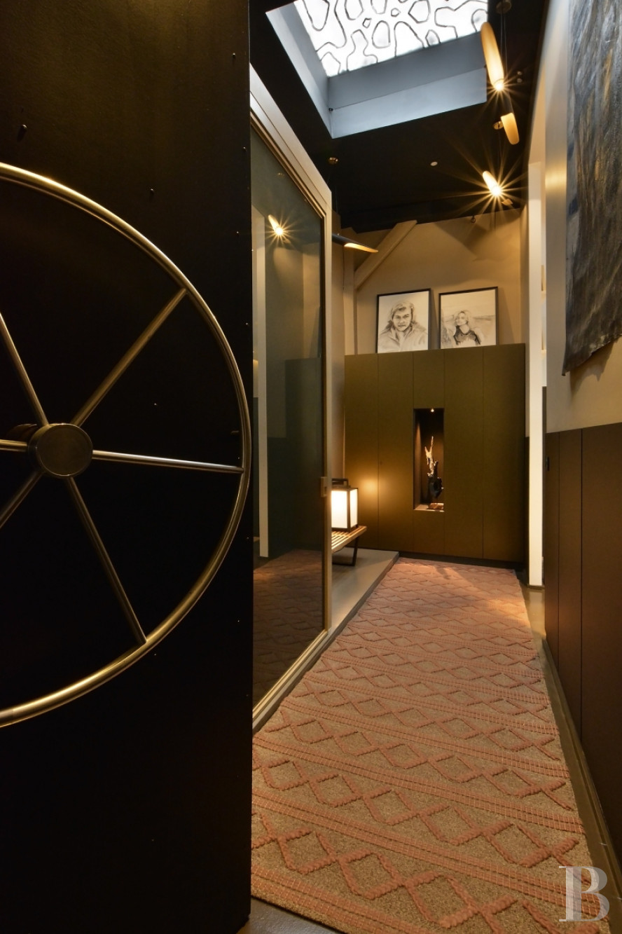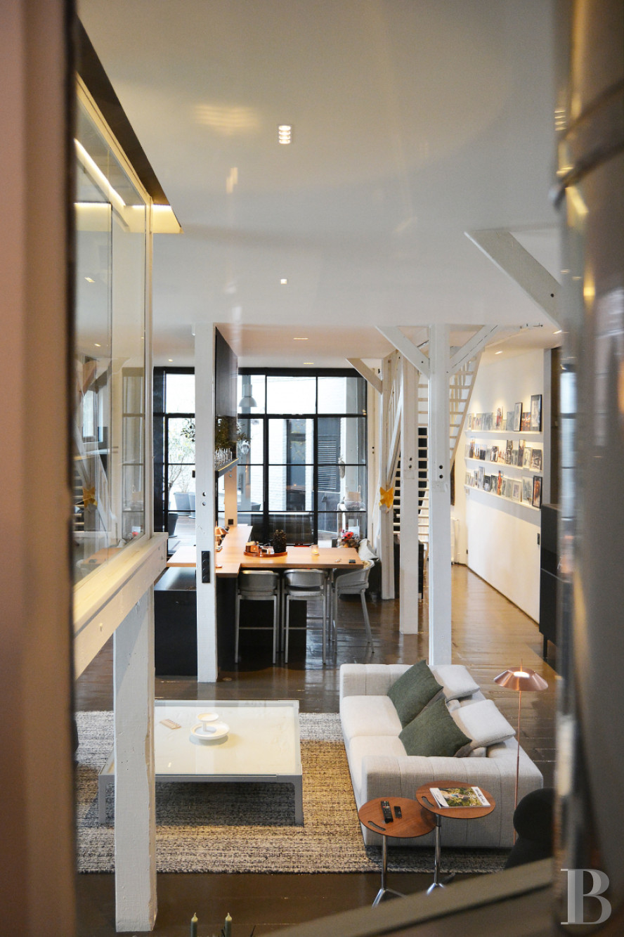 Un bien qui s’adresse aux amateurs de lofts de style moderniste, avec de grands volumes ouverts et une vraie cohérence dans l’aménagement. L’ancien bâtiment a été transformé avec des choix contemporains, comme les sols en béton ciré, les parquets à larges lattes, l’imposante baie vitrée et les jeux de niveaux, qui apportent beaucoup de lumière et une circulation fluide entre les espaces décloisonnés.