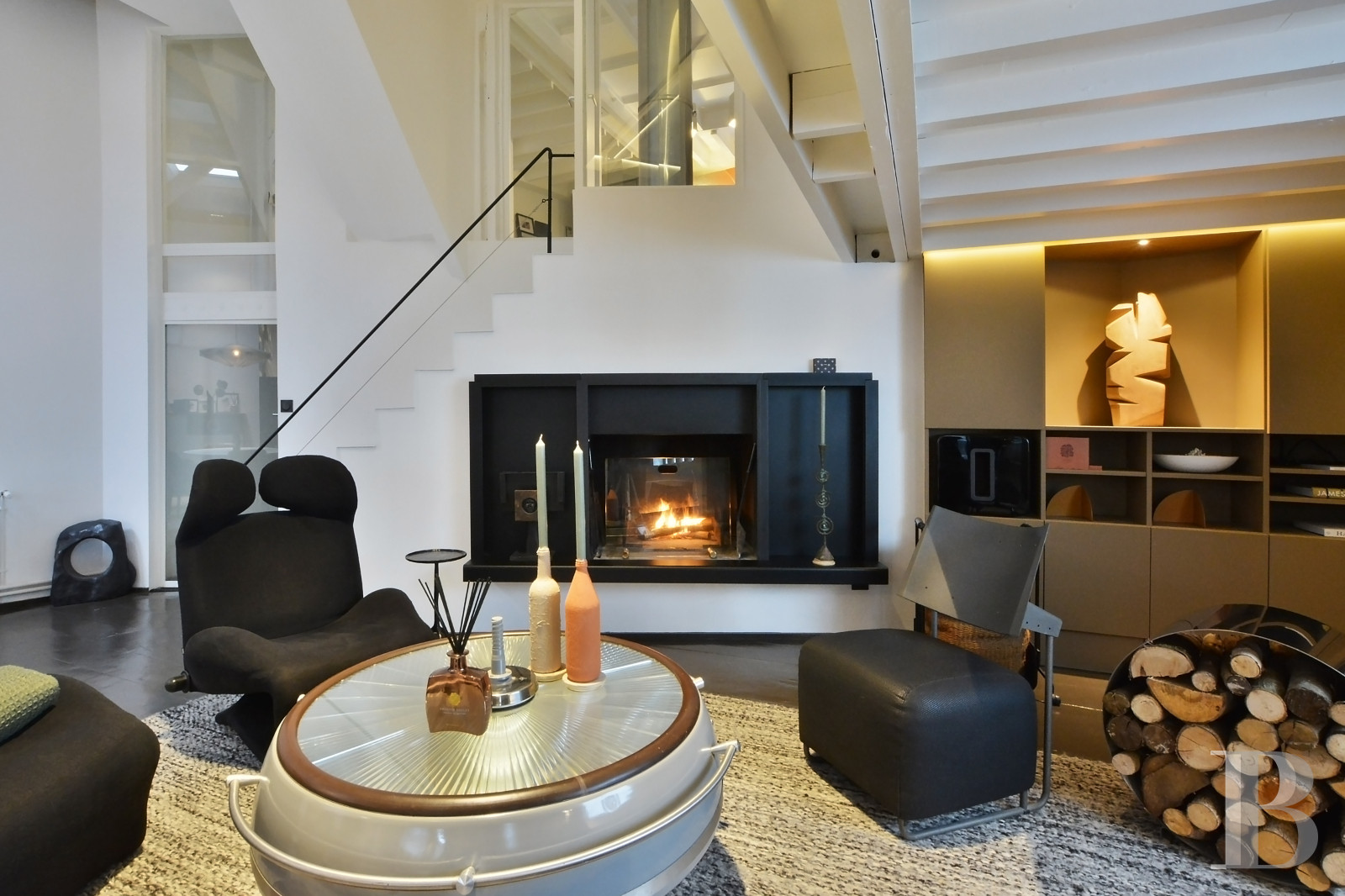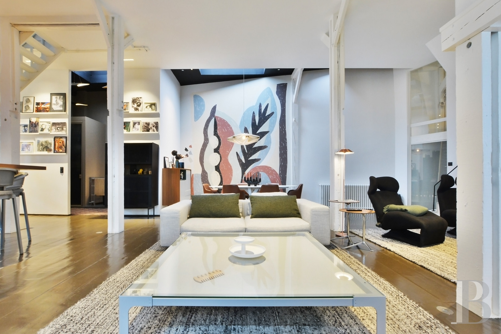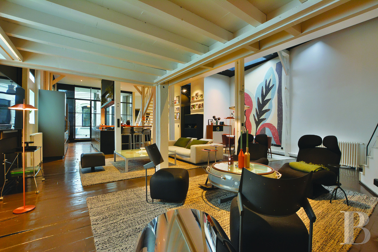 Un bien qui s’adresse aux amateurs de lofts de style moderniste, avec de grands volumes ouverts et une vraie cohérence dans l’aménagement. L’ancien bâtiment a été transformé avec des choix contemporains, comme les sols en béton ciré, les parquets à larges lattes, l’imposante baie vitrée et les jeux de niveaux, qui apportent beaucoup de lumière et une circulation fluide entre les espaces décloisonnés.