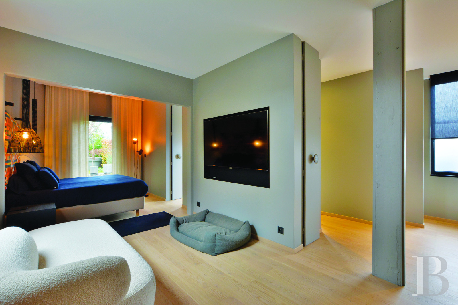 Un hall d’entrée conduit à un vaste espace de vie réparti en un seul et grand volume. La structure porteuse en bois peint en blanc rythme l’endroit et délimite les différentes zones. Les sols, revêtus d’un parquet droit à larges lattes d’un vert olive profond, renforcent l’esthétique moderne de la réhabilitation. L’ensemble profite d’une abondante lumière naturelle grâce à la baie vitrée à cadre noir et à grands carreaux. La cuisine qui lui fait face est ouverte et composée d’un îlot central en granit noir et bois clair. Dans son prolongement se trouve un premier salon, au centre, avec à l’arrière un espace salle à manger qui bénéficie d’un éclairage zénithal juste au-dessus de la table. Une atmosphère florale imprègne la pièce que décore une fresque de style minimaliste, à la manière d’Henri Matisse. Un second salon, situé dans la continuité, s’articule autour d’une cheminée en métal foncé intégrée à un escalier qui mène à une mezzanine vitrée en surplomb. En retrait se trouvent les accès à la buanderie et à la cave.À proximité de la cuisine se place l’escalier principal en bois peint en blanc qui conduit à l’étage. Derrière celui-ci, la chambre principale de plain-pied bénéficie d’une double exposition sur le jardin et la terrasse. Elle comprend une zone de sommeil, des espaces de rangement et une salle de bains attenante.