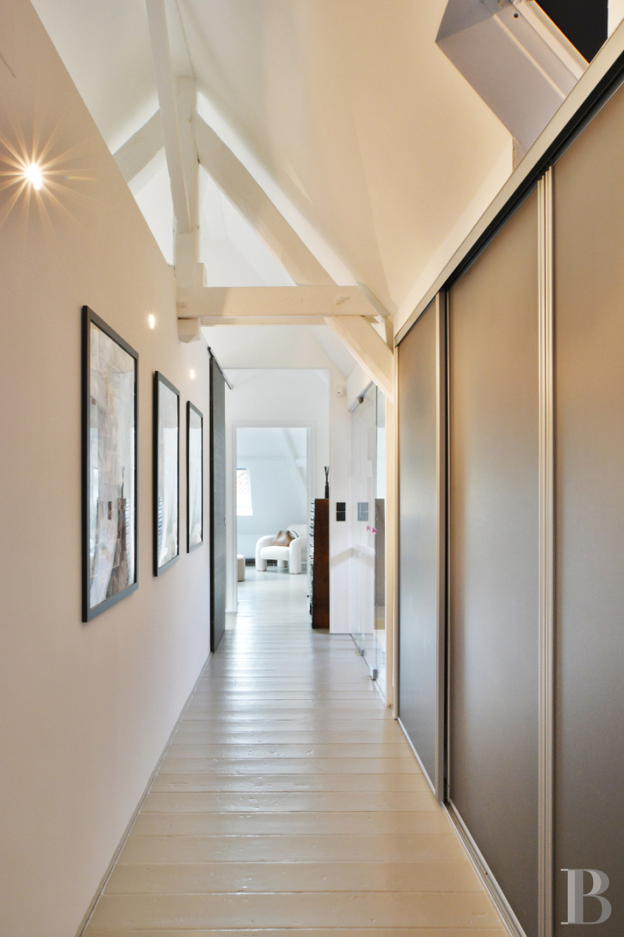 Accessible par l’escalier principal, il se répartit autour d’un long couloir bordé d’espaces de rangement et revêtu de parquets peints. Il distribue, à chaque extrémité, deux vastes chambres aménagées sous la pente du toit. Chacune dispose de sa propre salle de bains. Enfin, un studio autonome est situé au même niveau, mais desservi via le hall d’entrée par un escalier indépendant. Il comprend une grande pièce de vie qui inclut une chambre à coucher, une petite cuisine ainsi qu’une salle de bains.