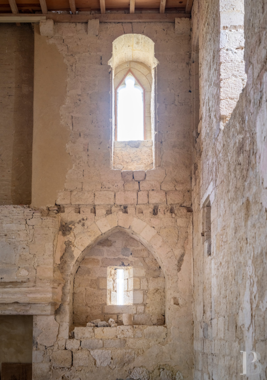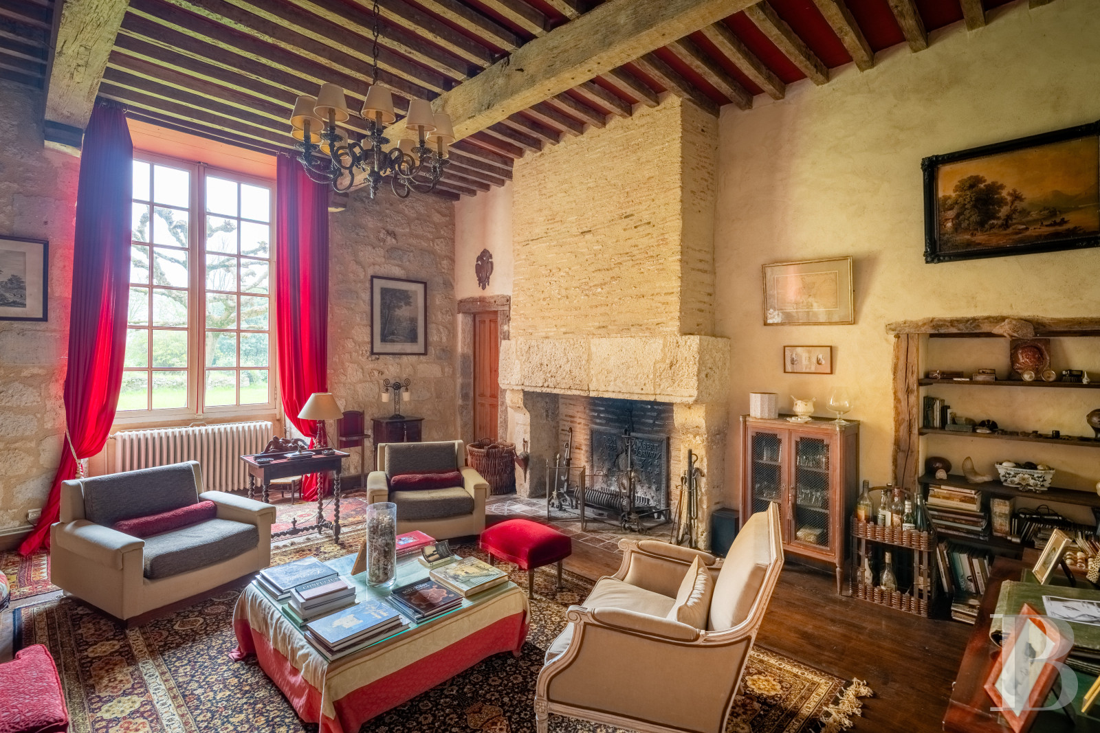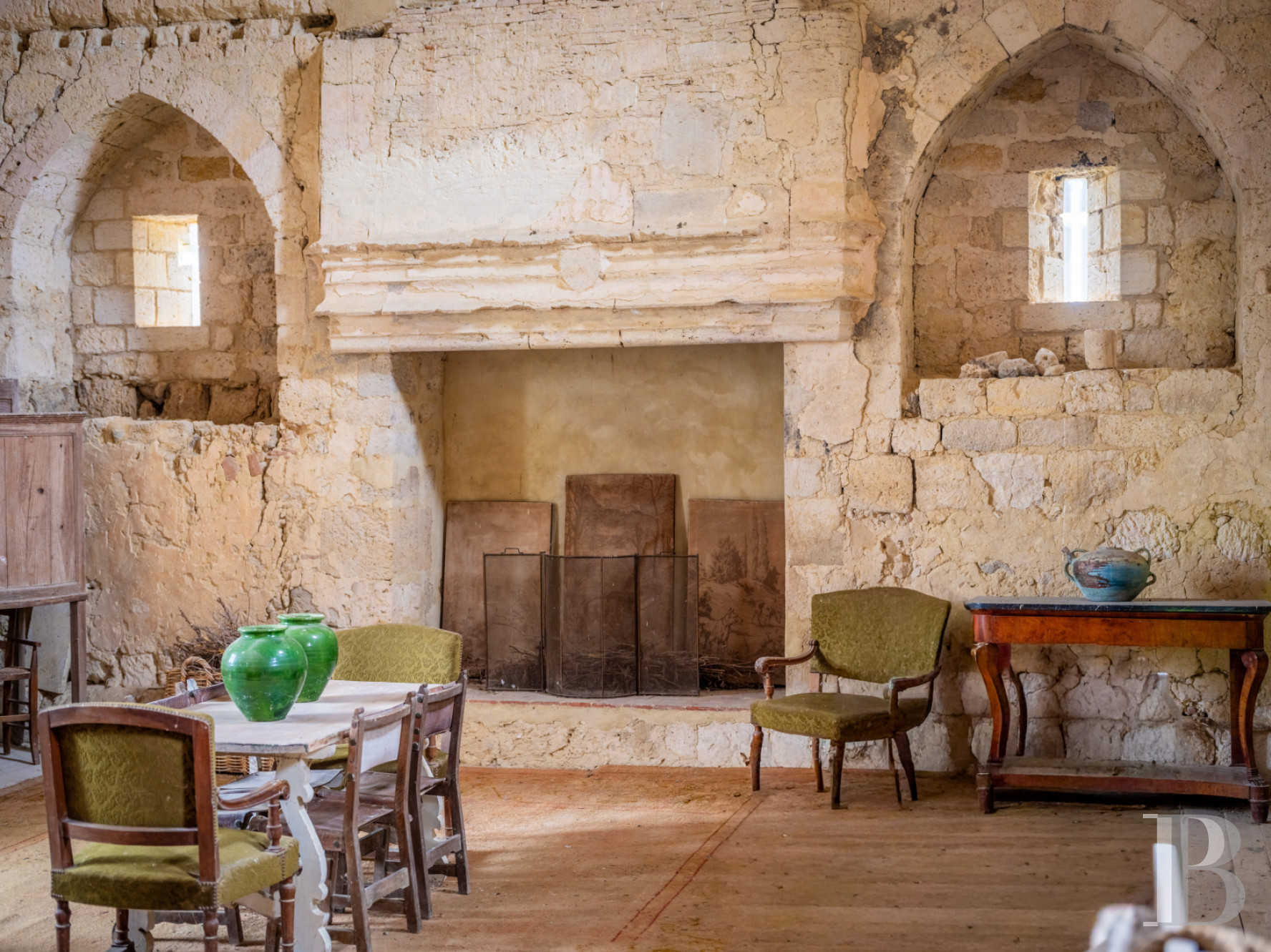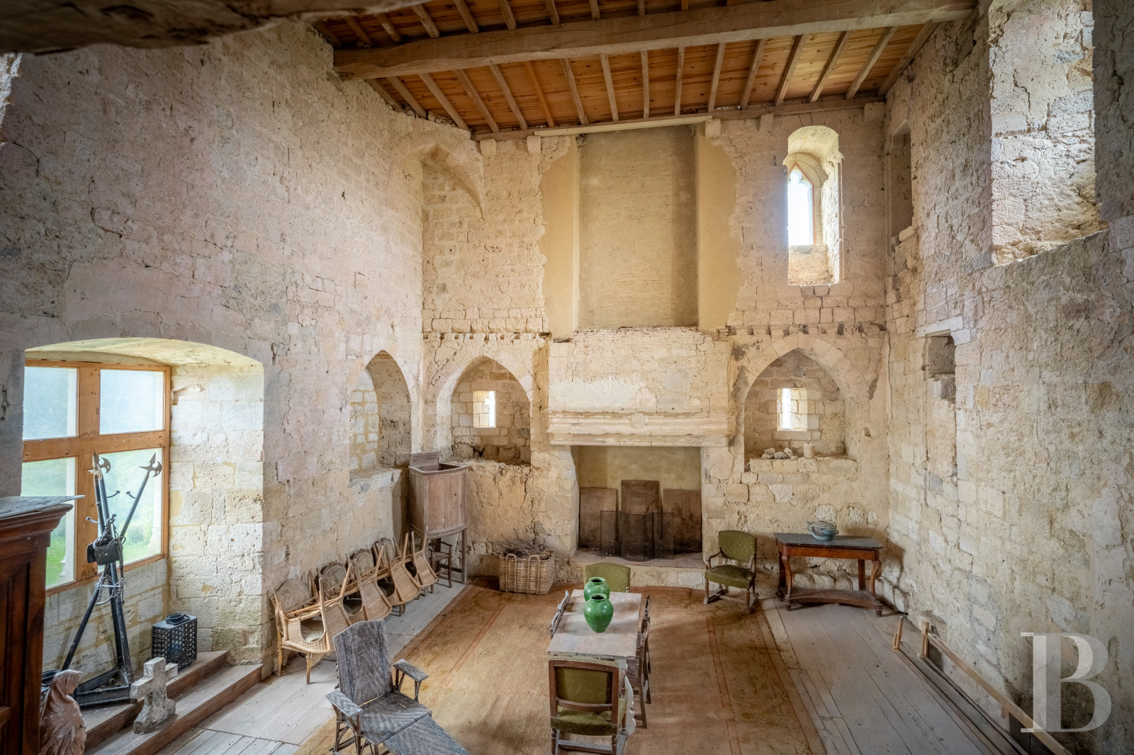 Accessible depuis la cave de l’habitation et depuis le jardin à l’est, via un emmarchement de pierre sous un porche percé dans le prolongement de la façade principale du logis, l’espace, de plus de 120 m², est fermé sur ses quatre pans. Son mur au sud est quant à lui percé de deux larges baies, ouvrant sur le terrain qui s’étend en contrebas vers la campagne. Plus loin, une salle de réception à l’ambiance rustique et champêtre.La tour médiévale