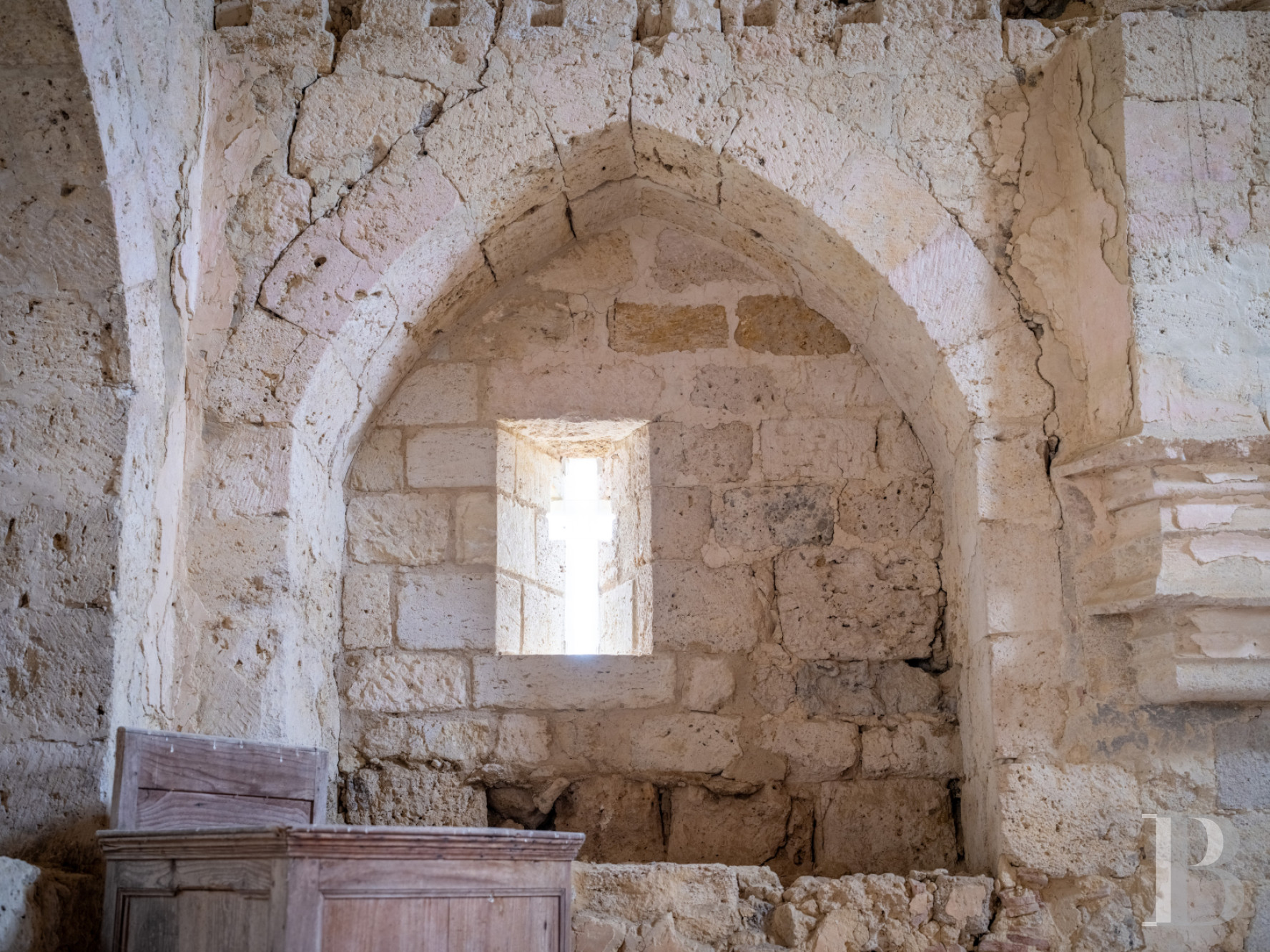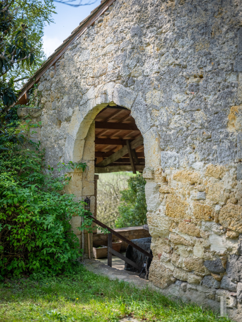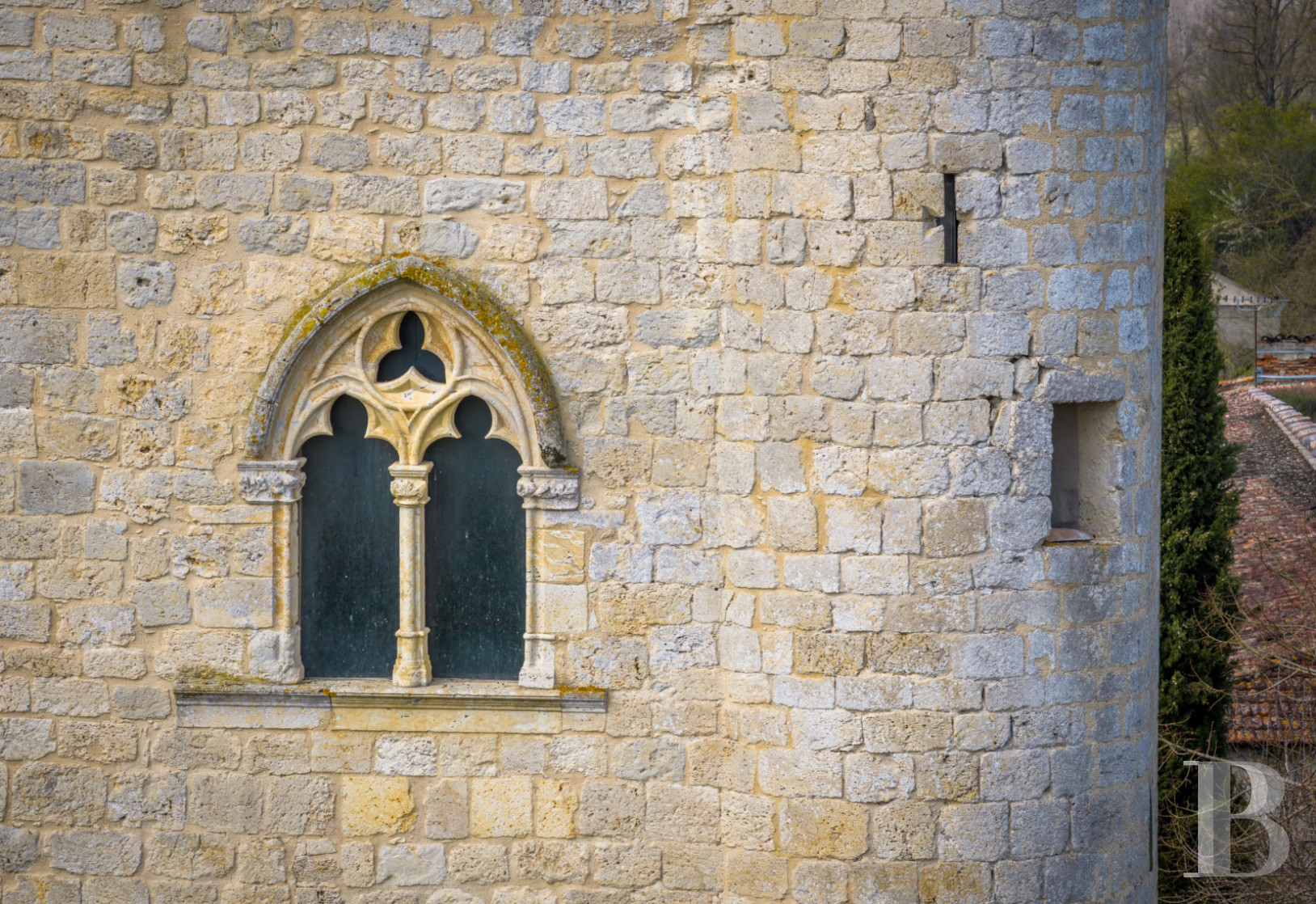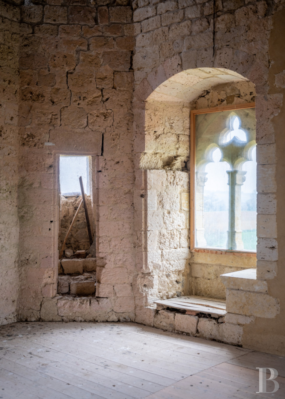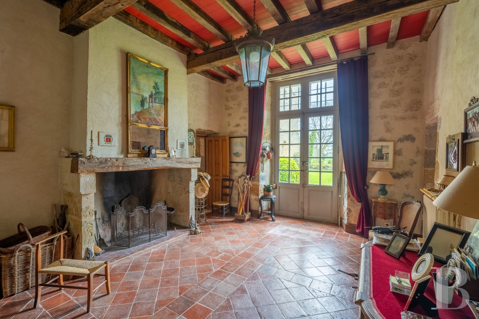 Accessible depuis la cave de l’habitation et depuis le jardin à l’est, via un emmarchement de pierre sous un porche percé dans le prolongement de la façade principale du logis, l’espace, de plus de 120 m², est fermé sur ses quatre pans. Son mur au sud est quant à lui percé de deux larges baies, ouvrant sur le terrain qui s’étend en contrebas vers la campagne. Plus loin, une salle de réception à l’ambiance rustique et champêtre.La tour médiévale