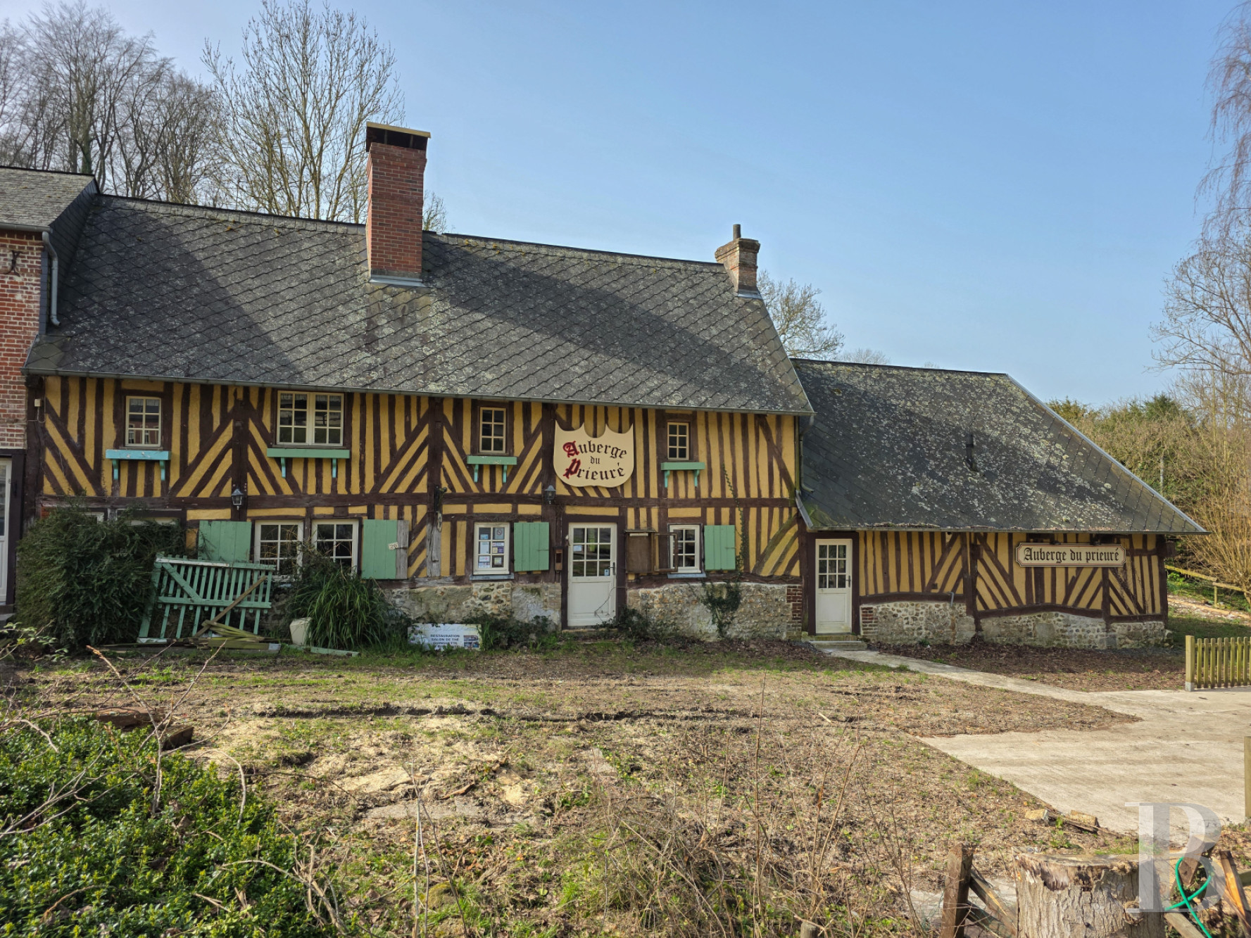 Accolée à une maison du hameau et à rénover, elle occupe un bâtiment composé de deux volumes de tailles différentes, construits à pans de bois sur un soubassement de pierre blanche. Les toitures sont en ardoise mécanique et sont surmontées de deux cheminées. Des menuiseries blanches irrégulières en bois à petits carreaux et des appuis et volets verts animent les façades. Les espaces intérieurs se déploient sous des plafonds à poutres apparentes, avec des murs à pans de bois. La partie basse est formée d'une ancienne cuisine sans équipement et de combles. Le volume le plus haut comprend un étage et des combles.Le jardin