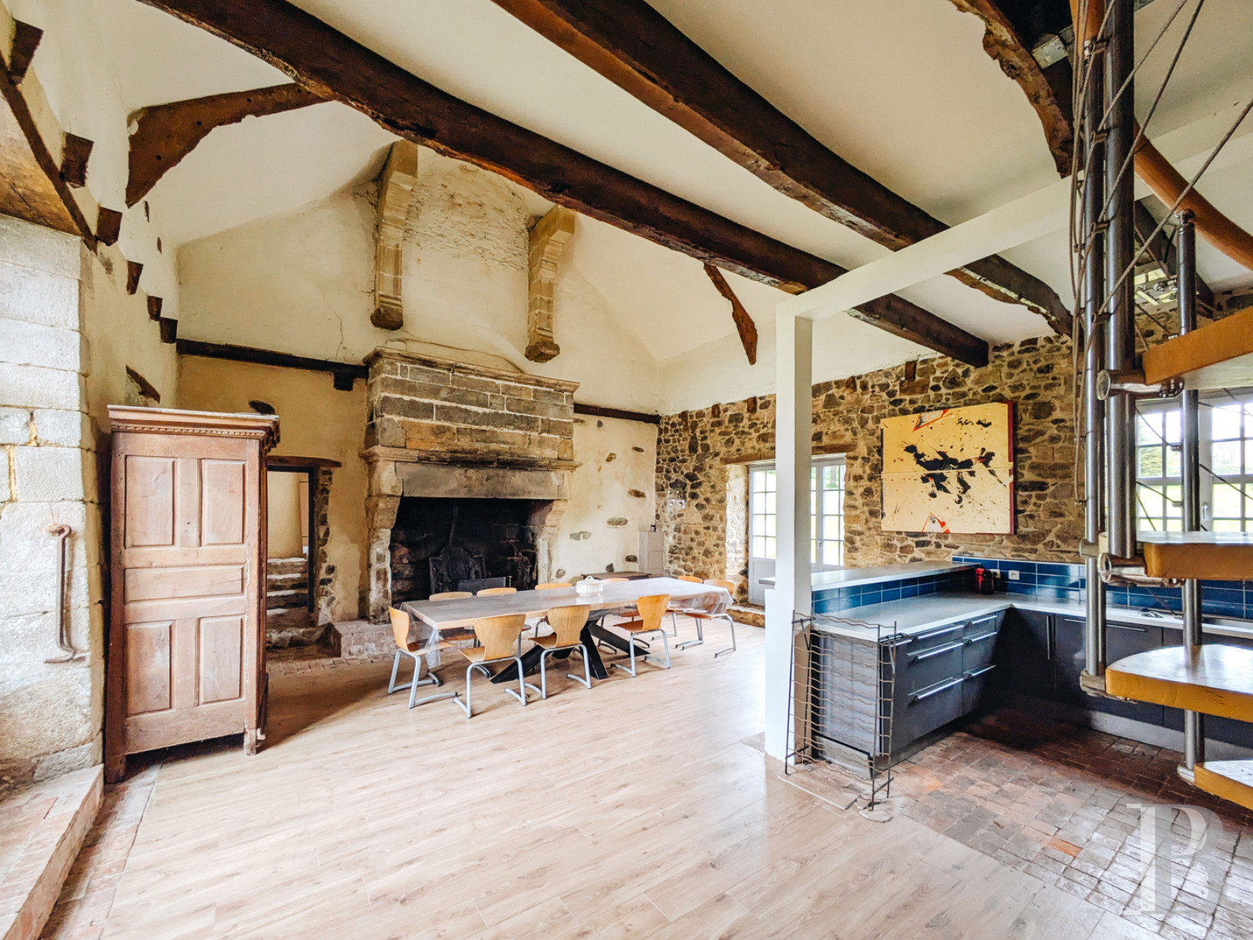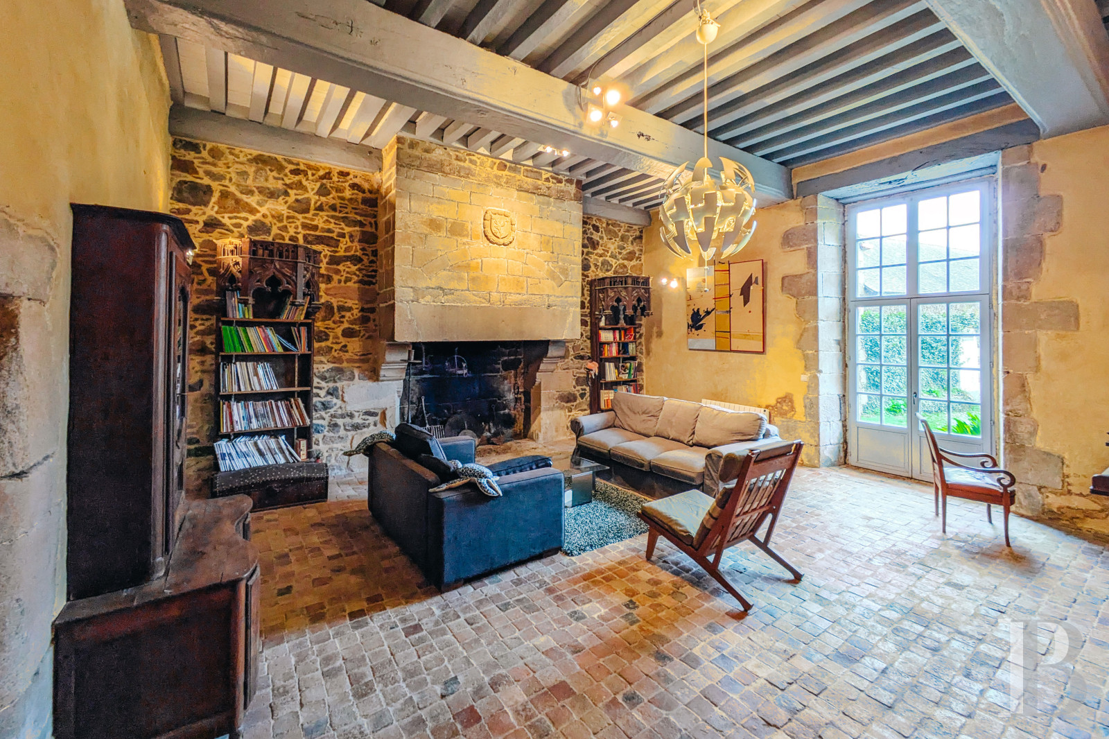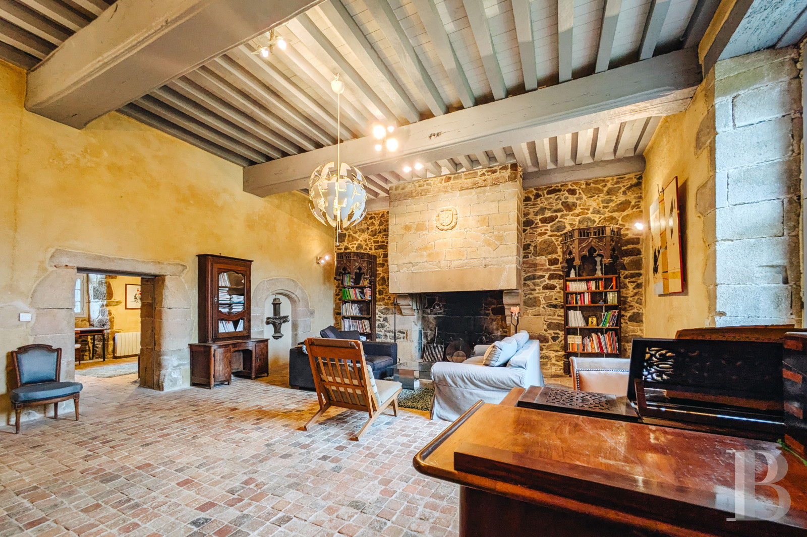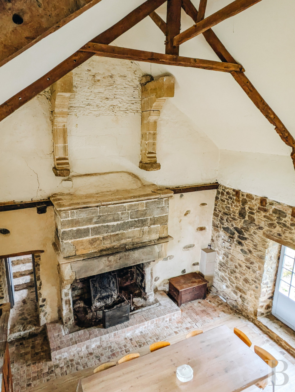 Le rez-de-chausséeLes murs de tout le niveau sont enduits à la chaux ou à pierre apparente, les sols sont parquetés ou pavés de tomettes en terre cuite. L'entrée principale accède à la salle basse centrale. Elle comprend un petit salon lumineux, où un ancien vaisselier en pierre est adossé à l'un des murs. La pièce voisine une salle d'eau, des toilettes et un espace de rangement. En enfilade, vers l'ouest, la deuxième salle basse est aménagée en salle à manger. Elle se prolonge par une cuisine ouverte moderne, qui fait face à une cheminée en granite. L'espace est éclairé par une haute porte-fenêtre et son imposte vitrée ainsi que par une lucarne au sud et une autre porte-fenêtre au nord. Le plafond cathédrale laisse apparaître des fermes de charpente et les fondations de la cheminée de l'étage supérieur du manoir, jamais terminée. À l'est, la troisième salle basse sert de salon, avec une cheminée blasonnée en granite. La hauteur sous plafond est importante et les poutres sont apparentes. Un percement dans le mur nord mène à une chambre.