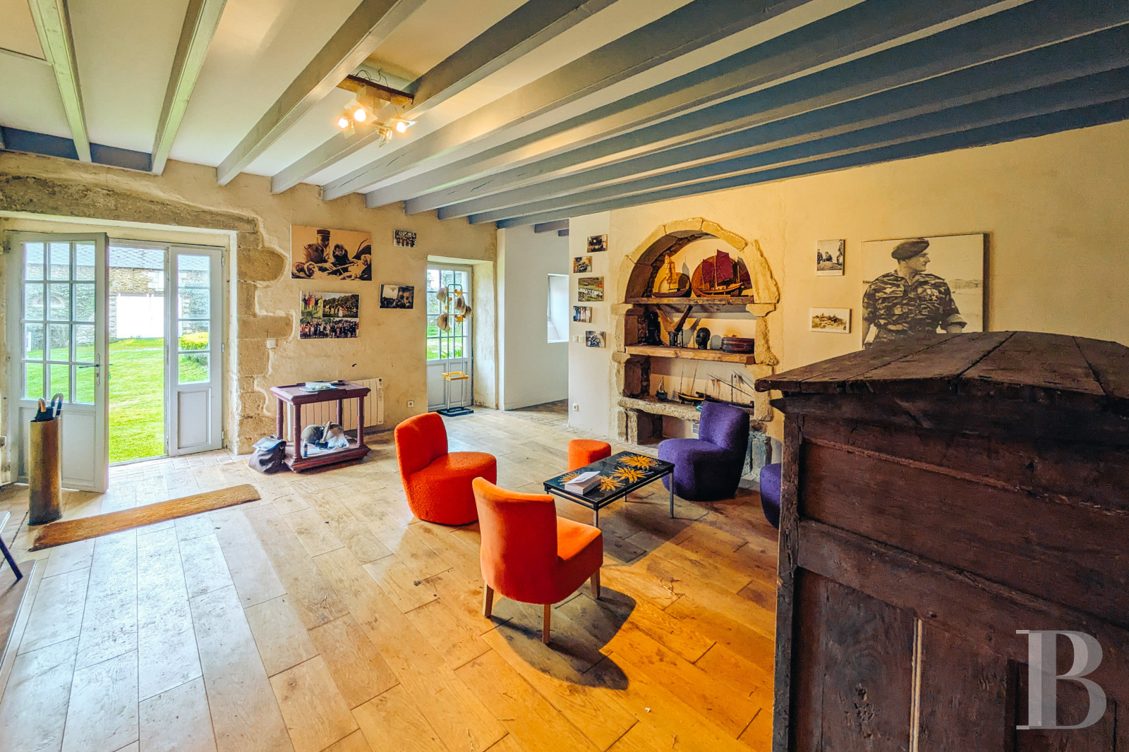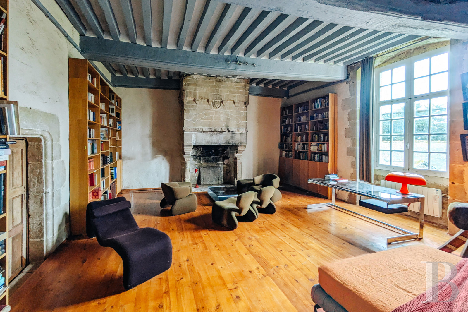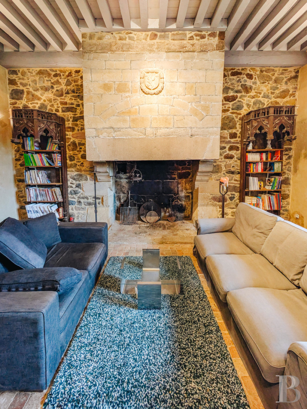 Le rez-de-chausséeLes murs de tout le niveau sont enduits à la chaux ou à pierre apparente, les sols sont parquetés ou pavés de tomettes en terre cuite. L'entrée principale accède à la salle basse centrale. Elle comprend un petit salon lumineux, où un ancien vaisselier en pierre est adossé à l'un des murs. La pièce voisine une salle d'eau, des toilettes et un espace de rangement. En enfilade, vers l'ouest, la deuxième salle basse est aménagée en salle à manger. Elle se prolonge par une cuisine ouverte moderne, qui fait face à une cheminée en granite. L'espace est éclairé par une haute porte-fenêtre et son imposte vitrée ainsi que par une lucarne au sud et une autre porte-fenêtre au nord. Le plafond cathédrale laisse apparaître des fermes de charpente et les fondations de la cheminée de l'étage supérieur du manoir, jamais terminée. À l'est, la troisième salle basse sert de salon, avec une cheminée blasonnée en granite. La hauteur sous plafond est importante et les poutres sont apparentes. Un percement dans le mur nord mène à une chambre.