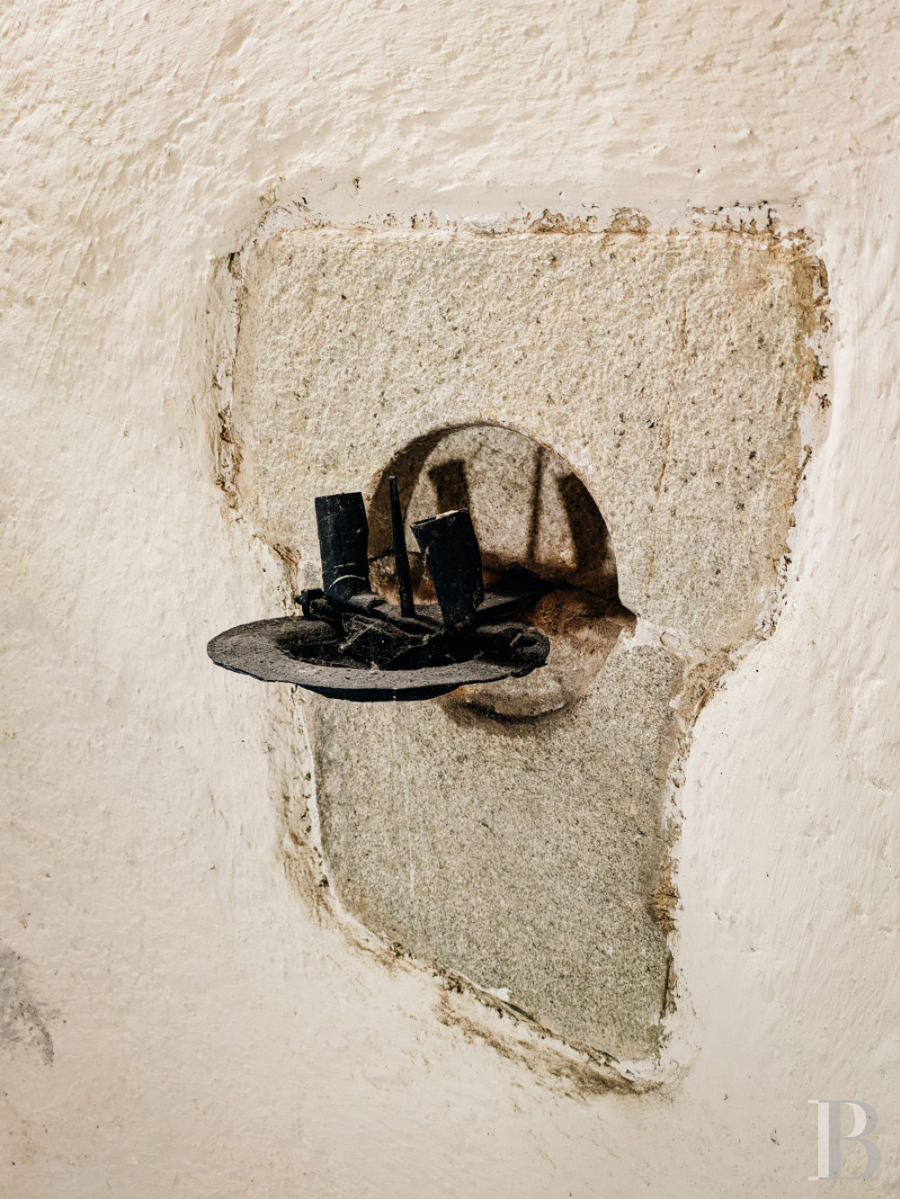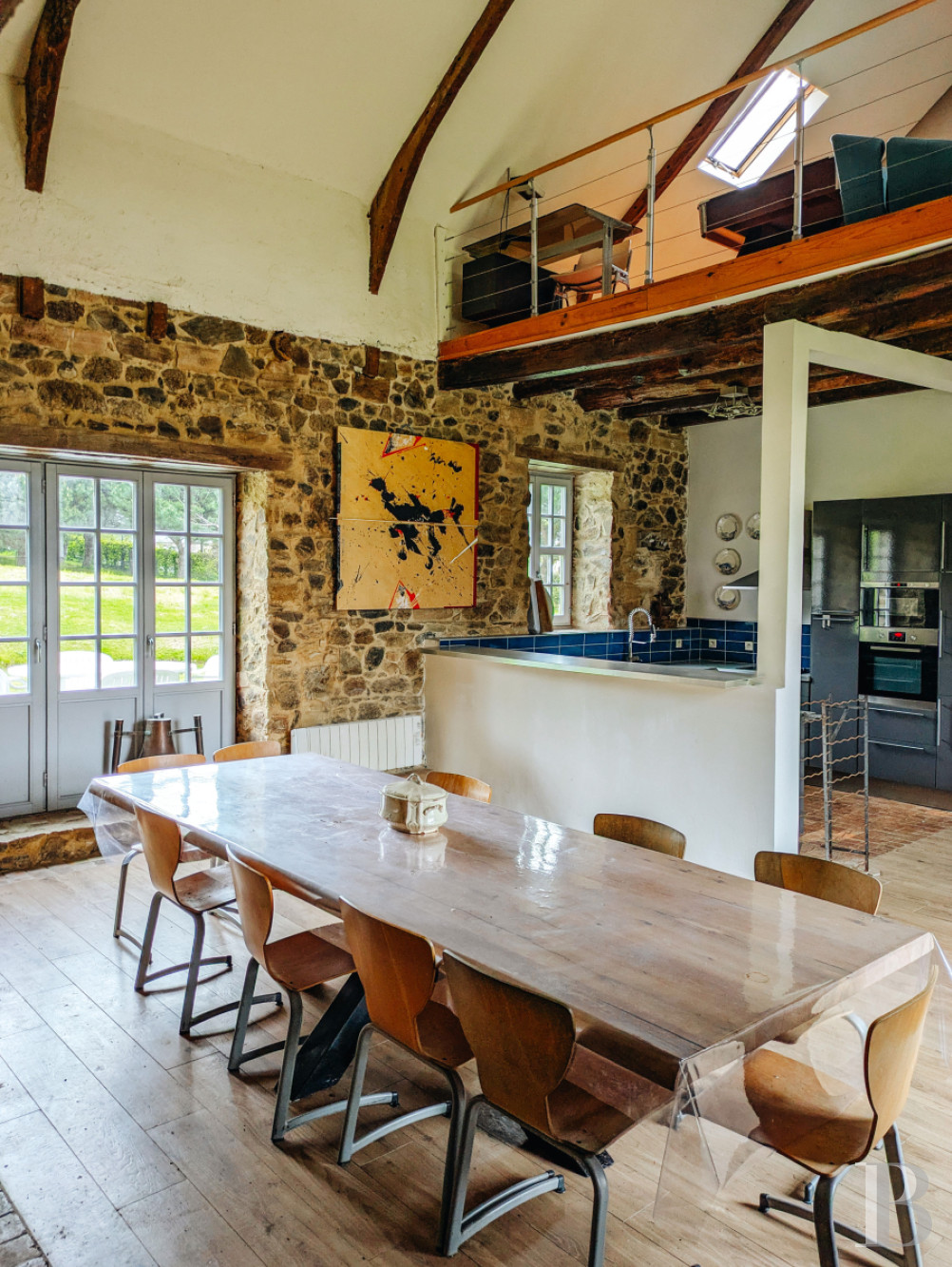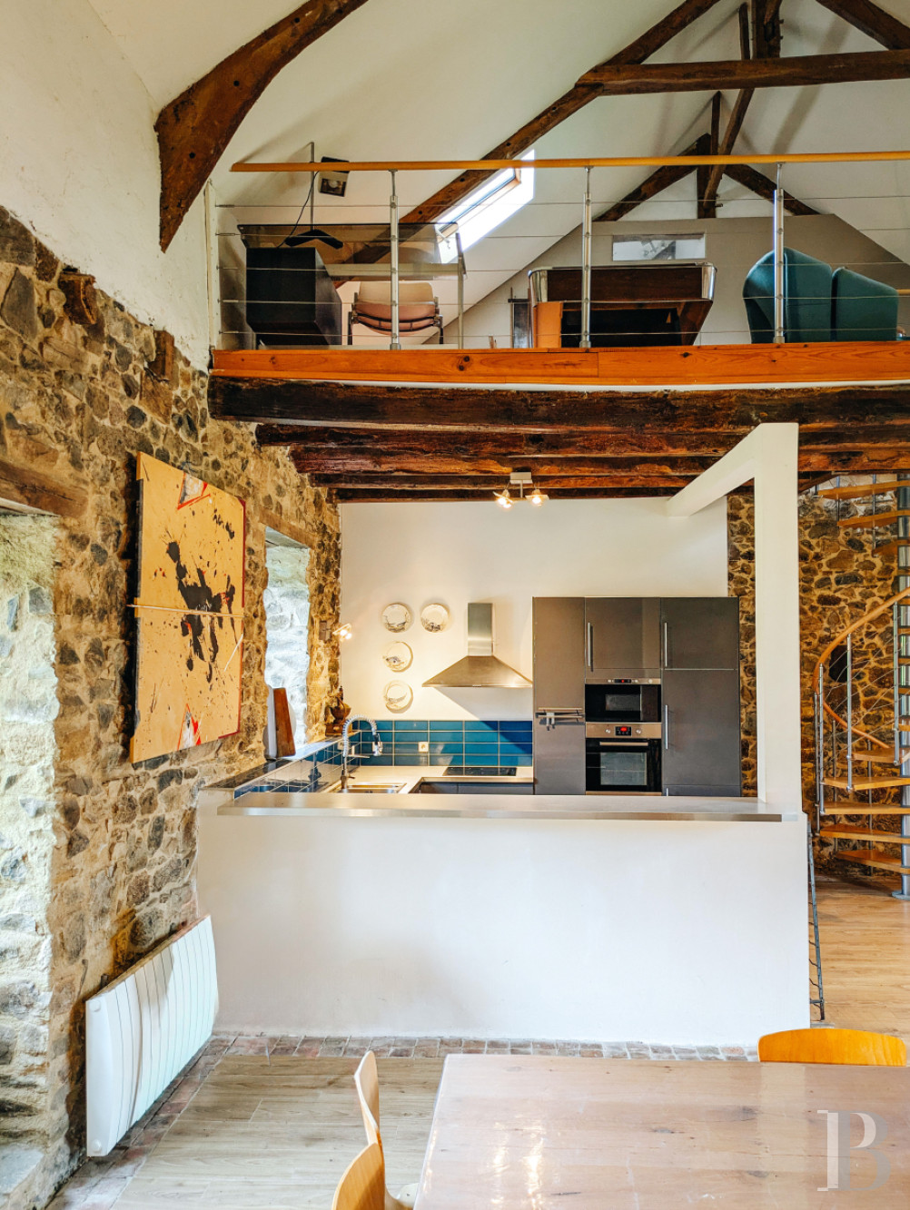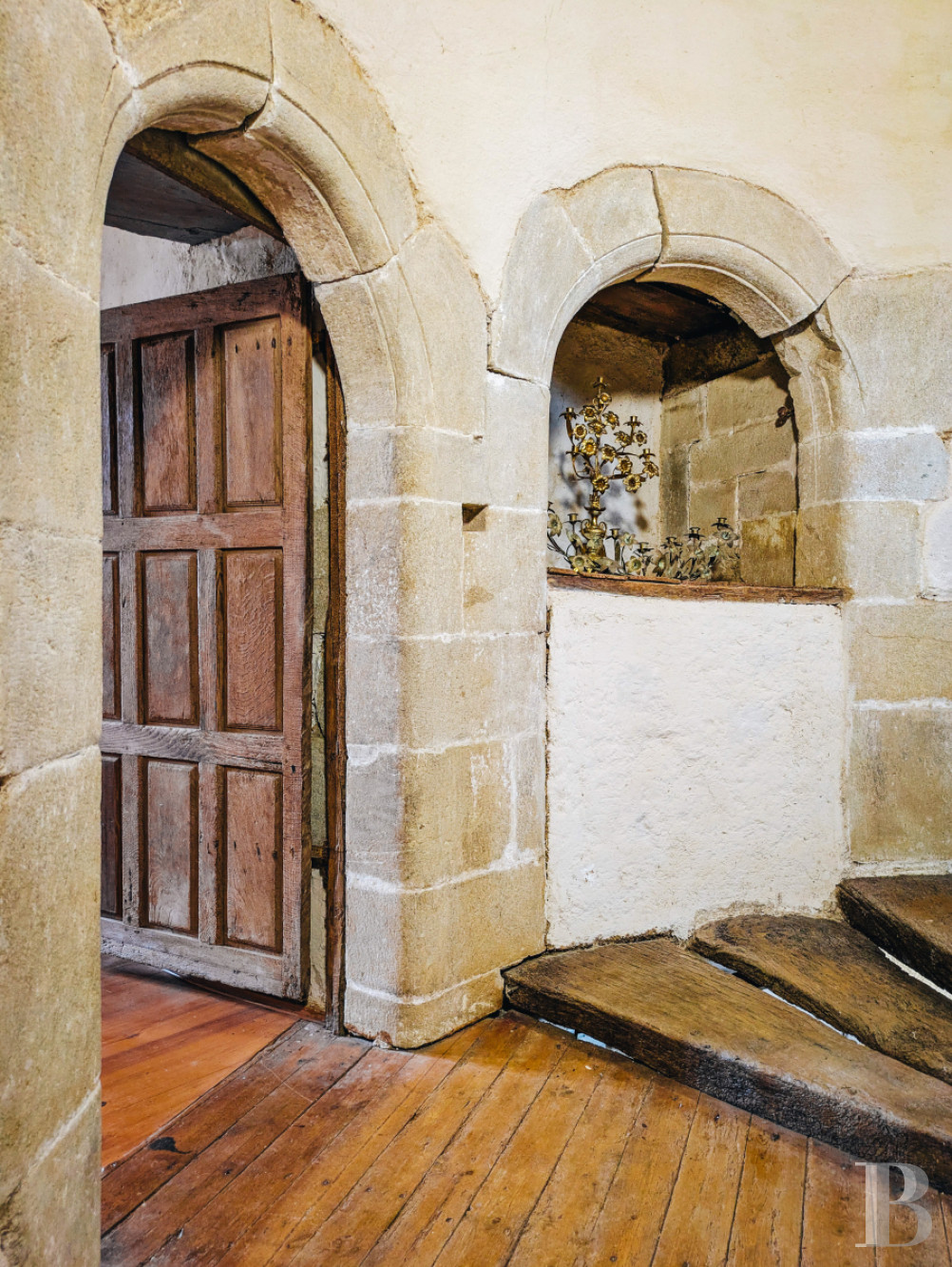 Le rez-de-chausséeLes murs de tout le niveau sont enduits à la chaux ou à pierre apparente, les sols sont parquetés ou pavés de tomettes en terre cuite. L'entrée principale accède à la salle basse centrale. Elle comprend un petit salon lumineux, où un ancien vaisselier en pierre est adossé à l'un des murs. La pièce voisine une salle d'eau, des toilettes et un espace de rangement. En enfilade, vers l'ouest, la deuxième salle basse est aménagée en salle à manger. Elle se prolonge par une cuisine ouverte moderne, qui fait face à une cheminée en granite. L'espace est éclairé par une haute porte-fenêtre et son imposte vitrée ainsi que par une lucarne au sud et une autre porte-fenêtre au nord. Le plafond cathédrale laisse apparaître des fermes de charpente et les fondations de la cheminée de l'étage supérieur du manoir, jamais terminée. À l'est, la troisième salle basse sert de salon, avec une cheminée blasonnée en granite. La hauteur sous plafond est importante et les poutres sont apparentes. Un percement dans le mur nord mène à une chambre.