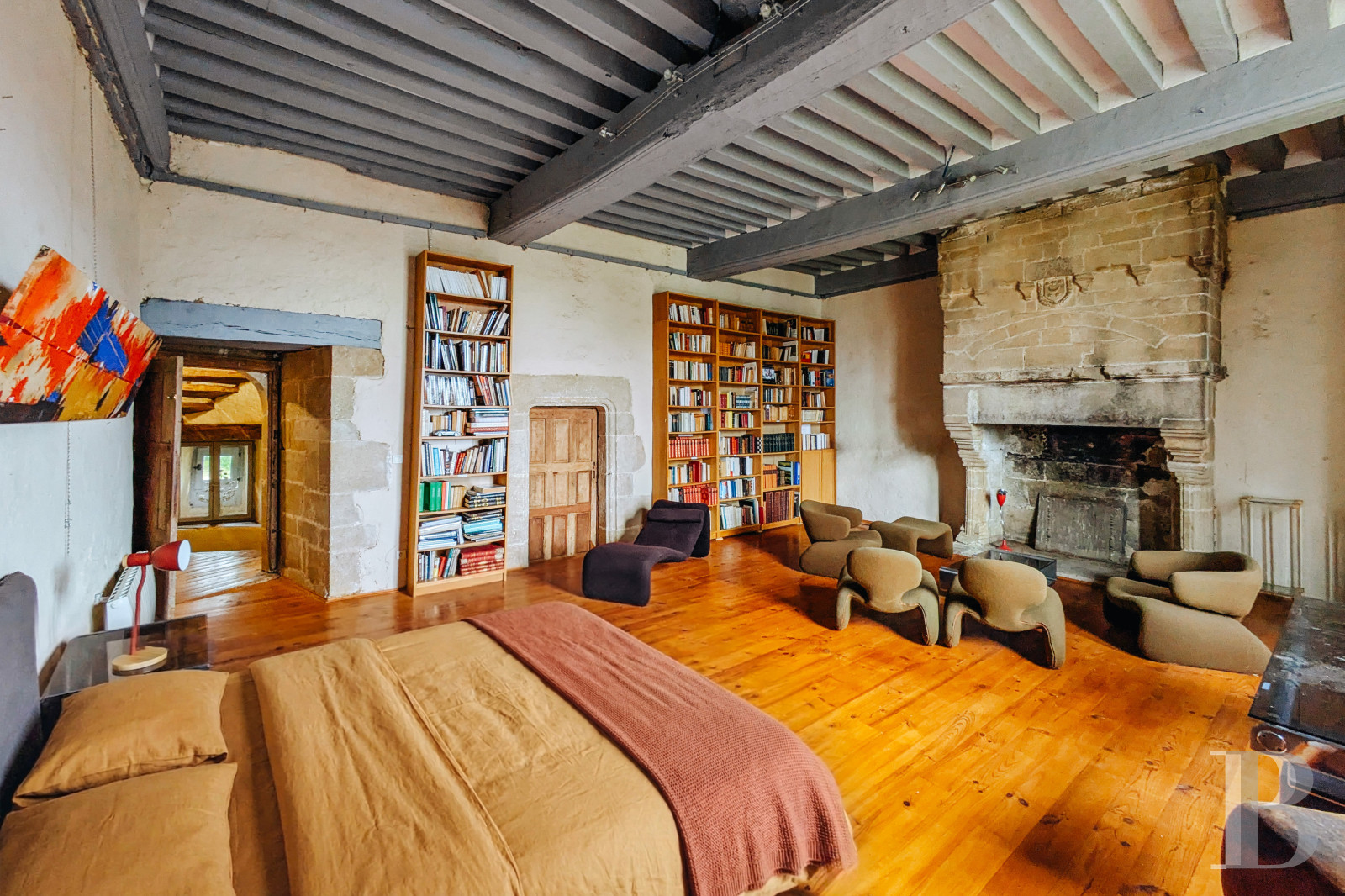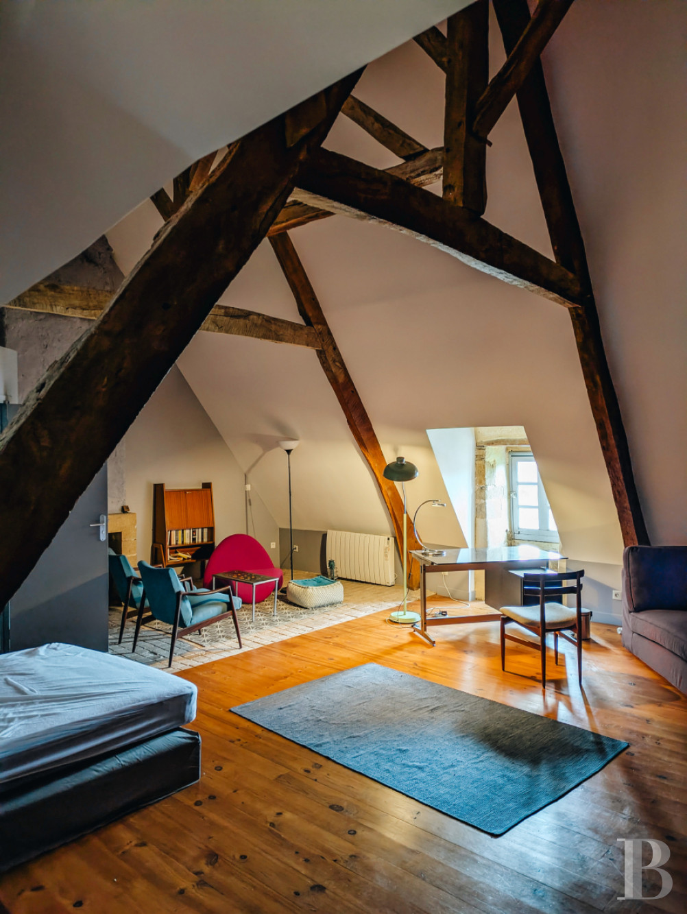 Il comprend une chambre au plafond cathédrale avec charpente apparente, éclairée par une lucarne de toit. Une cheminée de granite occupe l'un des murs et les sols sont parquetés ou dallés de tomettes. La pièce jouxte une salle de douche avec toilettes.