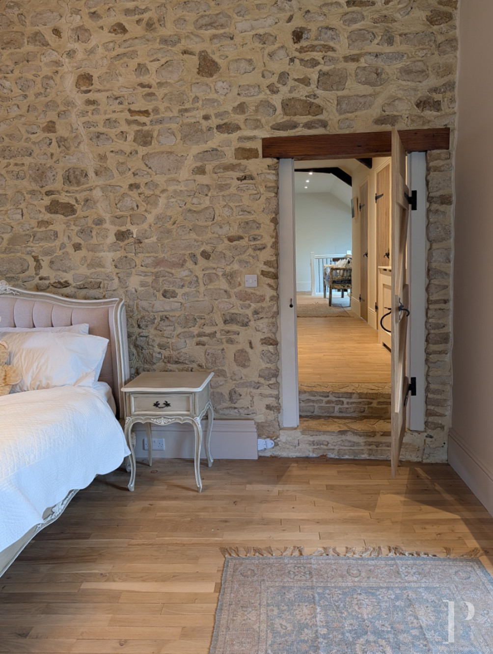 Au bout du corridor, se trouve la chambre principale, au sol parqueté, aux murs de pierres jointoyées et à la charpente peinte, jusqu'au faitage. Elle possède sa propre salle de bain avec large douche et baignoire à pattes de lion. Sa porte-fenêtre en pignon donne accès au balcon avec vue imprenable sur la campagne.