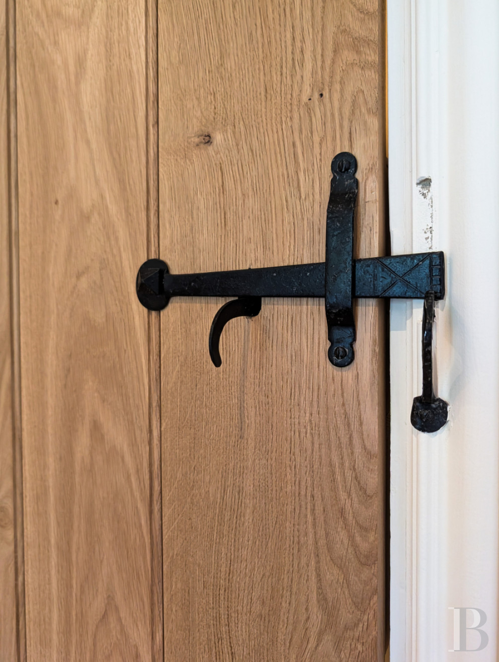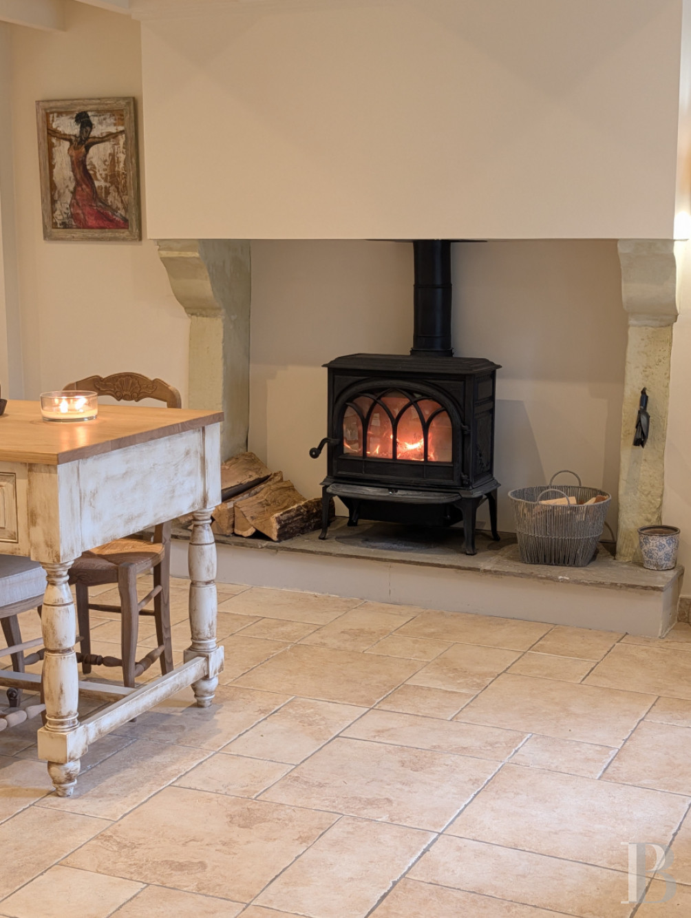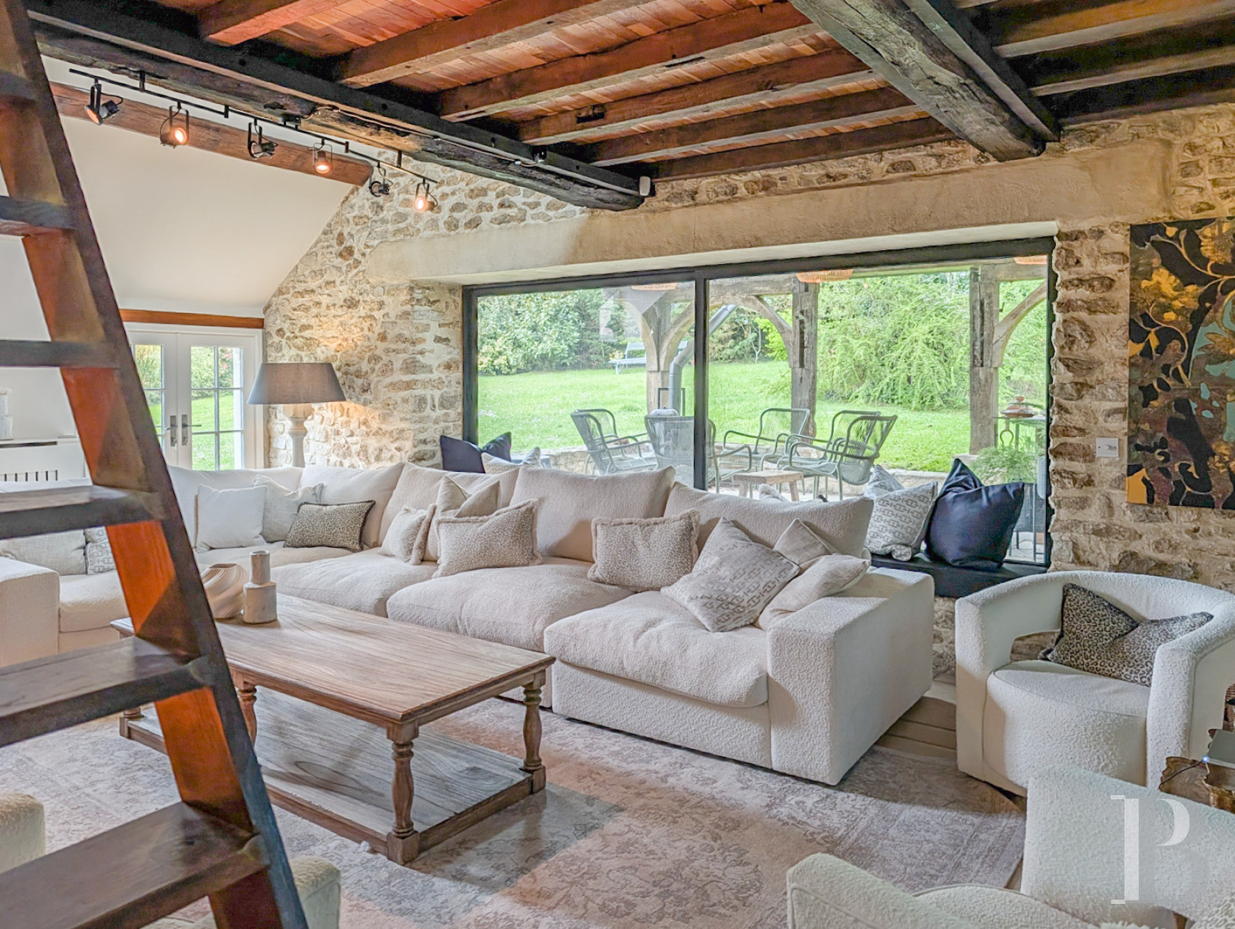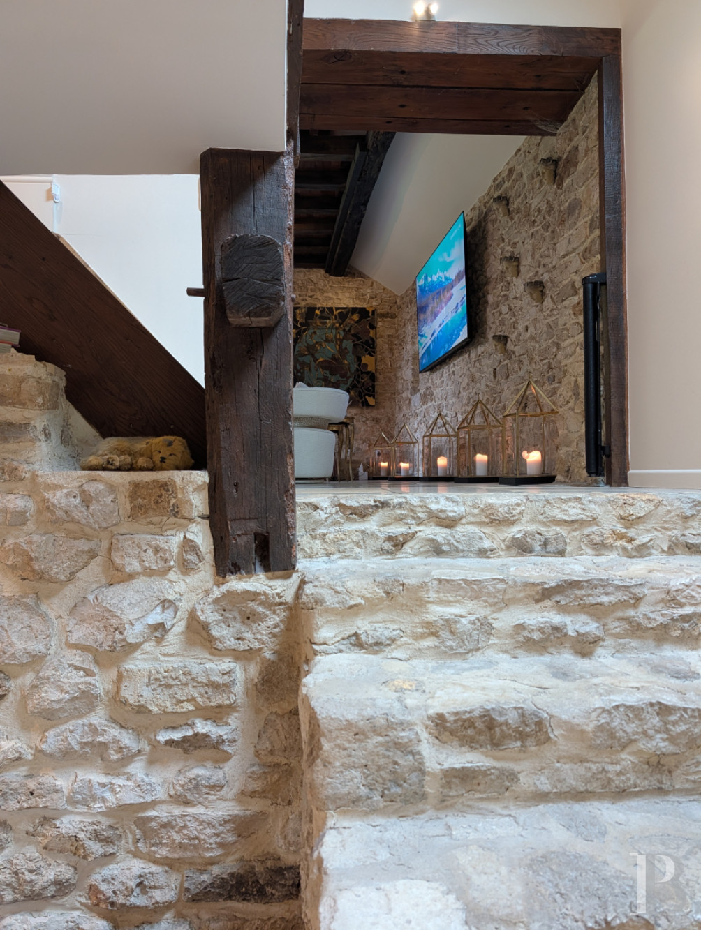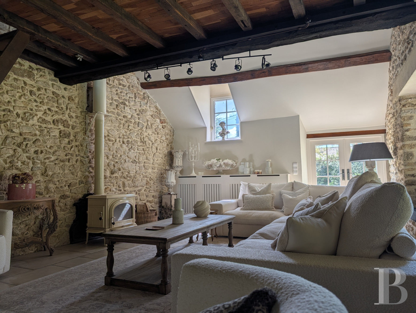 Depuis le salon, une volée de marches en pierre rejoint d'un côté un demi-niveau aux murs de moellons jointoyés où a été aménagé un second salon. Il ouvre par de larges baies coulissantes sur la terrasse dallée, à la couverture campée sur de remarquables encorbellements provenant d'un pont médiéval démantelé. Un poêle à bois en fonte, nouvellement installé, permet de profiter des flambées tandis que tous les radiateurs sont masqués par un habillage sur mesure. Une mezzanine à l'escalier de bois et à la poutraison apparente surplombe la pièce.