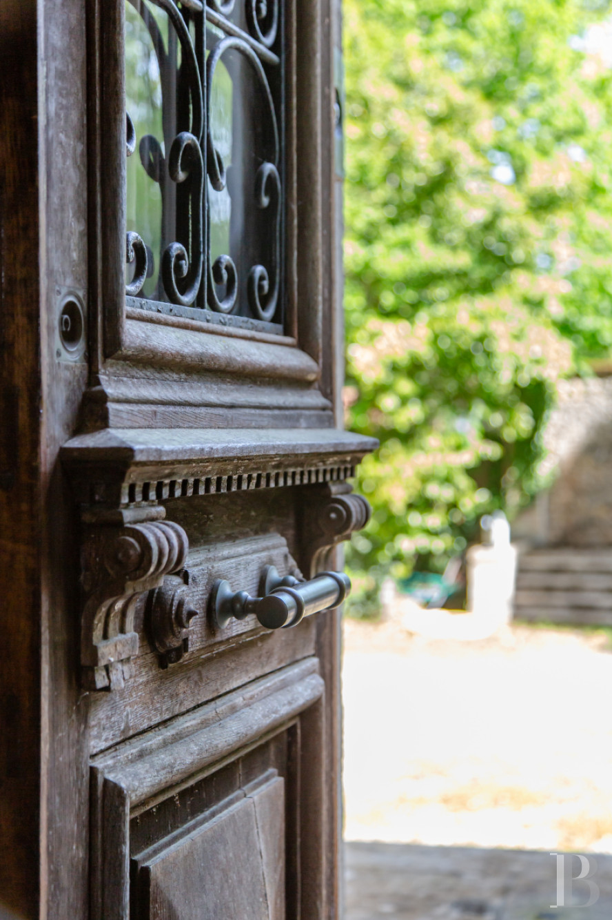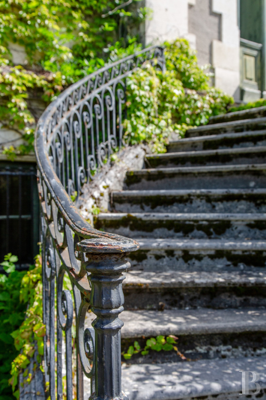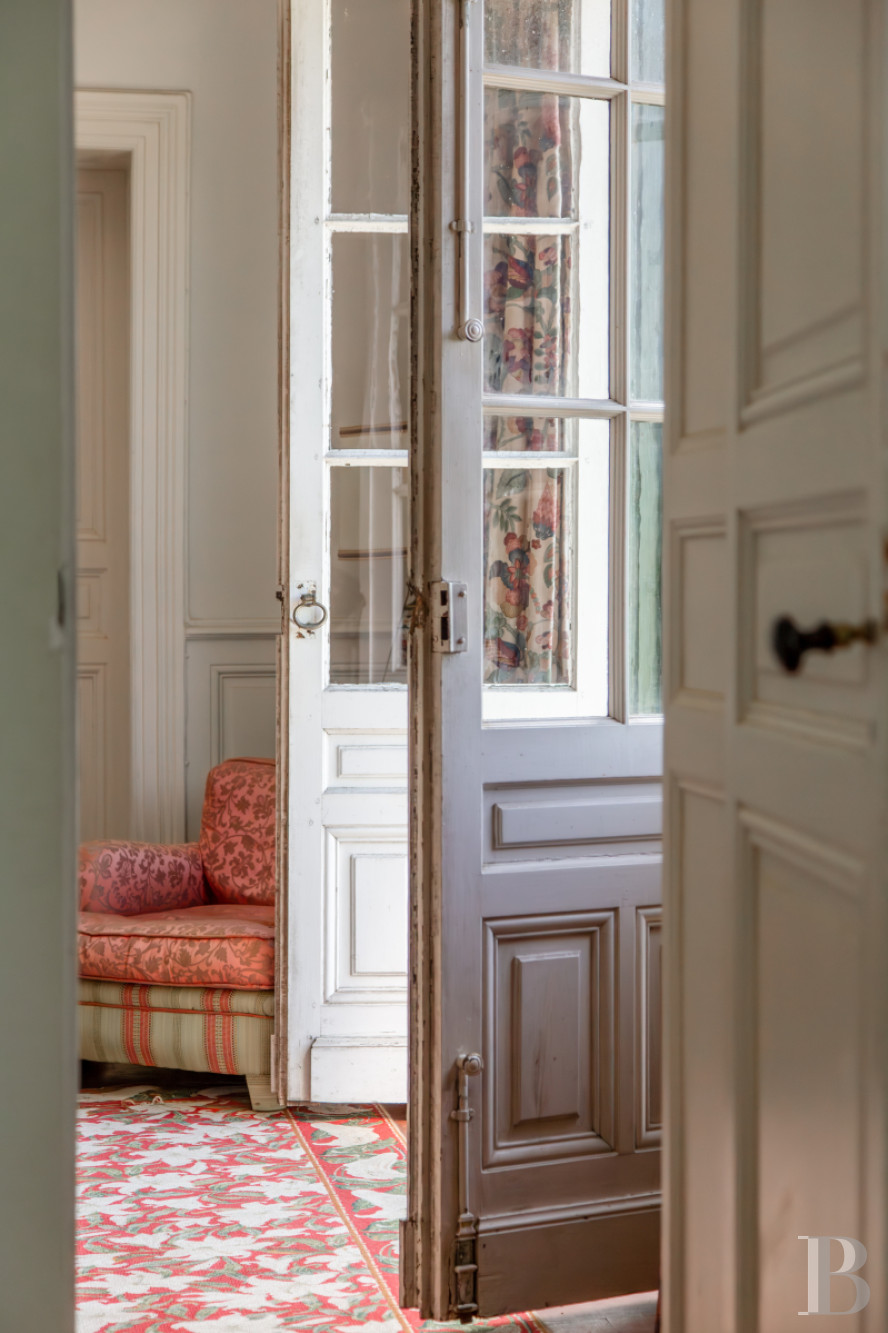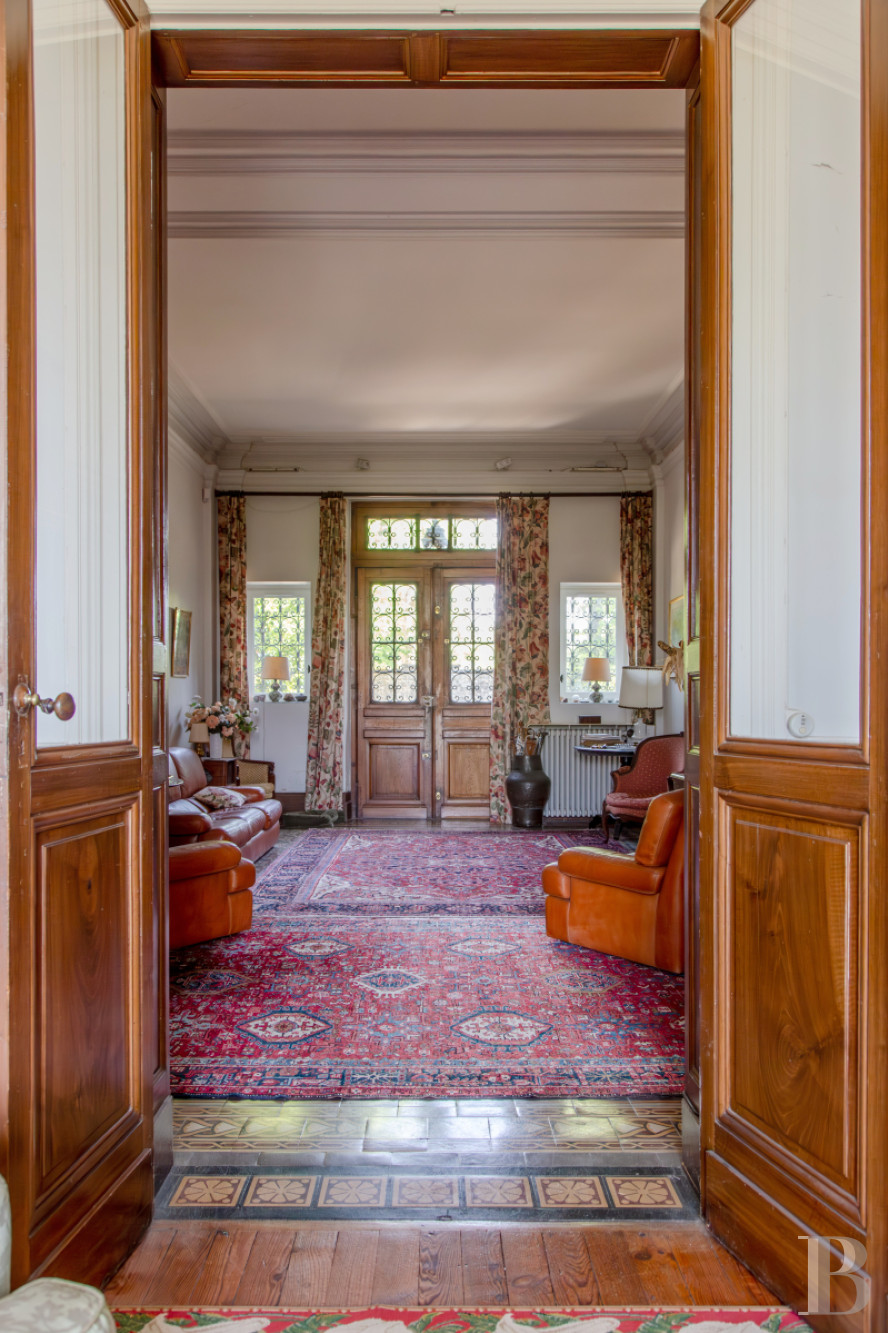 L’accès principal s’effectue au nord, par un perron en pierre de cinq marches. Une entrée est également possible au sud, où la façade est rythmée par des encadrements de pierre appareillée et des corniches sculptées. Une rampe en fer forgé, au dessin ajouré, accompagne le passage vers un petit salon. La porte d’entrée, en bois travaillé et ajouré, laisse pénétrer la lumière. Un vestibule, de près de 35 m², traverse la maison et distribue les pièces de réception : un salon-bibliothèque, un petit salon ouvert au sud, une salle à manger, une cuisine prolongée par une souillarde, ainsi qu’une chambre. Chacune des pièces conserve des éléments d’origine, parmi lesquels : cheminées, moulures ou parquets en chêne à lames droites. La hauteur sous plafond atteint environ 3,70 m. À l’ouest, une enfilade ajoutée ultérieurement facilite la circulation entre les principaux espaces de vie.Le premier étage