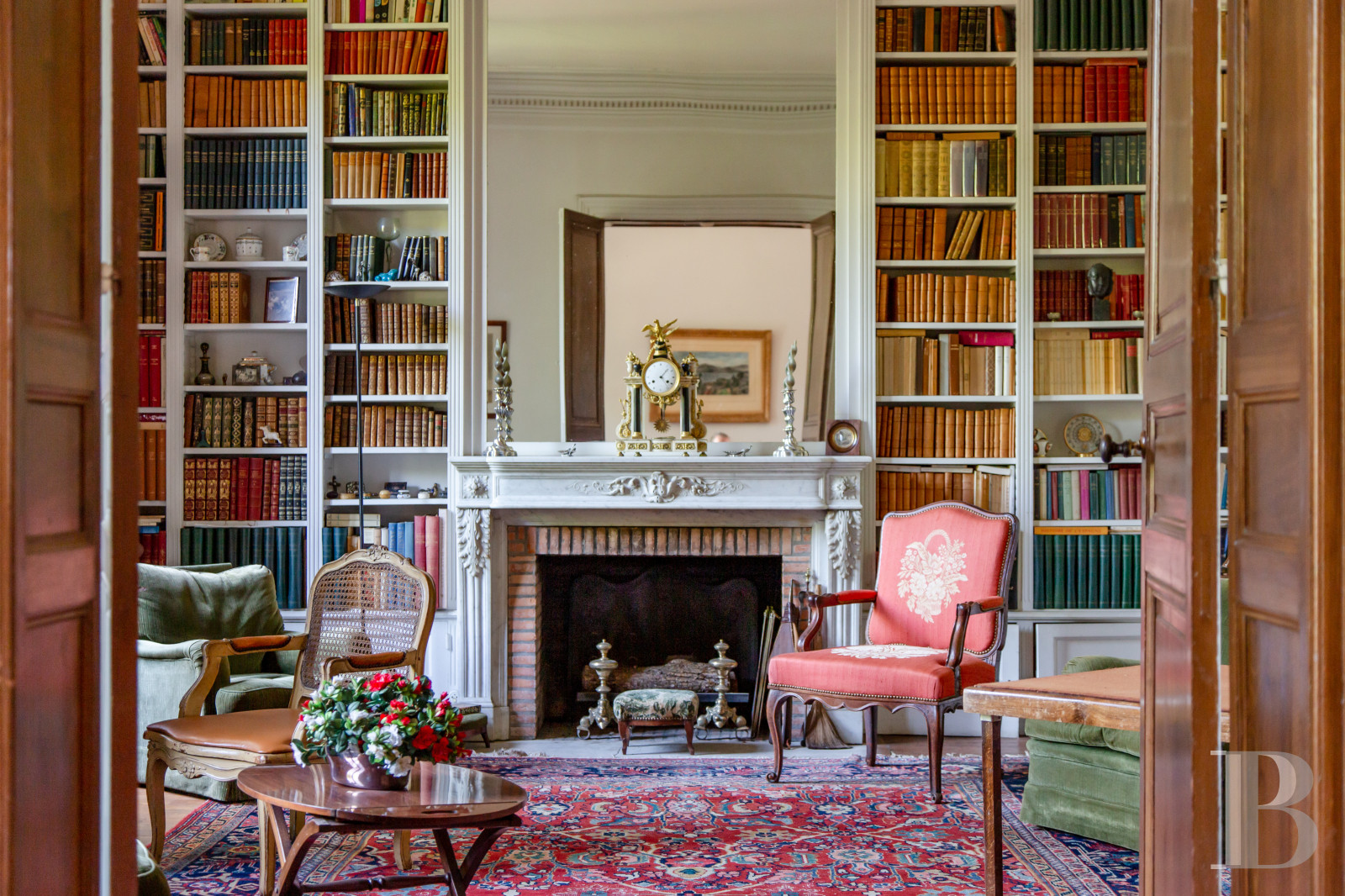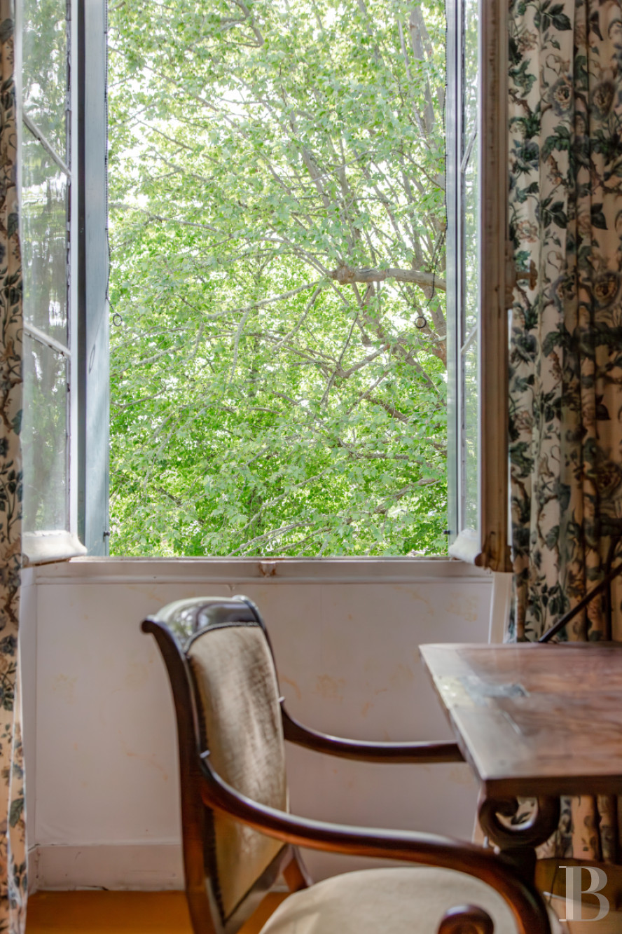 Un large escalier en pierre débouche sur un palier qui dessert cinq chambres. La hauteur sous plafond, d’environ 3,30 m, et les sols en pitchpin à lames droites participent à l’unité de l’ensemble. Chaque chambre, avec double exposition, est associée à une salle d’eau et à une cheminée. Un vaste dégagement central dissimule un escalier en chêne qui conduit au niveau supérieur.Les combles