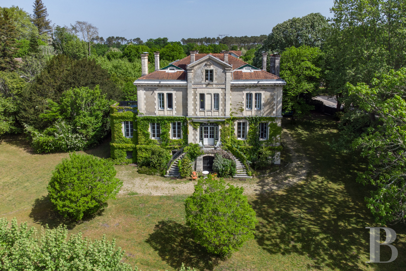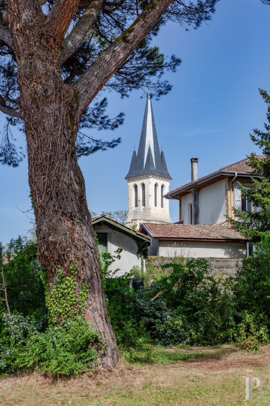 Une propriété habitée, dans tous les sens du terme, entre mémoire et nature. Plus qu’un témoin historique, la maison évoque un livre ancien aux pages de pierre et de végétation. Sa façade, héritée de l’architecture bourgeoise landaise, affirme une présence discrète tandis que le murmure des feuilles en prolonge la poésie. Elle exprime moins une recherche d’apparat qu’une volonté d’ancrage profond dans un territoire forestier en mutation. Malgré les marques du temps, elle conserve une majesté tranquille, presque solennelle.