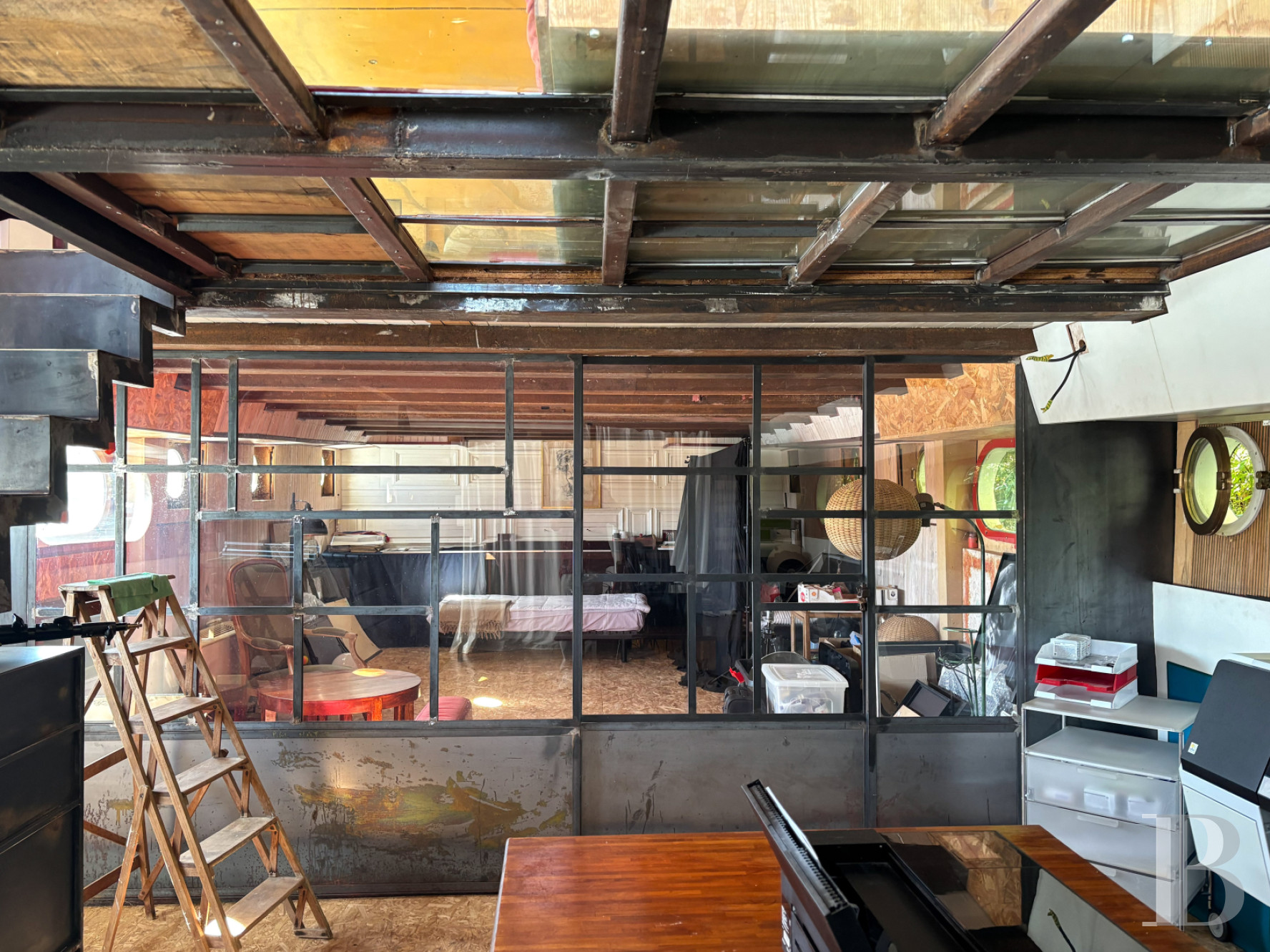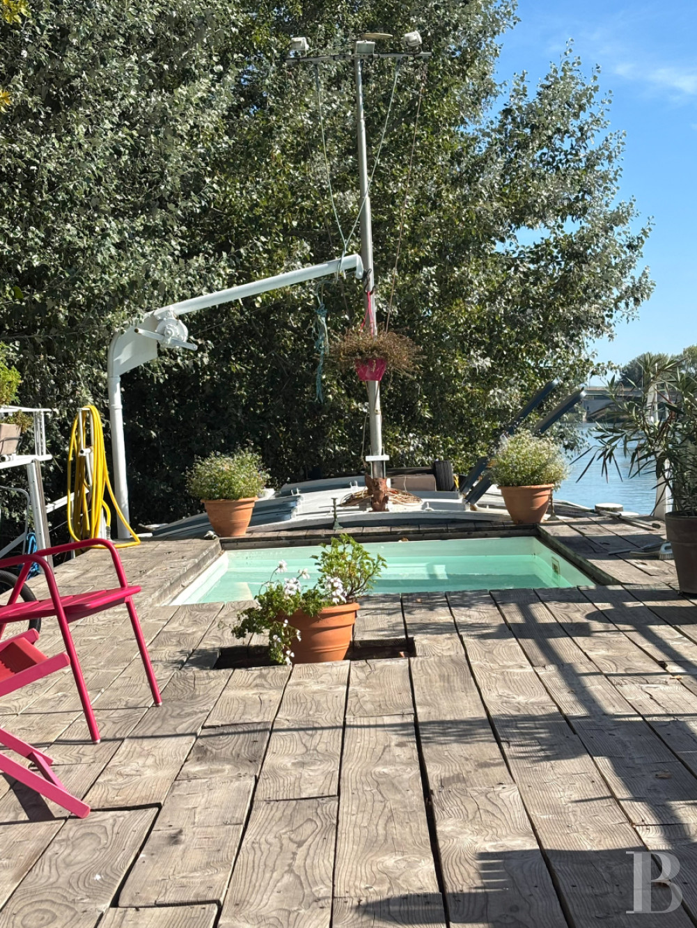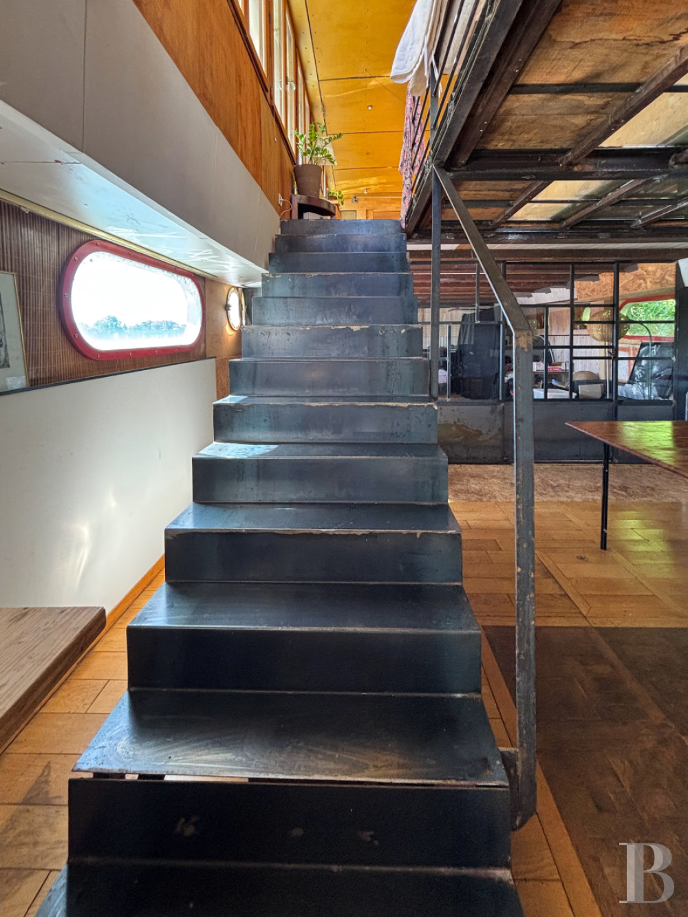 An ample staircase descends to the lower deck which was formerly the hold but is today an approximately 60-m² artist’s studio, standing between the water’s reflection to port and the green riverbanks to starboard. Four cabins with en suite shower rooms can be reached via an interior corridor into which light streams through portholes. Beneath a painted metal ceiling, there are wooden floorboards. The portholes, windows and patio doors are double glazed. The boat is approved as ‘water-worthy’ according to its up-to-date compulsory technical assessment. Its engine is in fine condition and it possesses all the required gear and tackle.