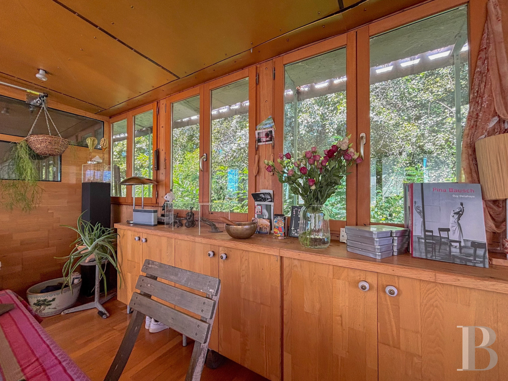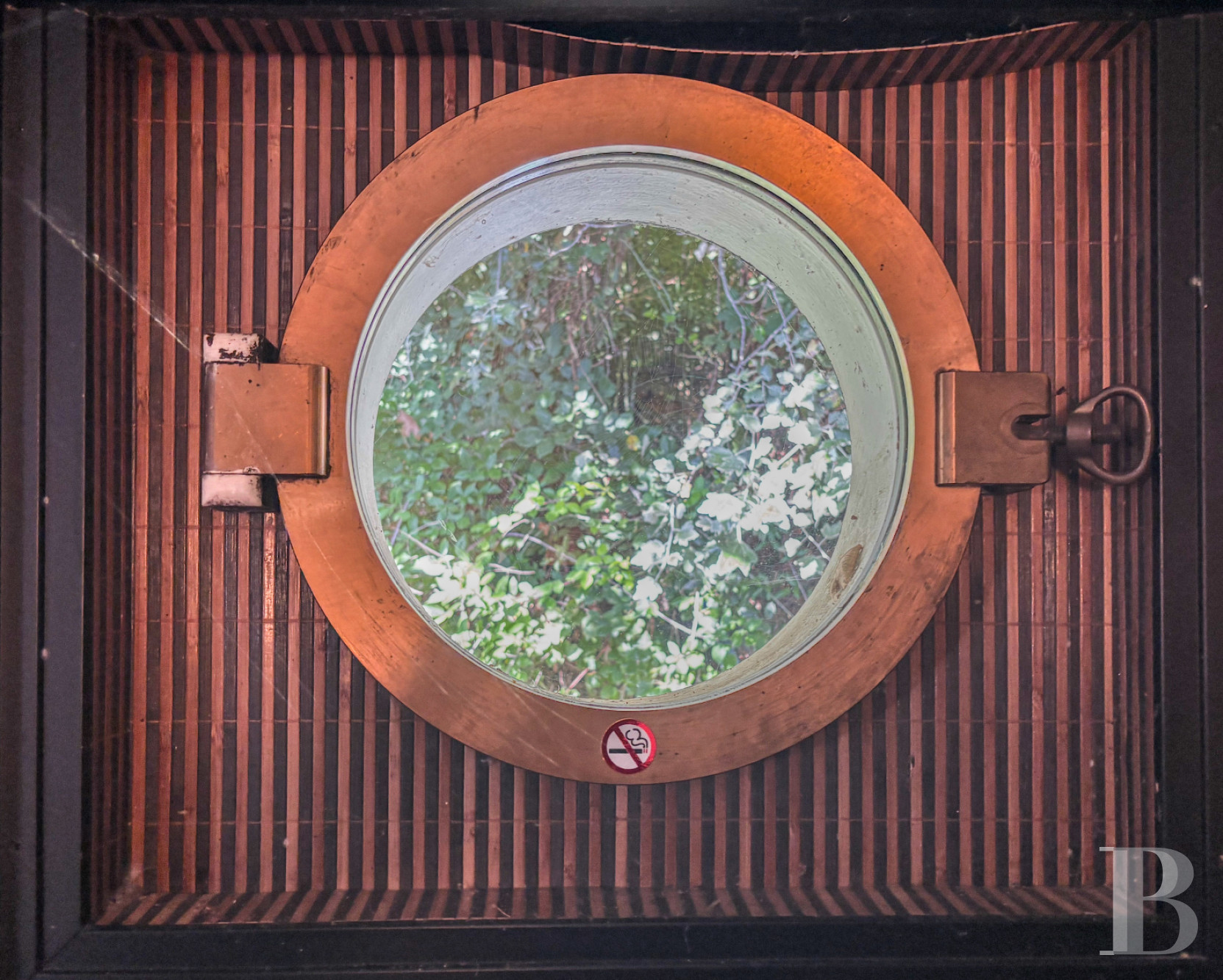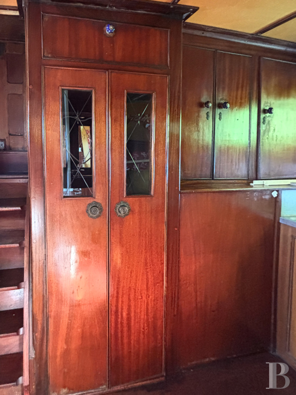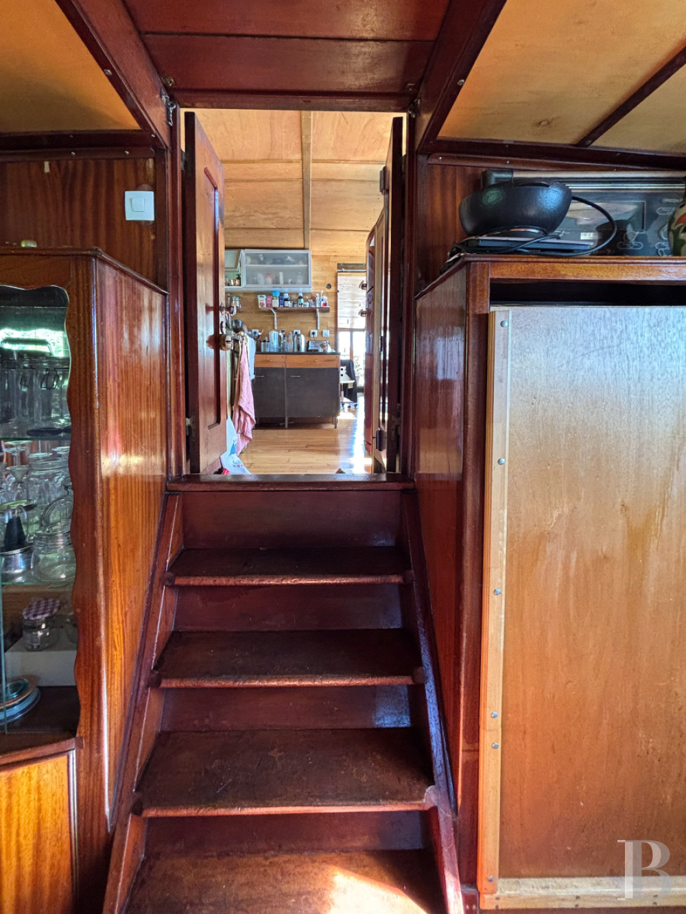 The upper deck is comprised of a teak-deck platform with a small swimming pool, above a forecastle transformed into living space, linked to the rear quarters and the wheelhouse. The interior can be reached via three separate entrances: one at the bow leading to the upper and lower decks, another at the stern near the wheelhouse above the sailors’ quarters and the last through the glazed opening in the forecastle. The upper deck is separated into two parts: the wheelhouse, which still boasts mahogany woodwork, bevelled mirrors, plus1950s copper handles, and, at the front, a section converted in the 1980s into a vast and bright living room with a view of the river and city. The wood panelled walls and fairly generous ceiling height of more than 2 metres perpetuate the ambiance of the 1950s part. The kitchen, with an old cooker riveted to the floor as if refusing point blank to abandon ship, separates the forecastle from the quarter deck.