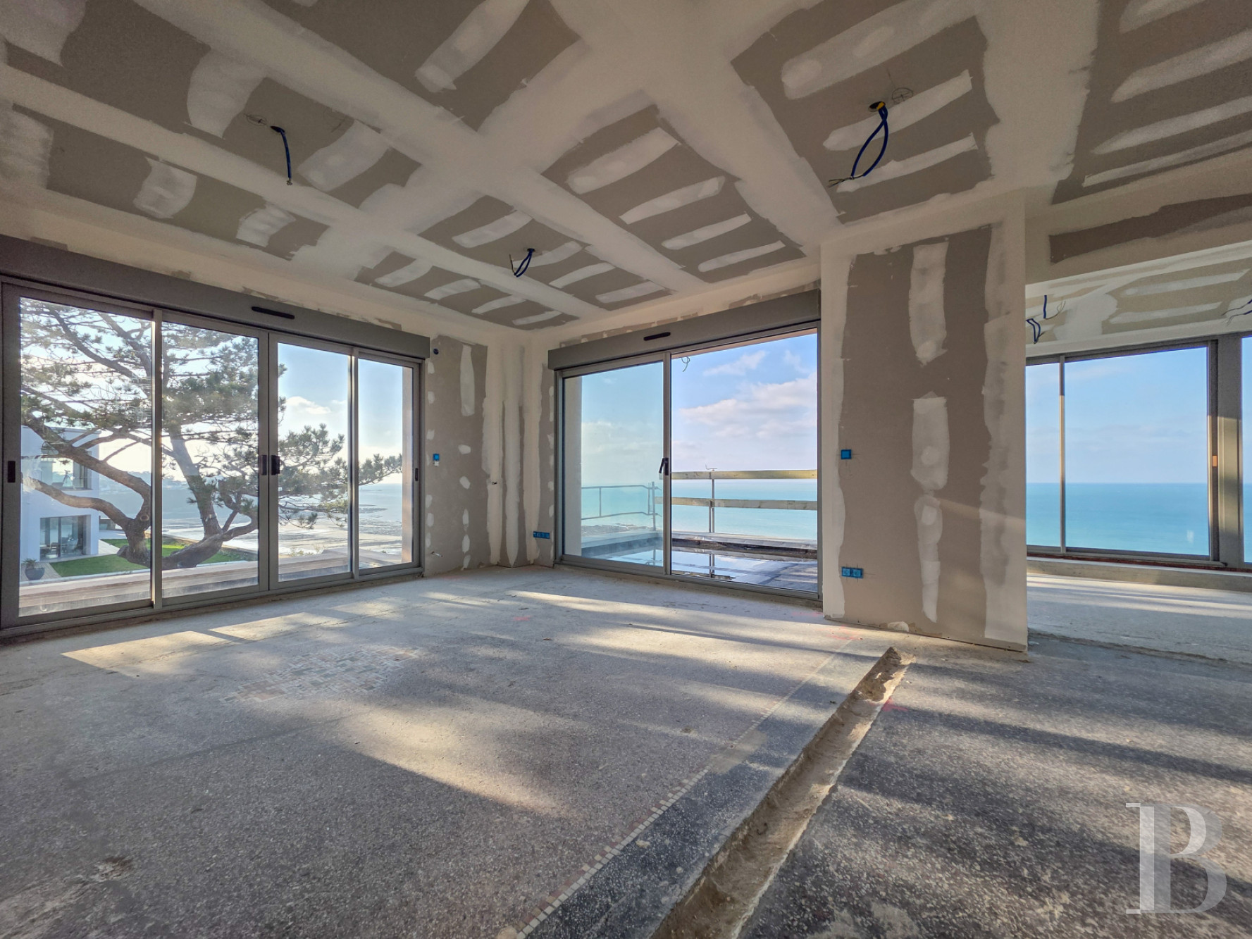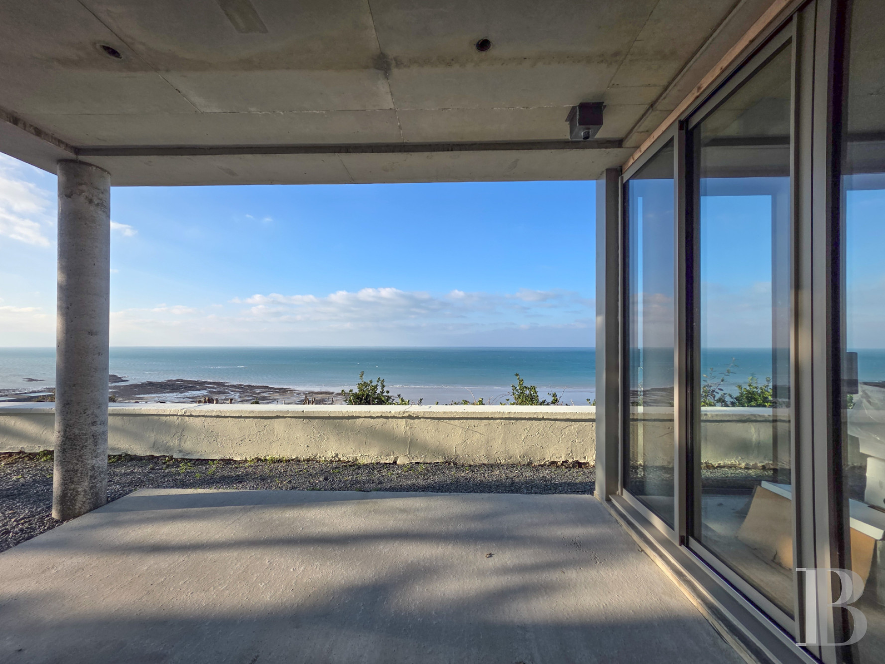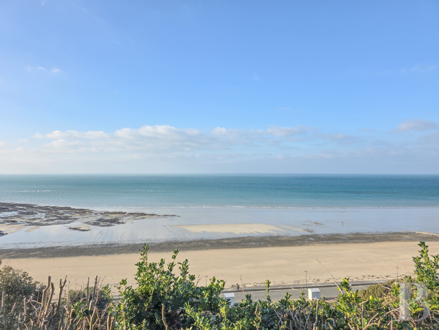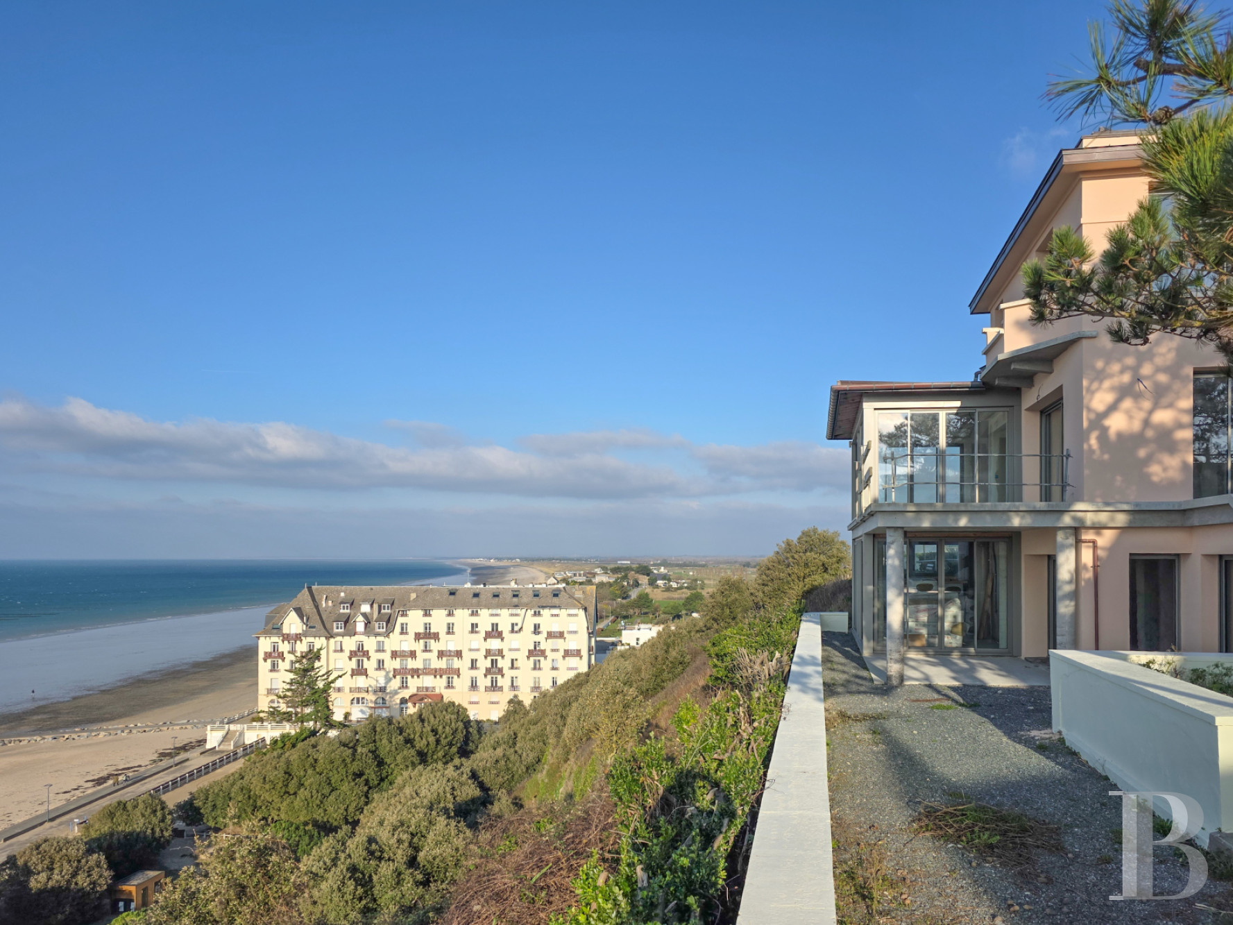Perched on the heights of Donville-les-Bains in Normandy, the villa faces the sea. It has an unobstructed 180-degree view from the Pointe du Roc in the south to the Pointe d'Agon in the north. The horizon stretches from Cancale to Jersey, with the Chausey Islands in the centre. The property is 3 hours from Paris, 1.5 hours from Rennes and 1 hour from Caen. Mont-Saint-Michel is close by, as are the long beaches of the Channel.