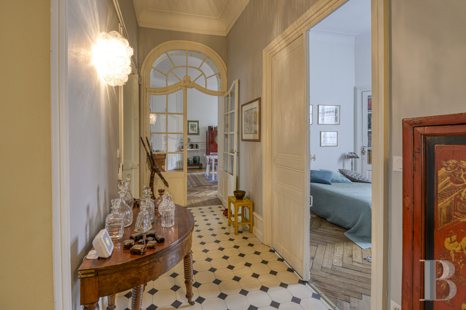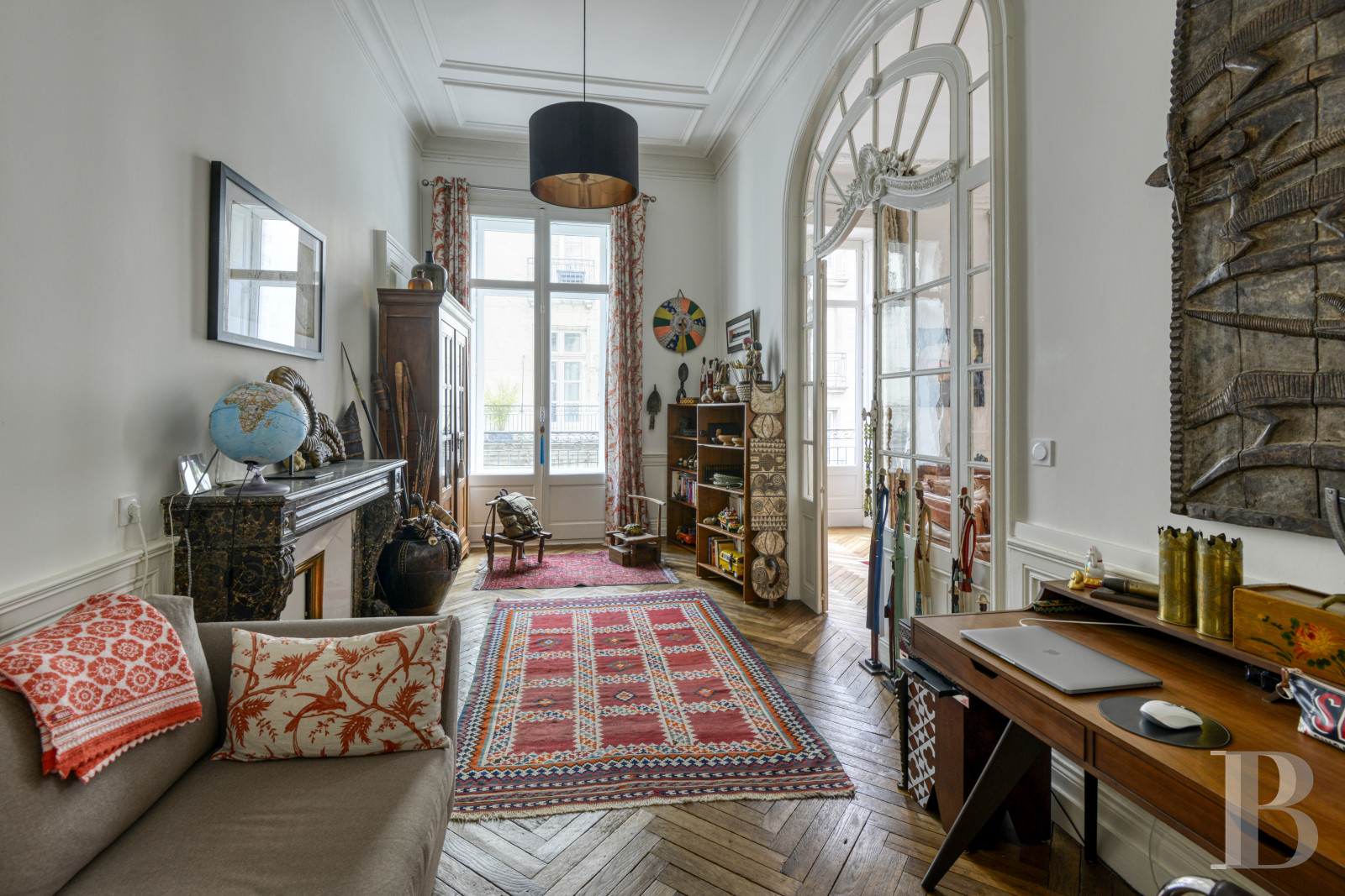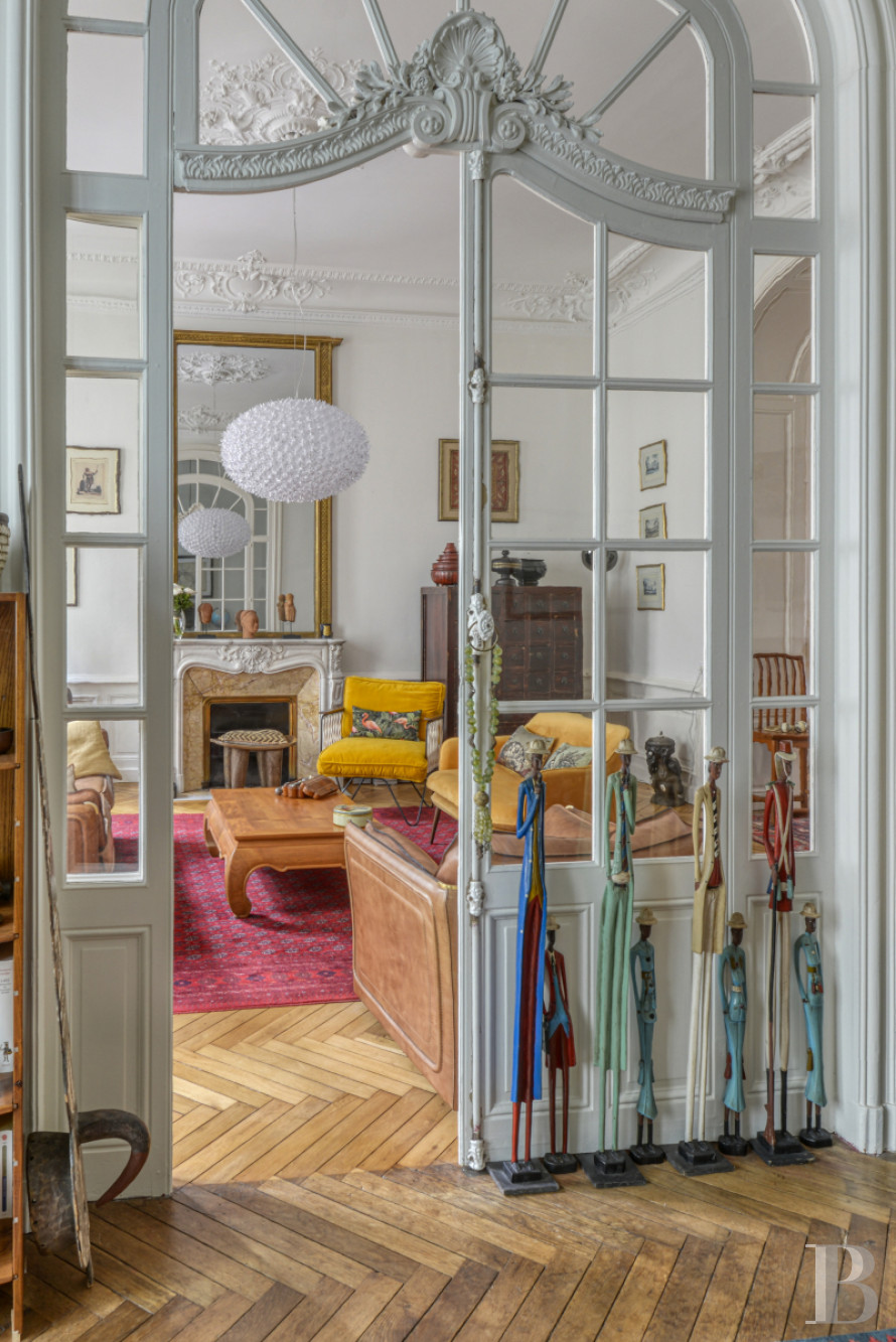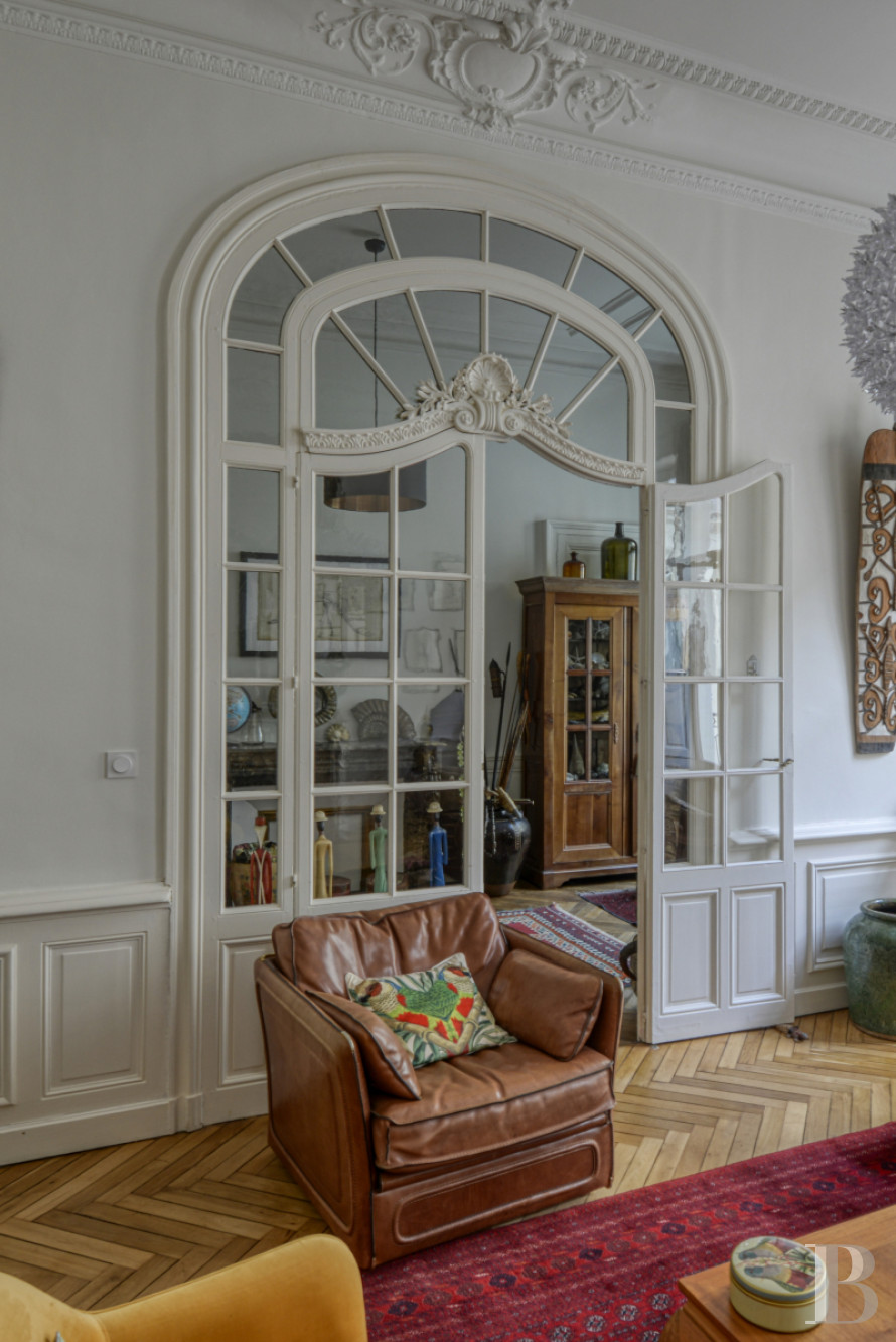 Access is via a staircase with stone steps that wind in regular flights around a wrought-iron balustrade with curved motifs. The walls are covered in deep blue painted panelling. The landing floor is tiled with cement tiles in a black and white geometric pattern. At the end of the entrance door, a corridor leads to a vast double reception room of over 60 m² with period features. The ceilings, around 3.90 m high, are decorated with mouldings enhanced by floral decorations and motifs in relief. The walls are highlighted with supporting panelling. A Louis XV-style fireplace in Carrara marble is set against one of the living room walls. The lintel is carved with a shell in the centre and rests on sheathed jambs. Large cupboards, also adorned with Louis XV mouldings, line the corners of the dining room. The interior glazed French windows are edged with arched arches highlighted by sculpted decoration. A 17 m² room, with a Napoleon III fireplace carved from sea-green marble and supported by sculpted lion paws, is currently used as an office. The floors are herringbone parquet in the main rooms, followed in the entrance hall and corridors by cement tiles with black cabochons. The long, independent kitchen of around 10 m² is fitted and equipped. The base and wall units are contemporary and in light wood. A large window illuminates the space. This is followed by two comfortable bedrooms of around 28 m² and 22 m², also covered with parquet flooring. One opens onto the courtyard, while the other overlooks the street through two high double-leaf windows extended by a balcony. The high ceilings are accentuated by an antique rose window. The light-coloured walls are punctuated by supporting panelling. A green marble fireplace is set against one of the walls. Nearby, a discreet door conceals a built-in storage area. The bedrooms share a shower room, where the uniform small square tiles in a sandy beige hue evoke the Putman style.